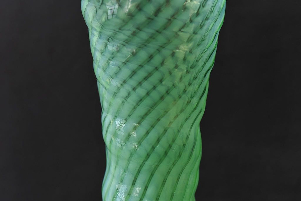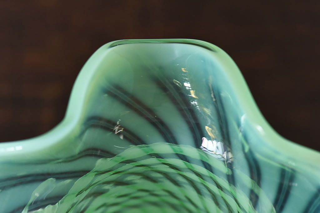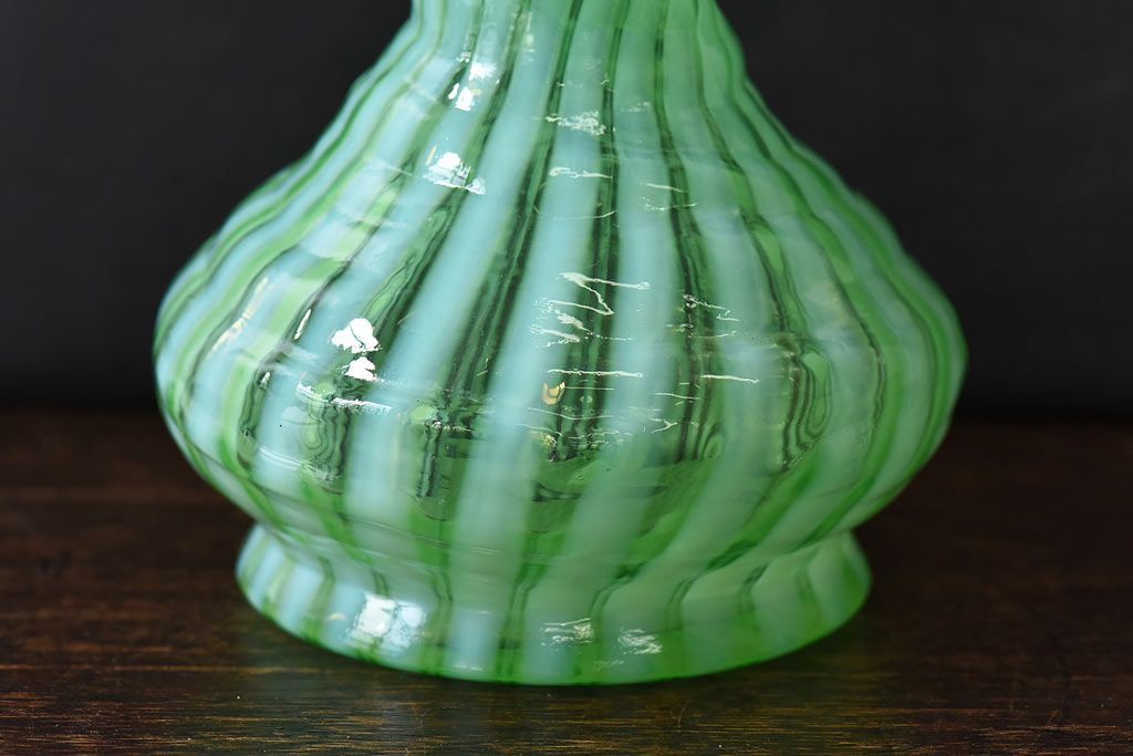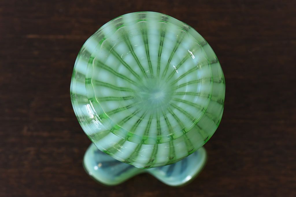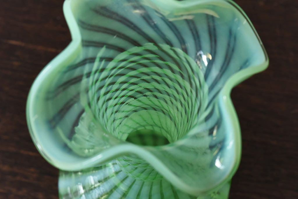 ラフジュ工房> 骨董・美術品> 骨董-ガラス食器 > アンティーク雑貨 アメリカ製 ワセリンガラス 口元のフリルがおしゃれなフラワーベース(花瓶、ウランガラス)