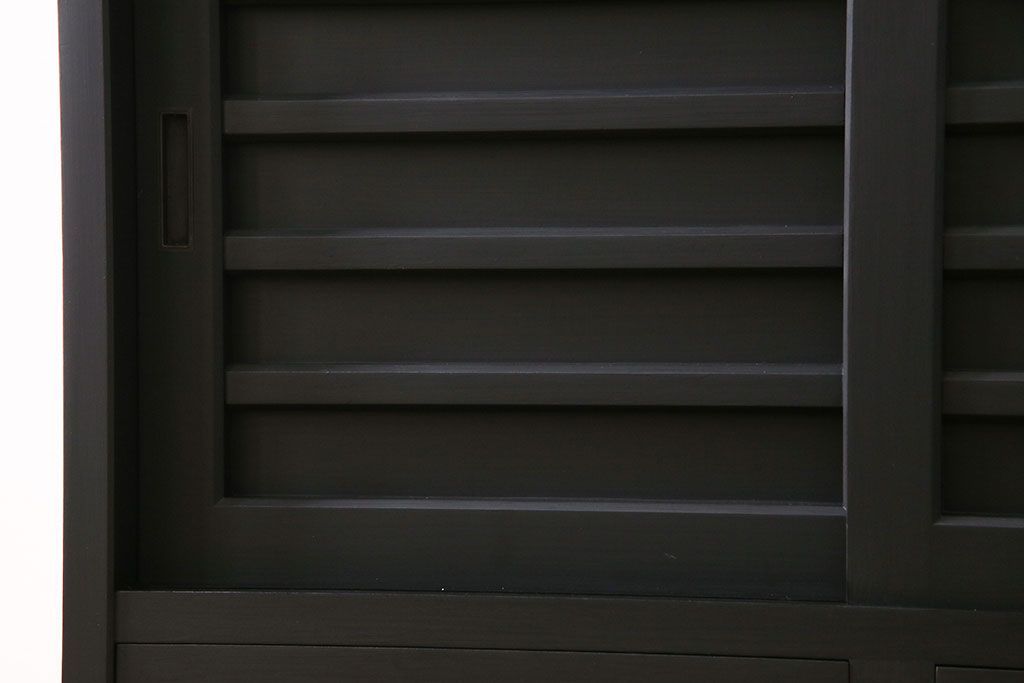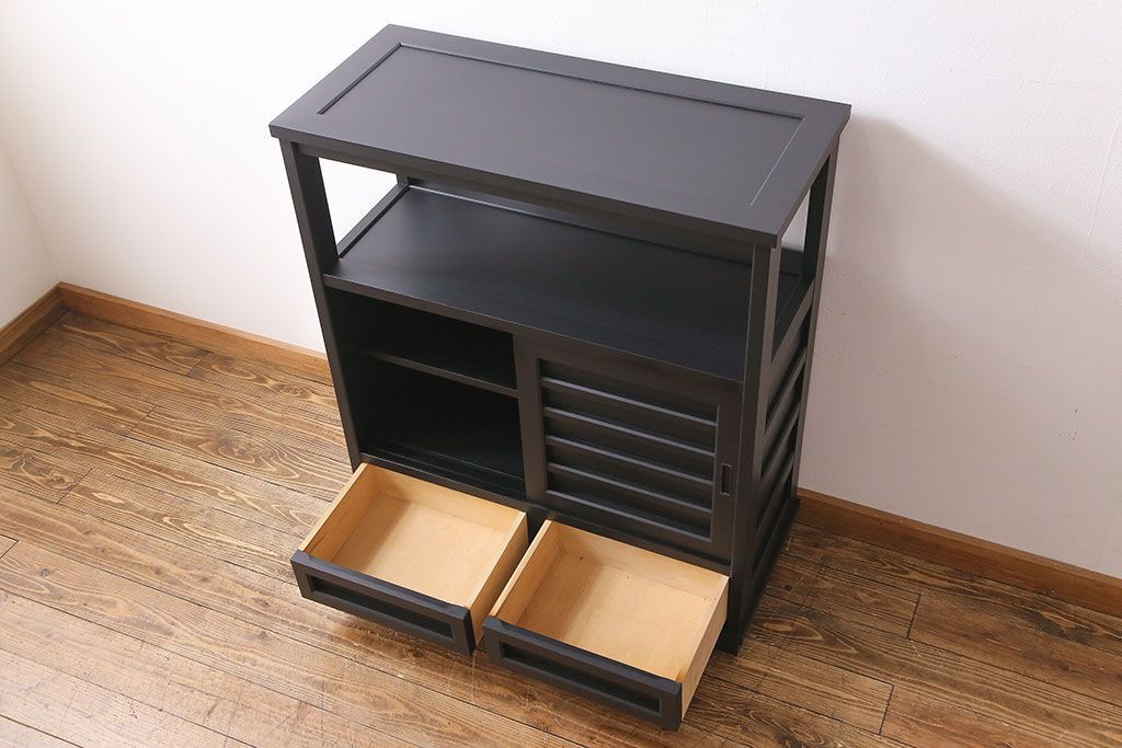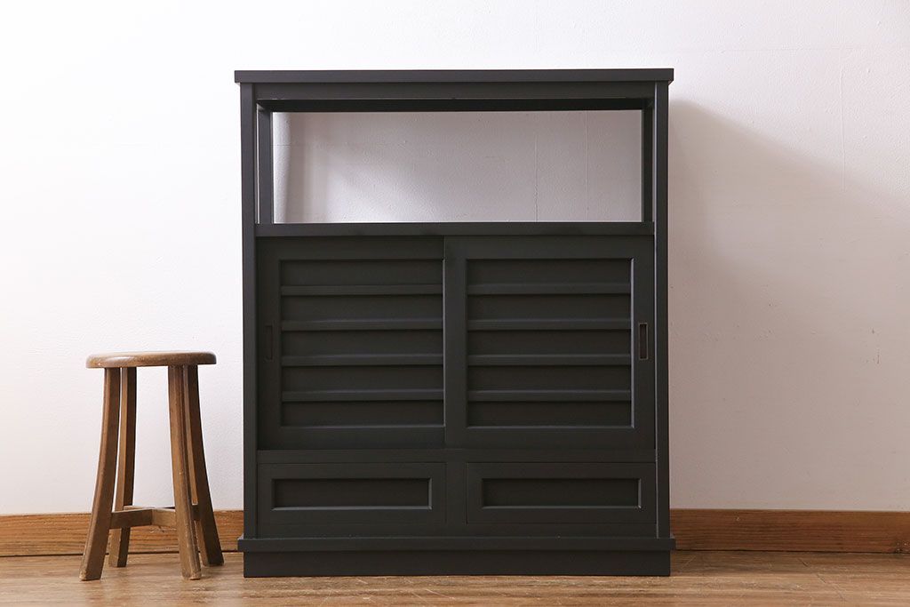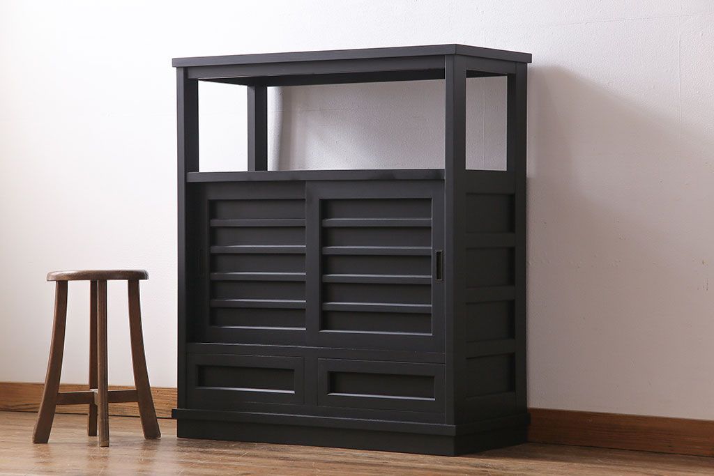 末永く使える作りの良さで人気の北海道民芸家具の茶箪笥です。当店でリペイントし、シックでモダンな雰囲気漂うお品となりました。飾り棚に戸棚、引き出しと3タイプの収納カ所があるのも嬉しいですね。ご自宅や店舗での大人な和の空間づくりにいかがでしょうか。