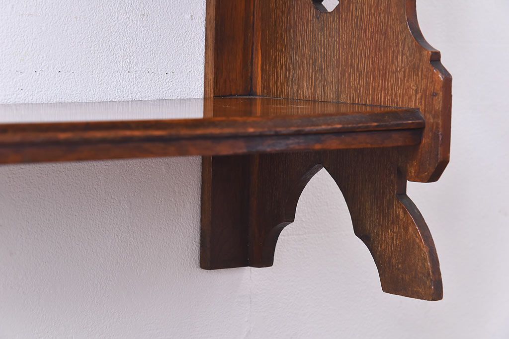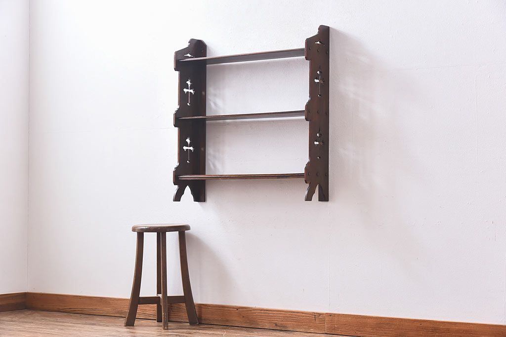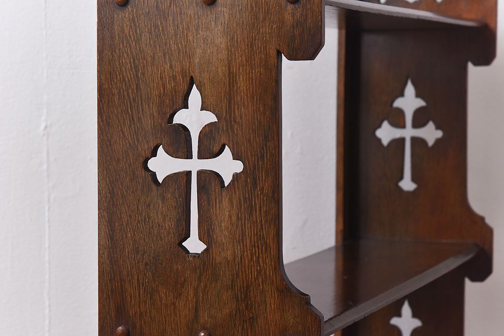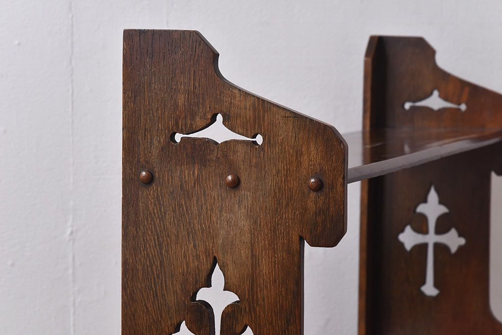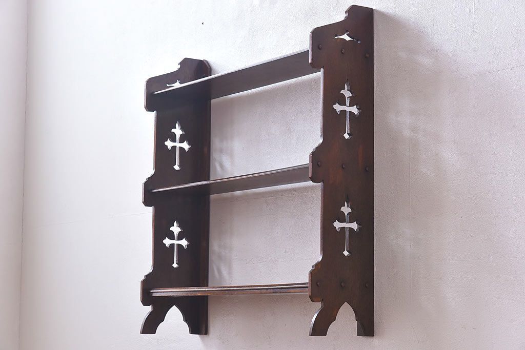 アンティーク家具 イギリスアンティーク 十字架の透かし彫りが美しいウォールラック(壁掛け飾り棚)