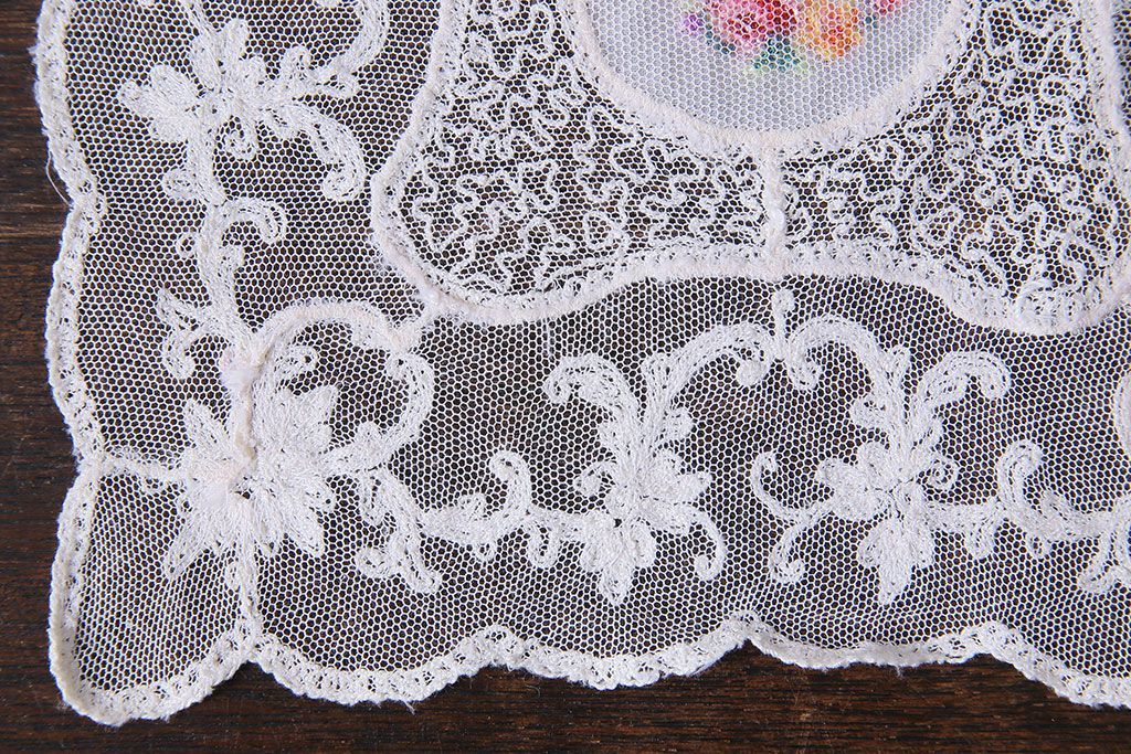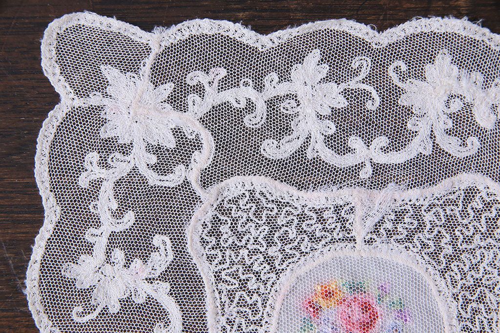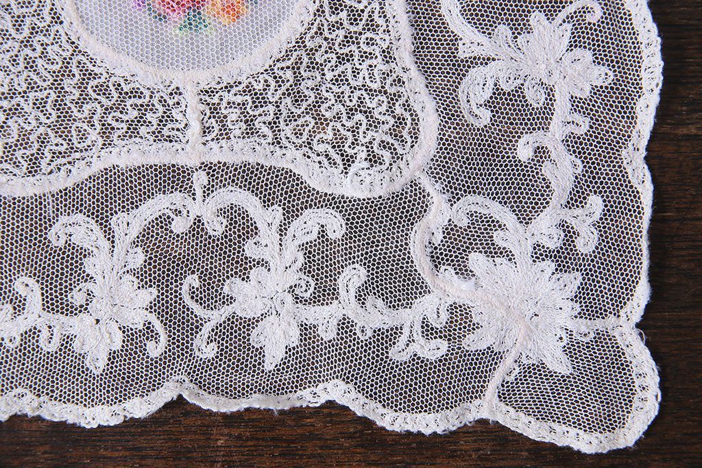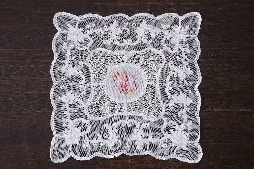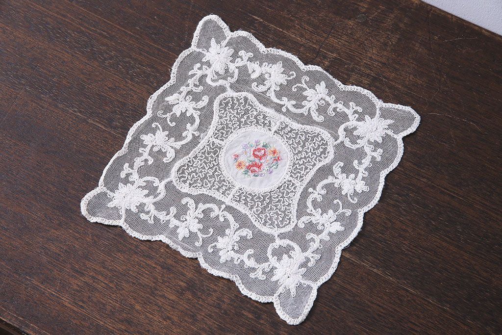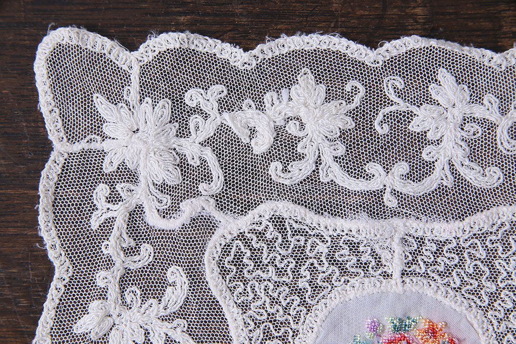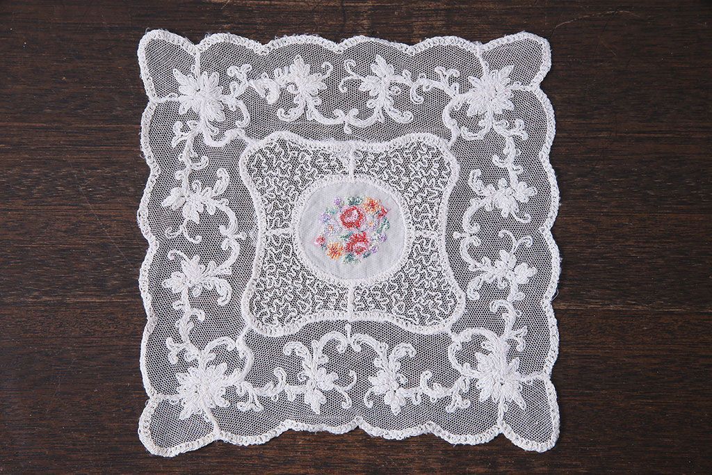 アンティーク雑貨 イギリスビンテージ カラフルな花のプチポワン刺繍が愛らしいドイリー(レース、クロス)(1)