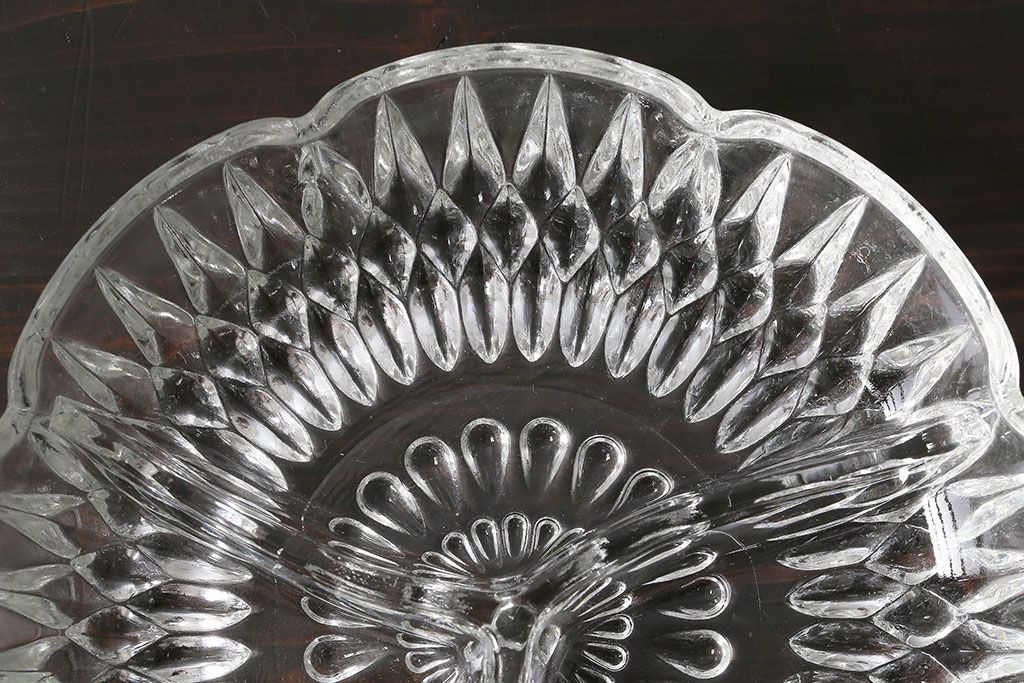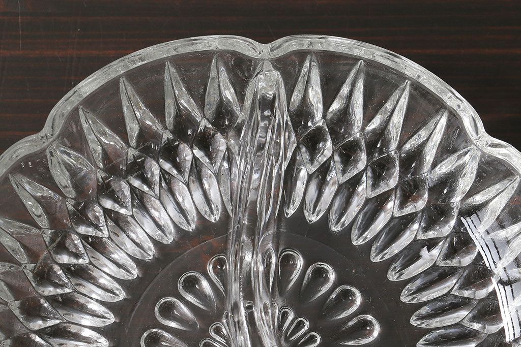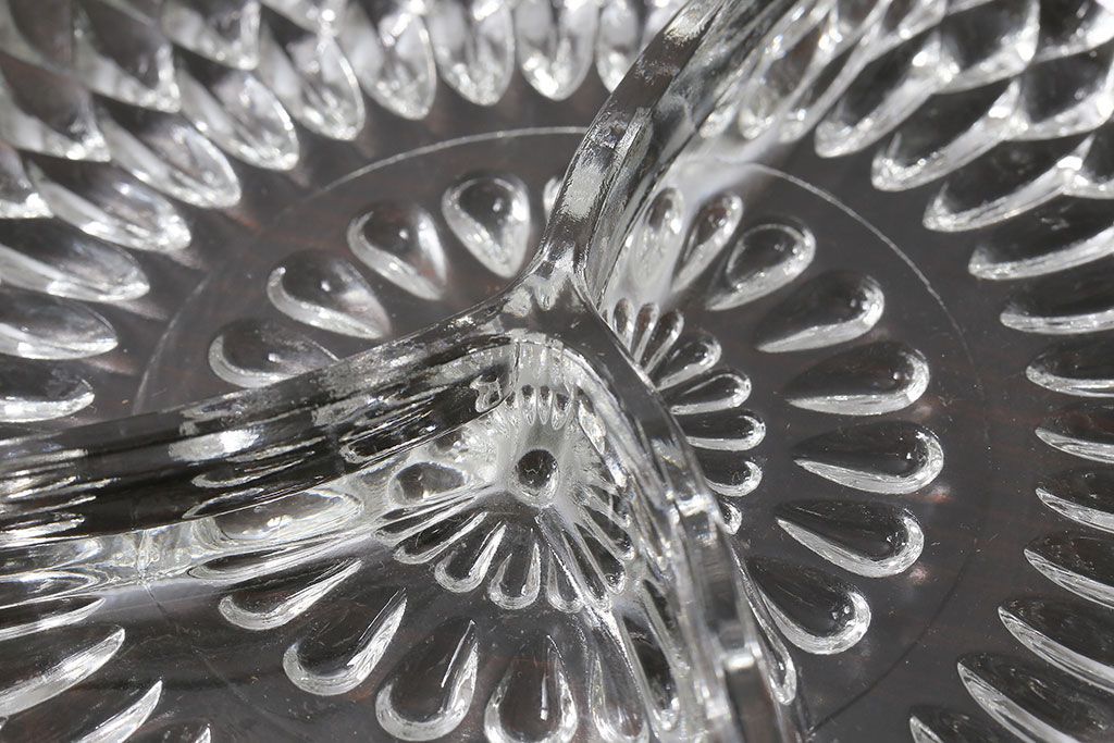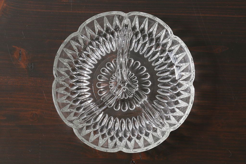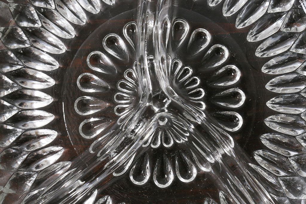 ラフジュ工房> 骨董・美術品> 骨董-ガラス食器 > アンティーク雑貨 イギリス製 仕切り付きのデザインが魅力のキャンディプレート(小皿、プレスガラス)
