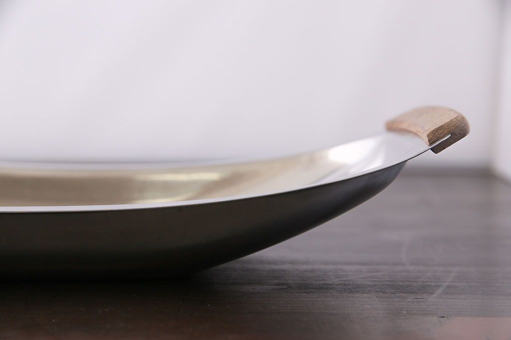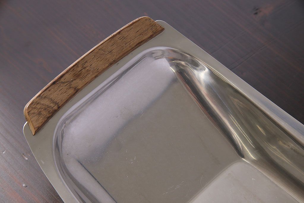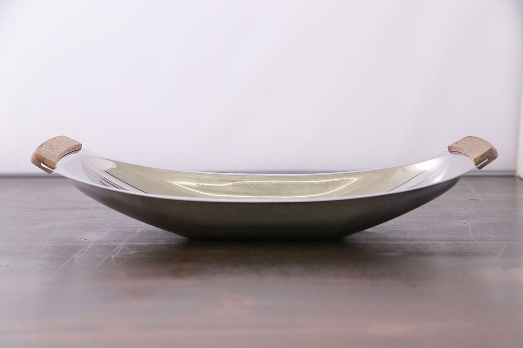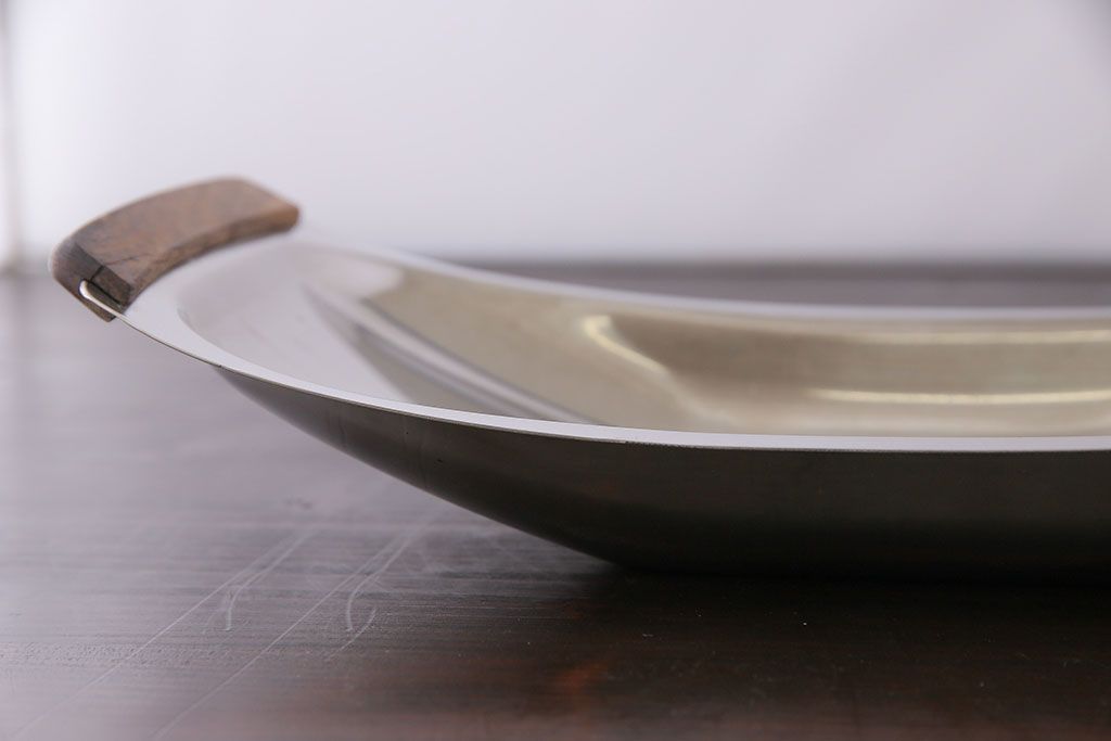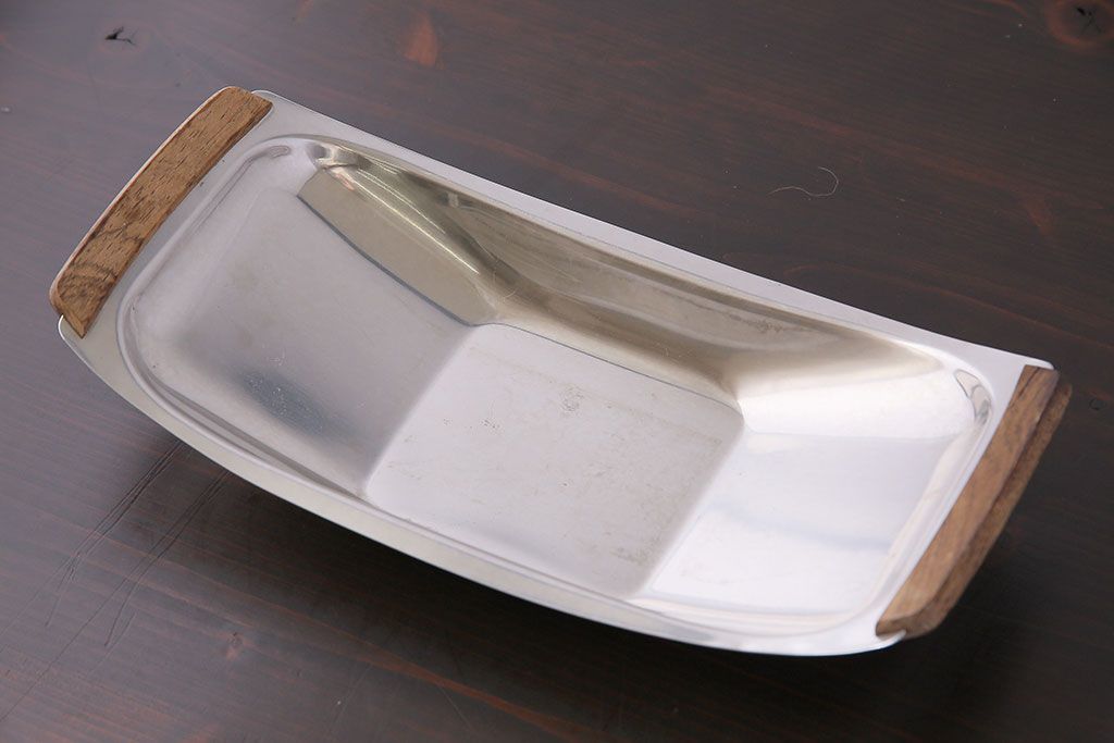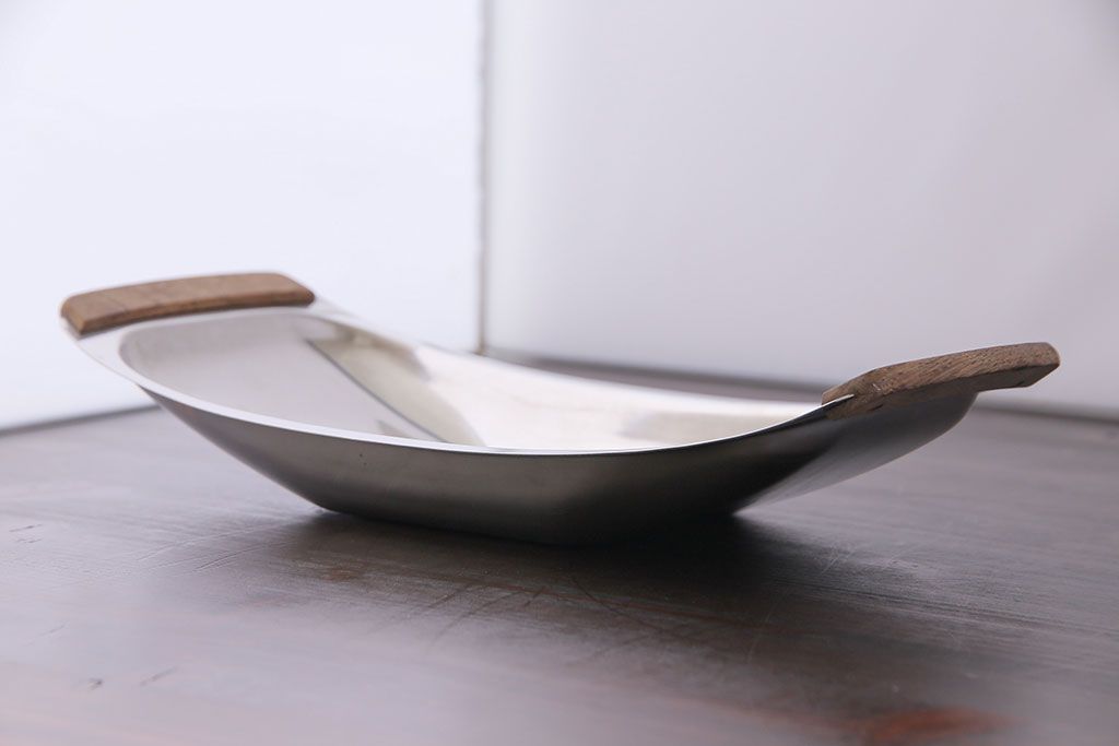 アンティーク雑貨 イギリスビンテージ 木製取っ手付き 舟形のデザインが魅力のステンレストレー(お盆)
