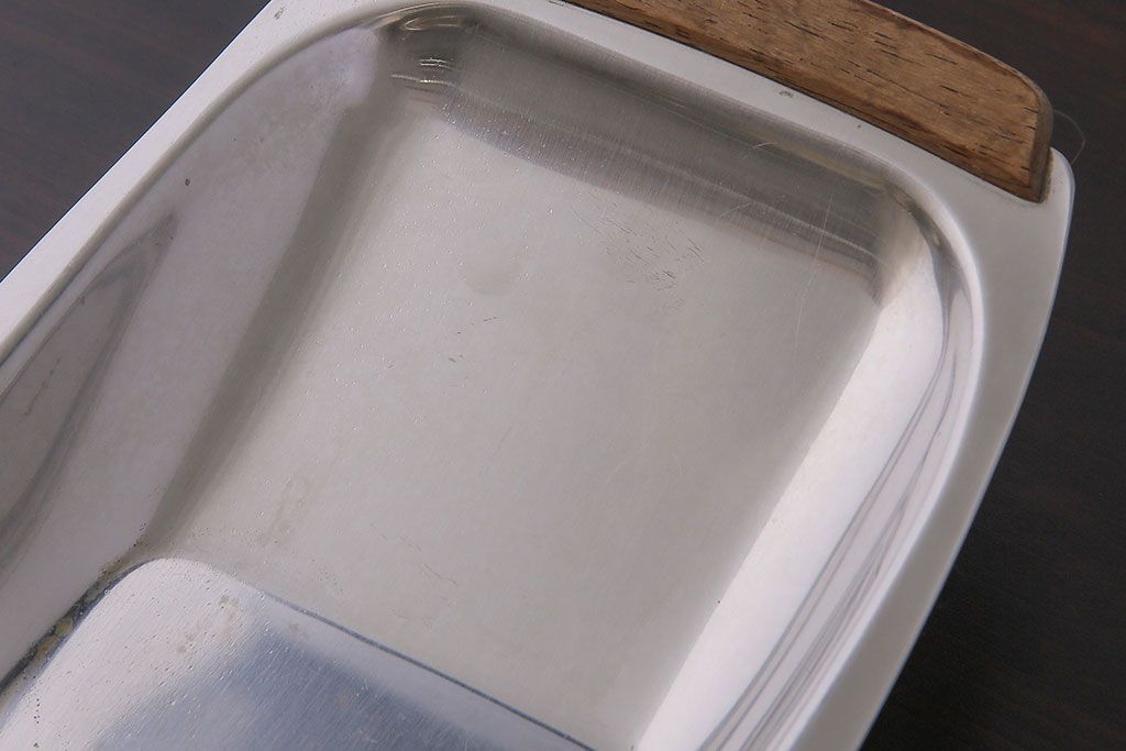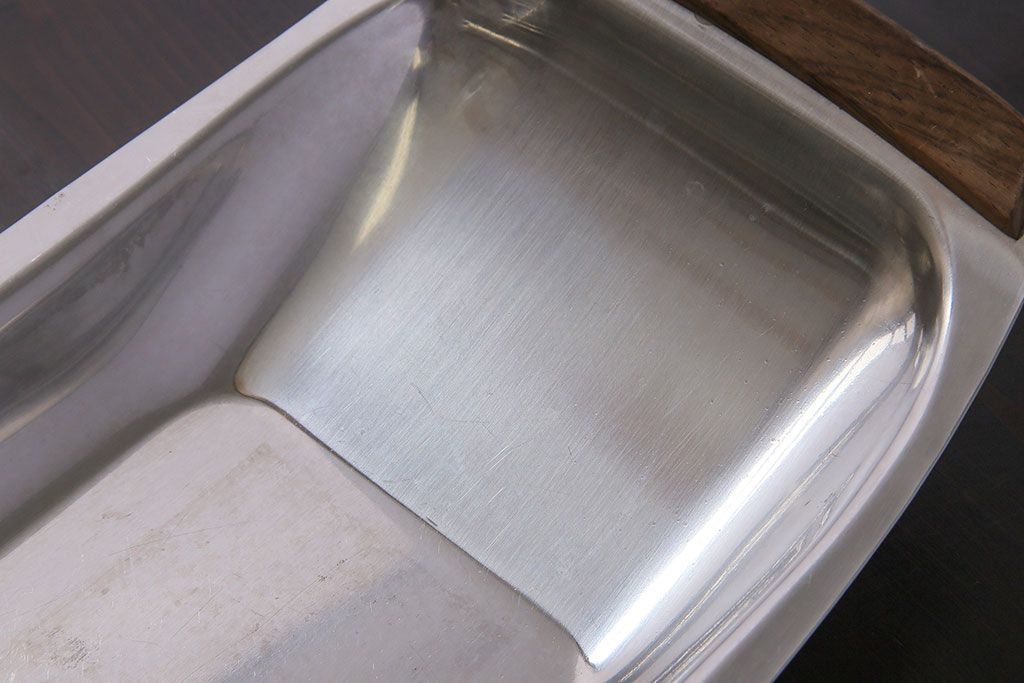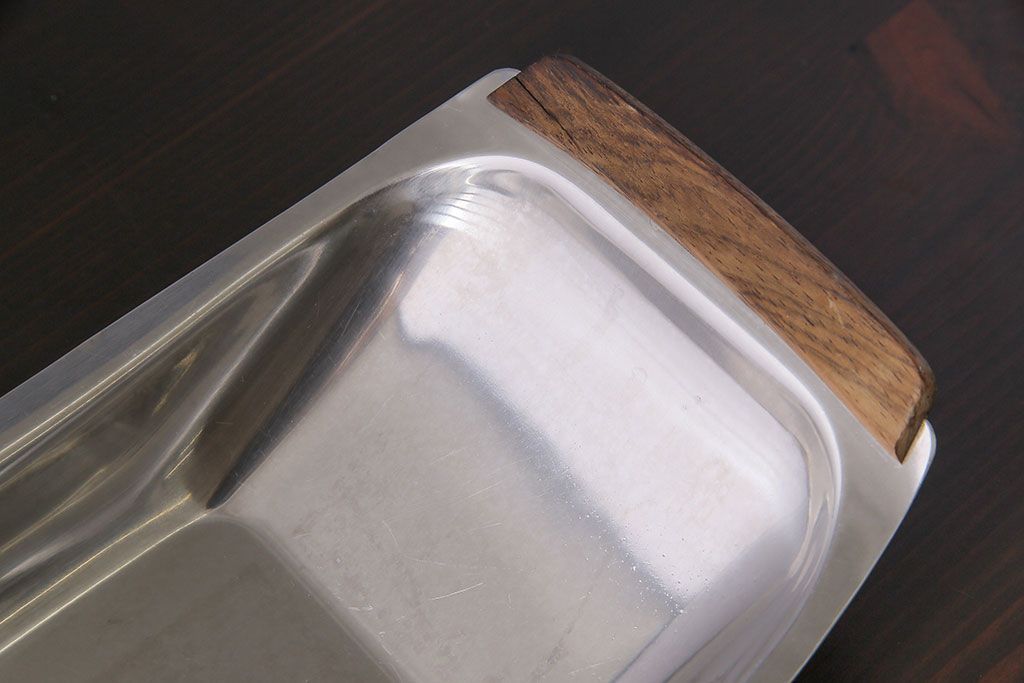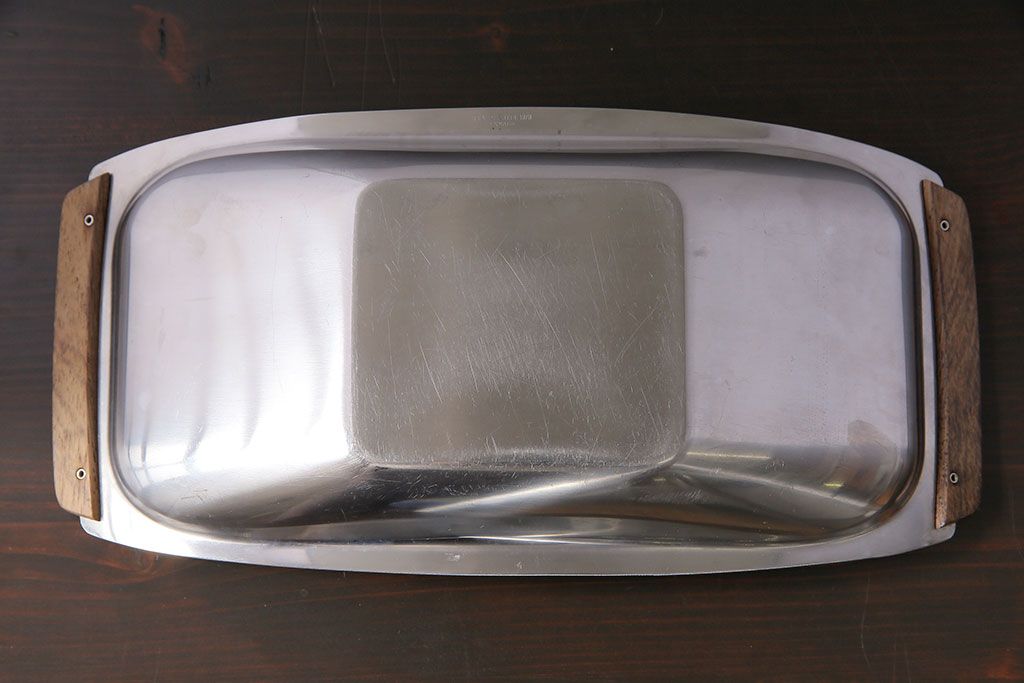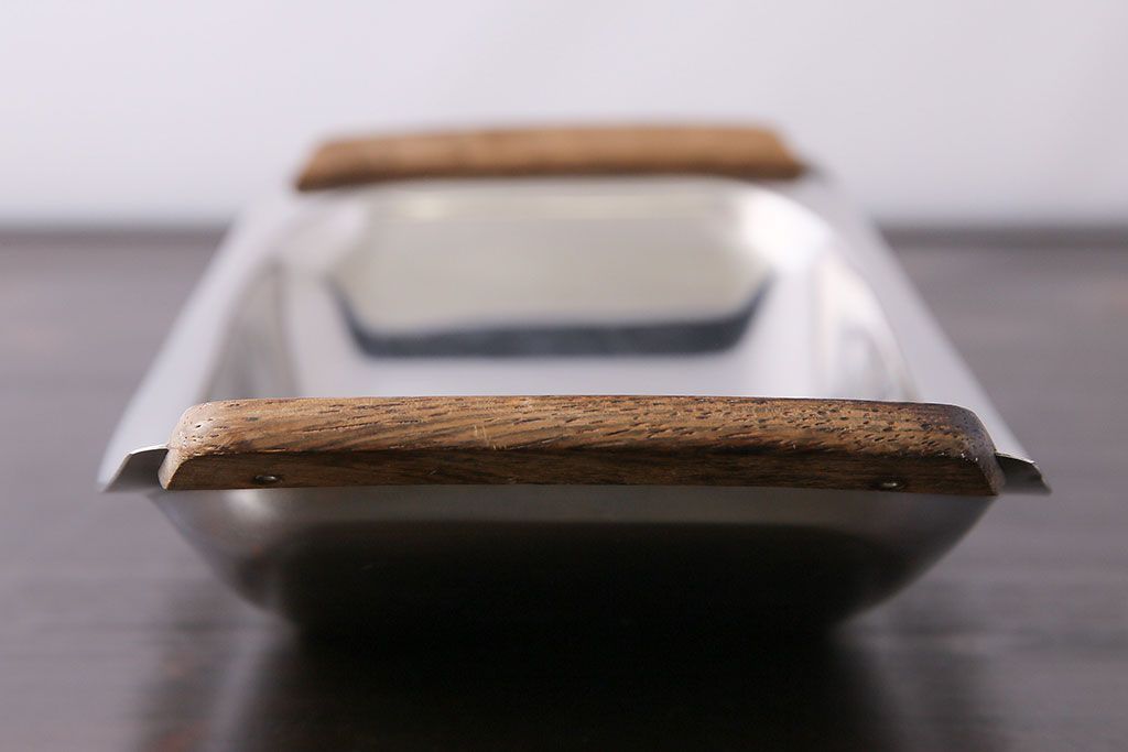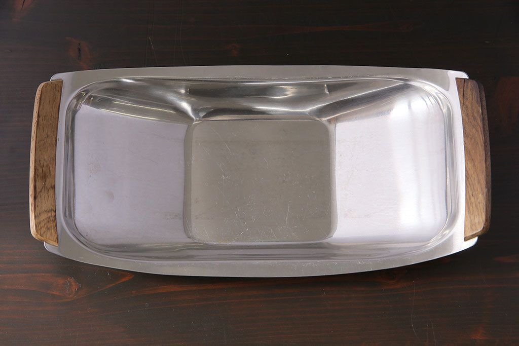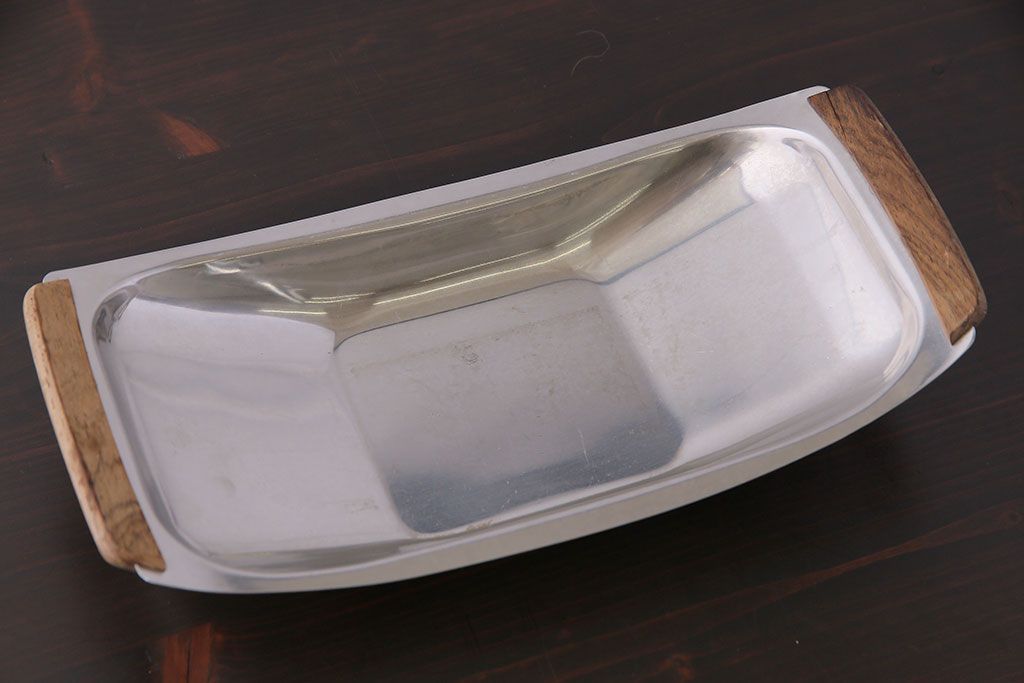 アンティーク雑貨 イギリスビンテージ 木製取っ手付き 舟形のデザインが魅力のステンレストレー(お盆)