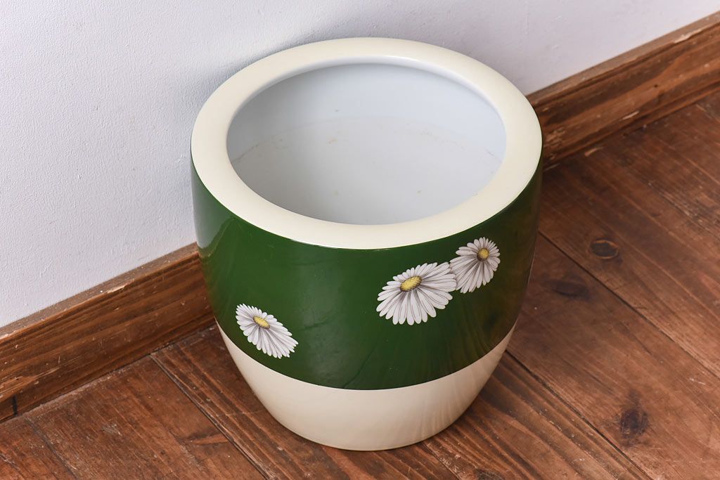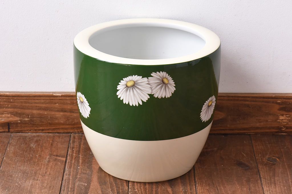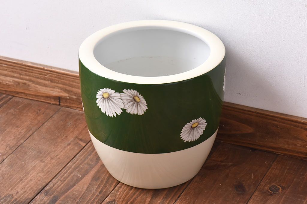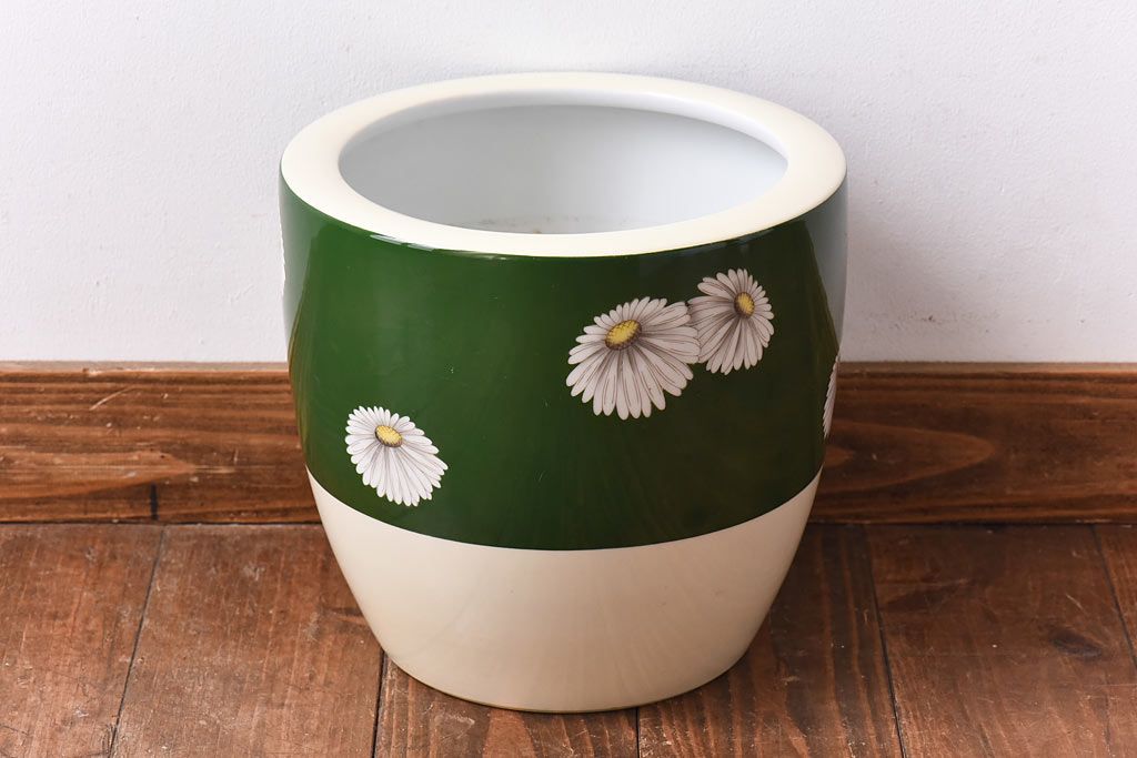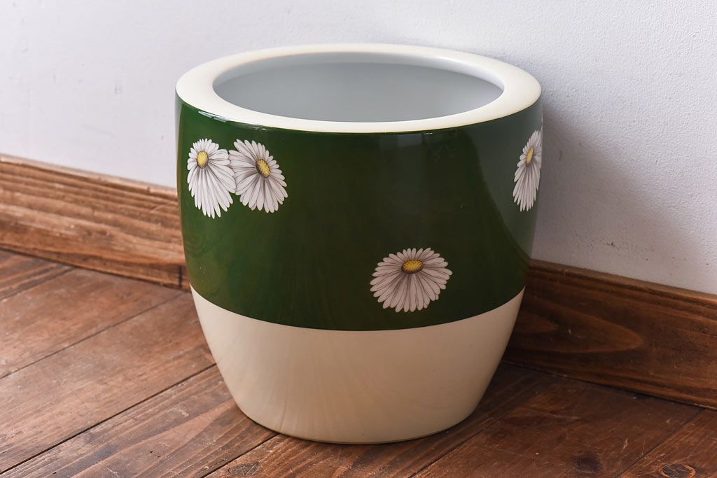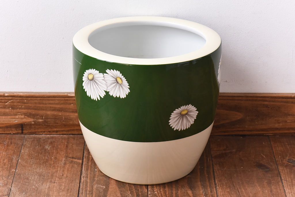 火鉢> 瀬戸火鉢 > アンティーク雑貨 オールドノリタケ・則武(日陶) 緑地 白菊文様 バイカラーがおしゃれな壱型火鉢(手あぶり、鉢カバー、傘立て)
