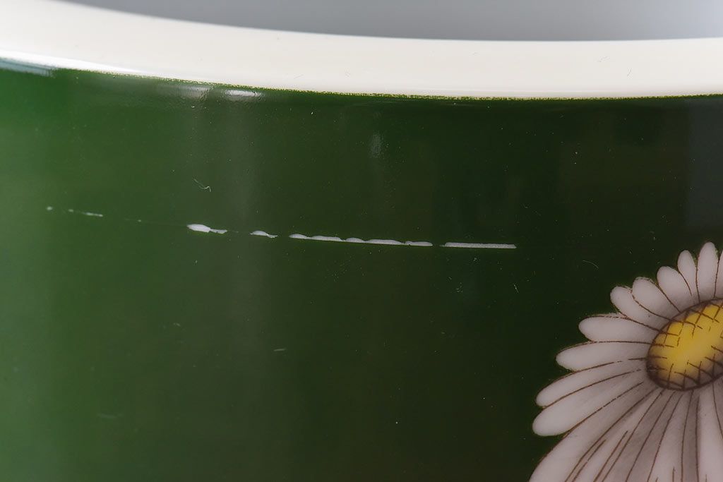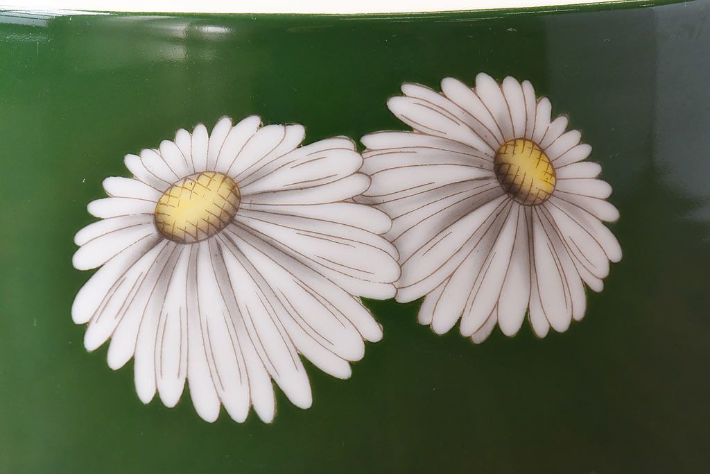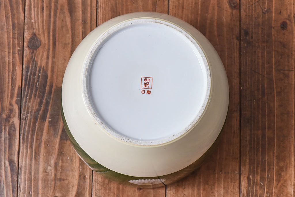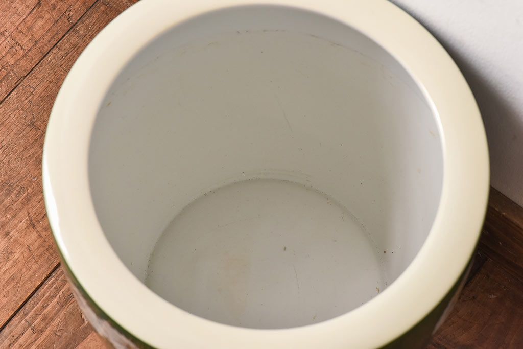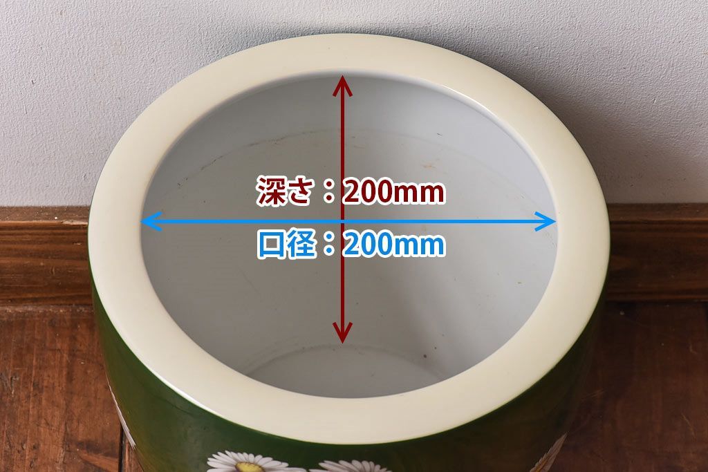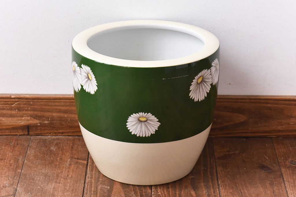 火鉢> 瀬戸火鉢 > アンティーク雑貨 オールドノリタケ・則武(日陶) 緑地 白菊文様 バイカラーがおしゃれな壱型火鉢(手あぶり、鉢カバー、傘立て)