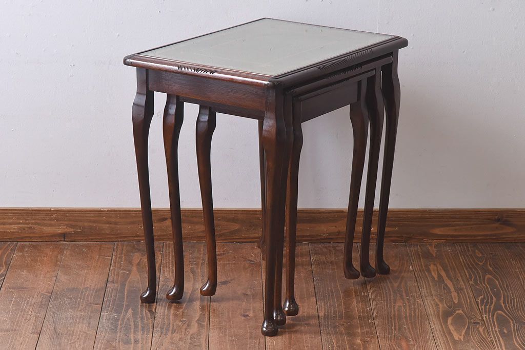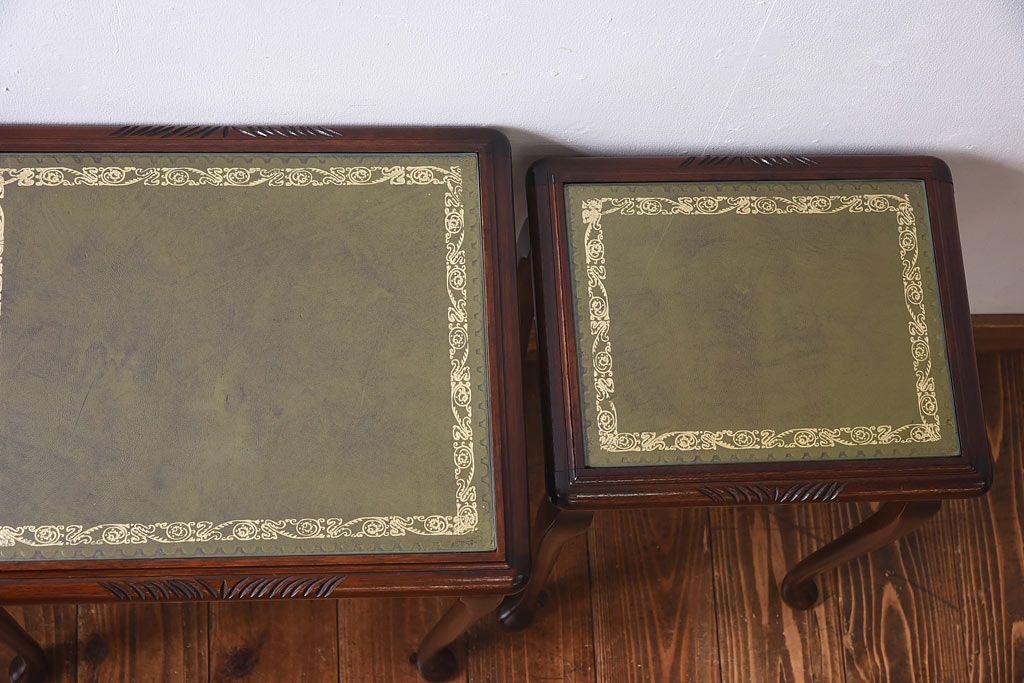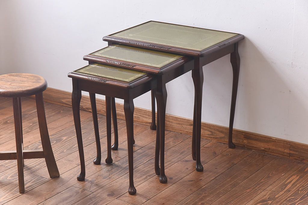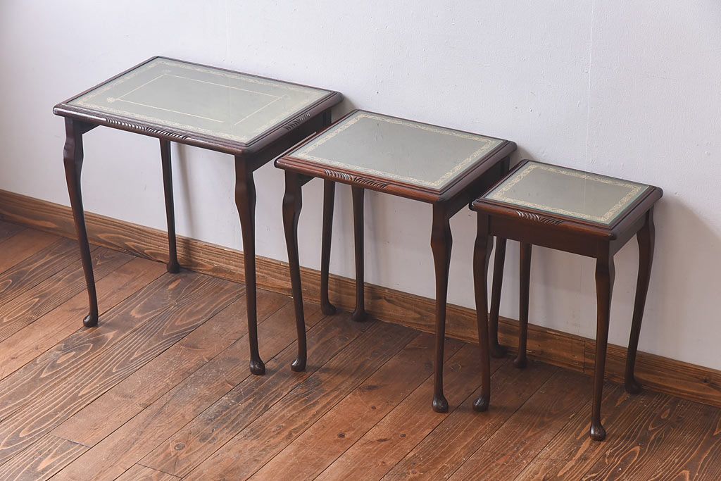 ラフジュ工房> テーブル> ネストテーブル > アンティーク雑貨 イギリス家具 高級感あるレザートップのネストテーブル(入れ子式テーブル、サイドテーブル、コーヒーテーブル、花台)(1)