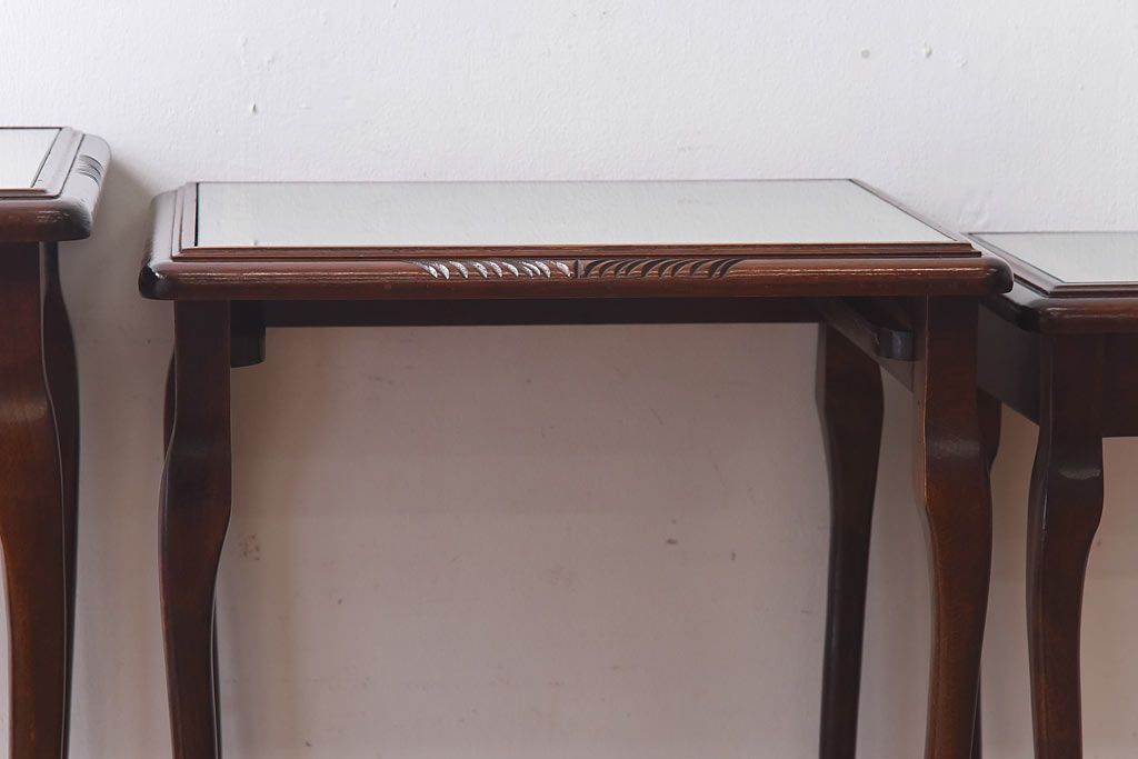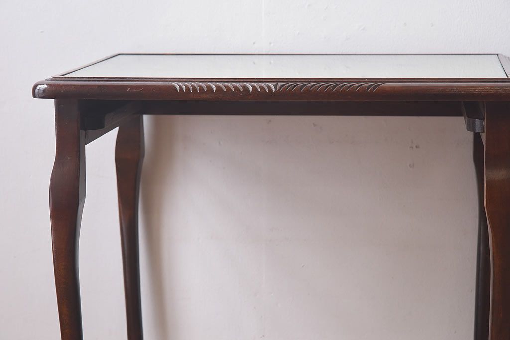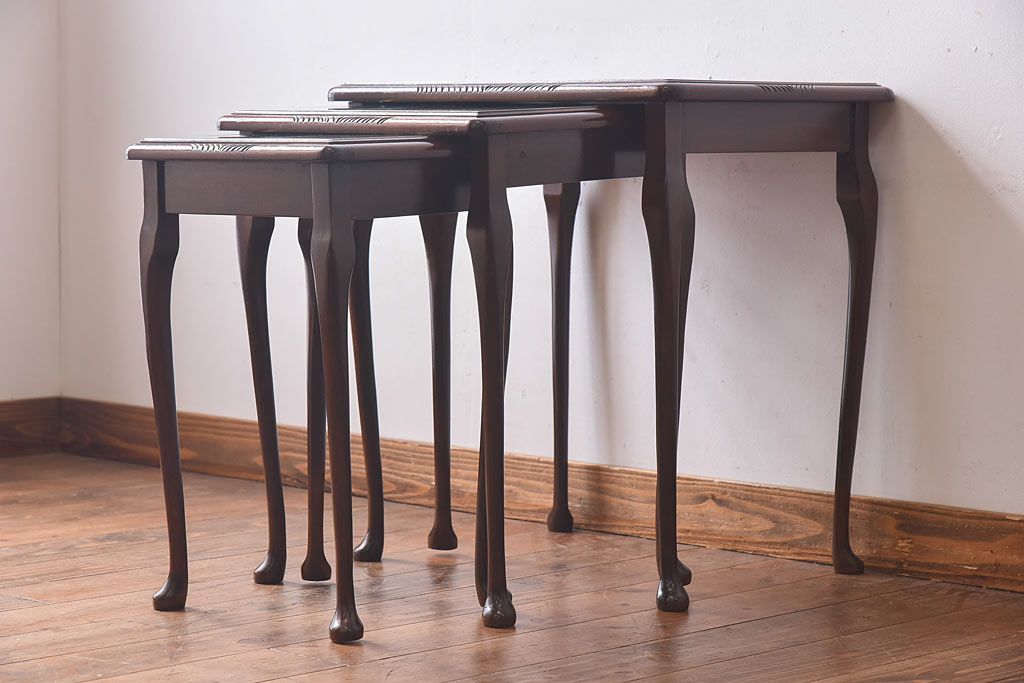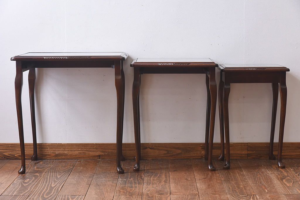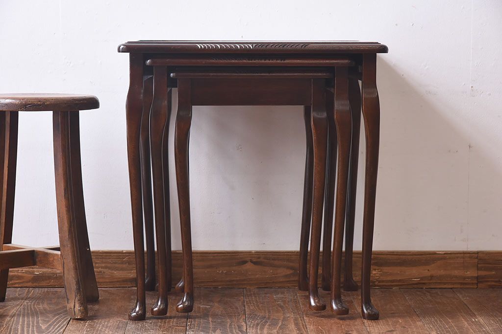 ラフジュ工房> 花台・飾り台 > アンティーク雑貨 イギリス家具 高級感あるレザートップのネストテーブル(入れ子式テーブル、サイドテーブル、コーヒーテーブル、花台)(1)