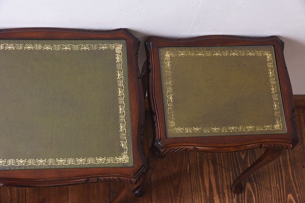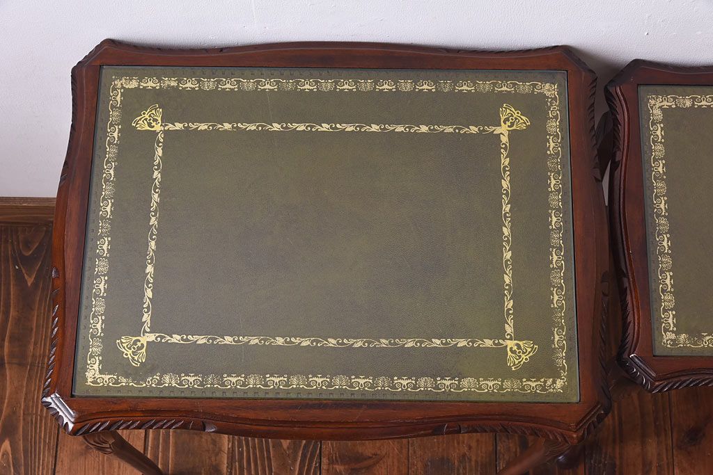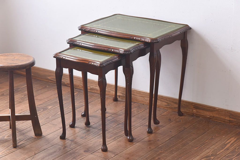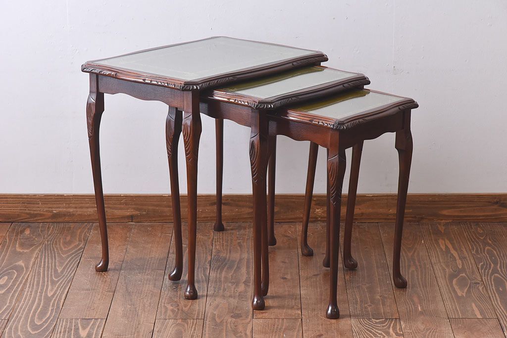 アンティーク雑貨 イギリス家具 高級感あるレザートップのネストテーブル(入れ子式テーブル、サイドテーブル、コーヒーテーブル、花台)(2)
