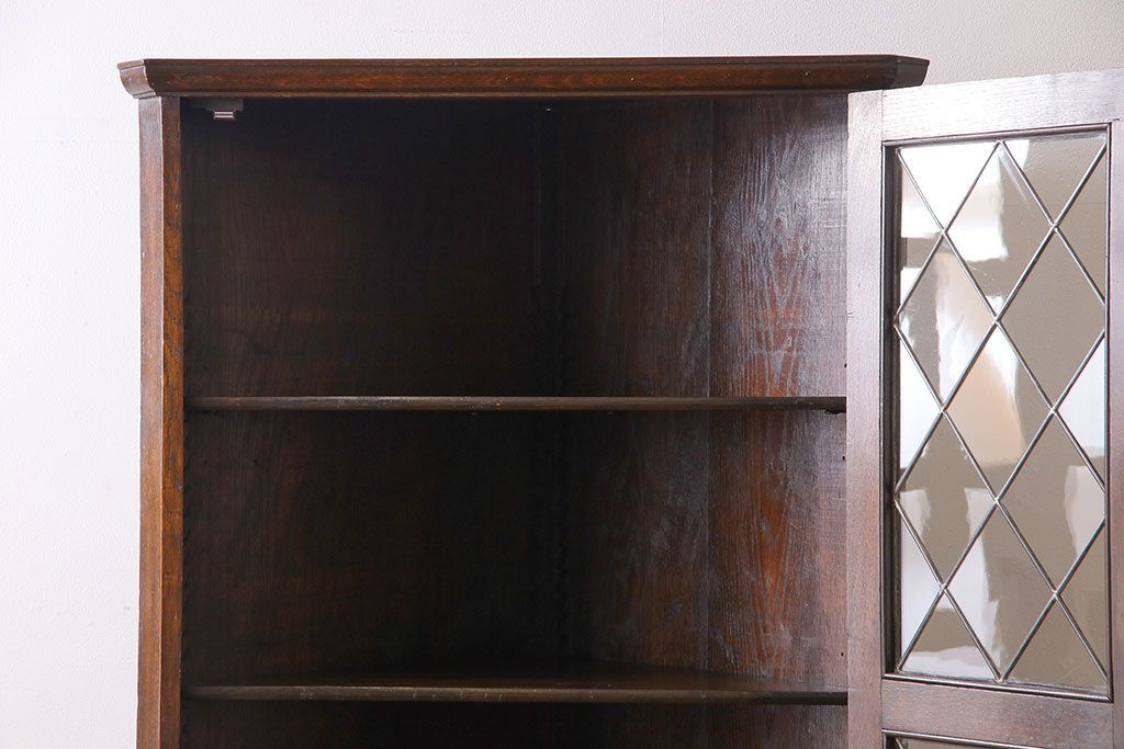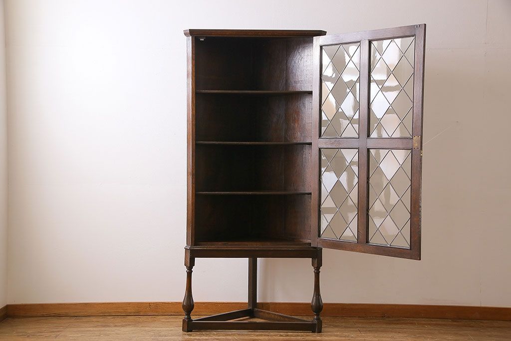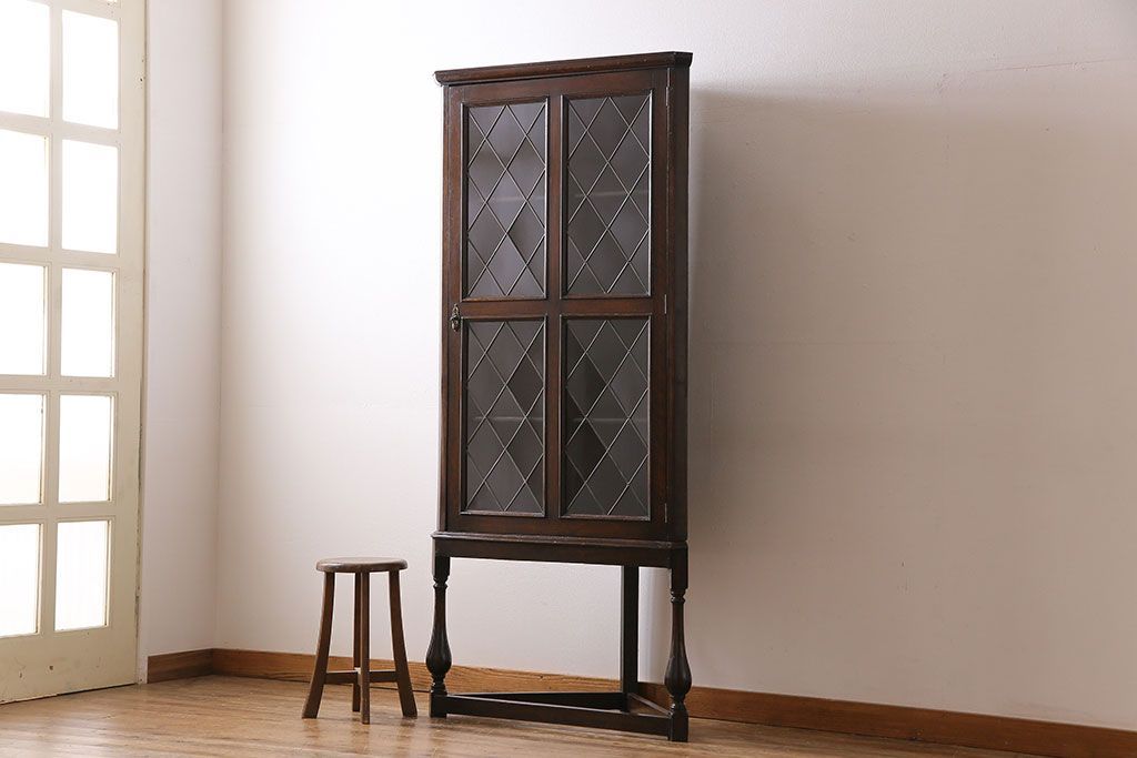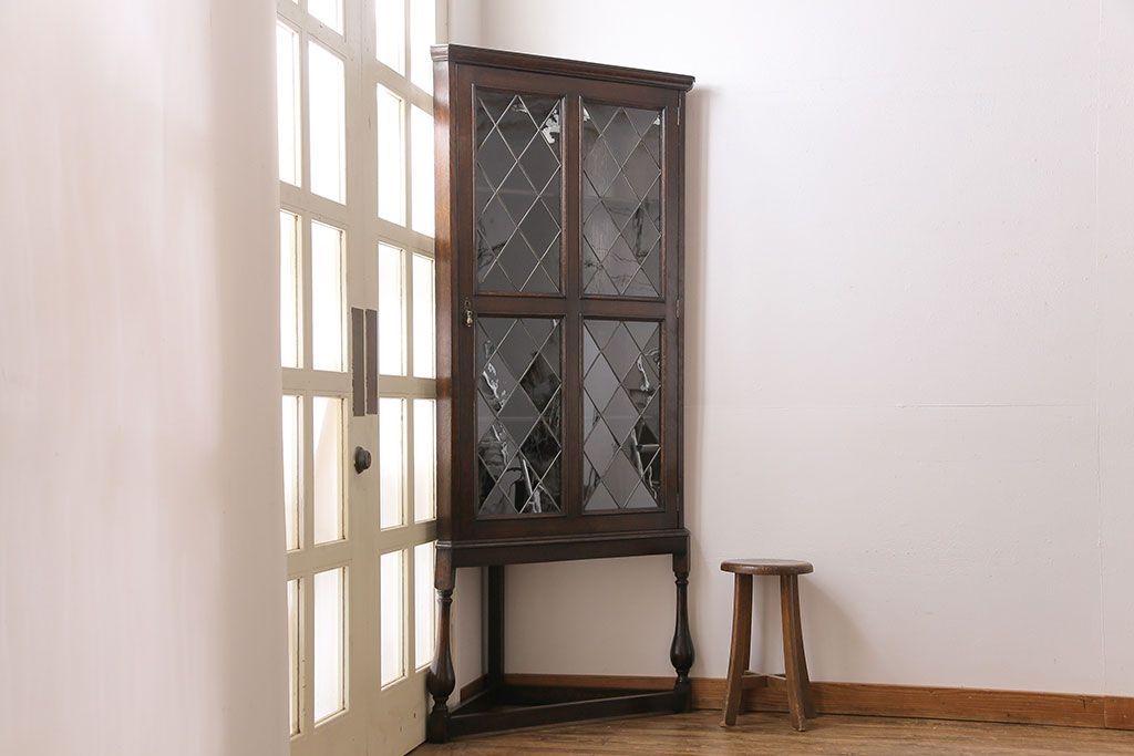 アンティーク家具 イギリスアンティーク ステンドグラスの大振りなコーナーキャビネット(収納棚、ブックケース、本棚)