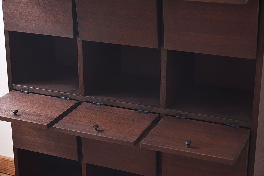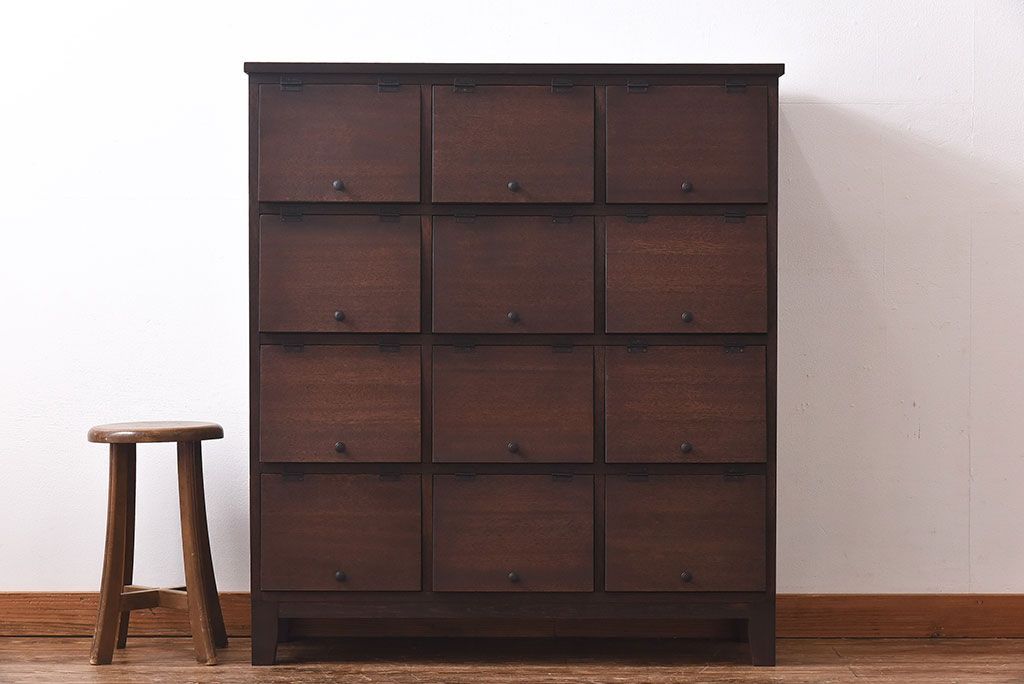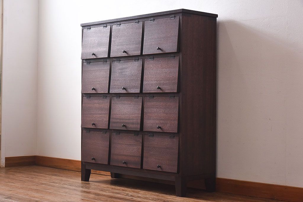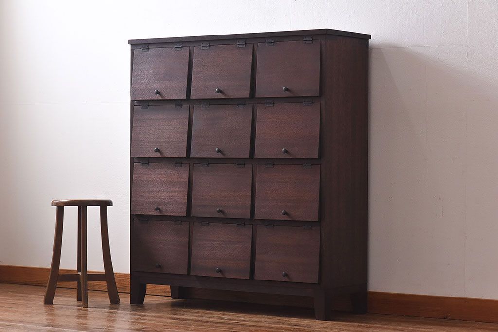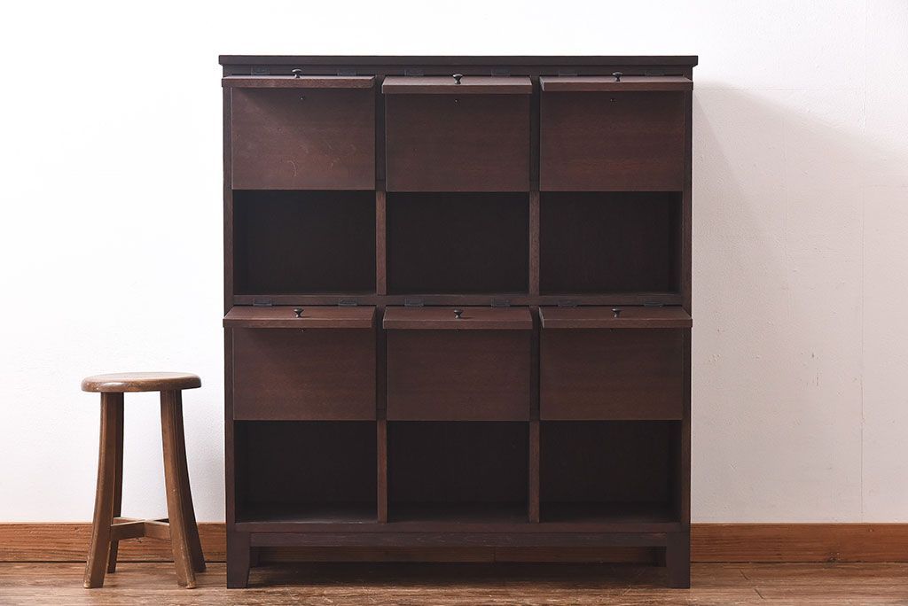 ラフジュ工房オリジナル 古材使用 4×3マス 丸い取っ手が愛らしいパタパタ扉付き収納棚(キャビネット、下駄箱、ロッカー)です。