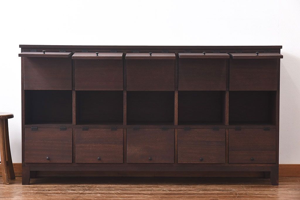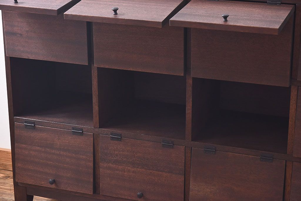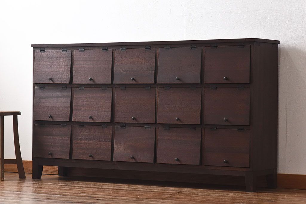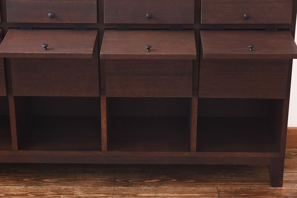 ラフジュ工房> キャビネット・戸棚> サイドキャビネット > ラフジュ工房オリジナル 3×5マス ラワン古材のパタパタ扉付き横型・収納棚(キャビネット、下駄箱、ロッカー)