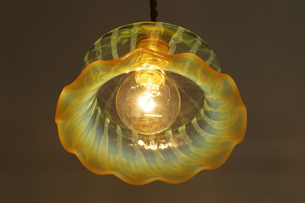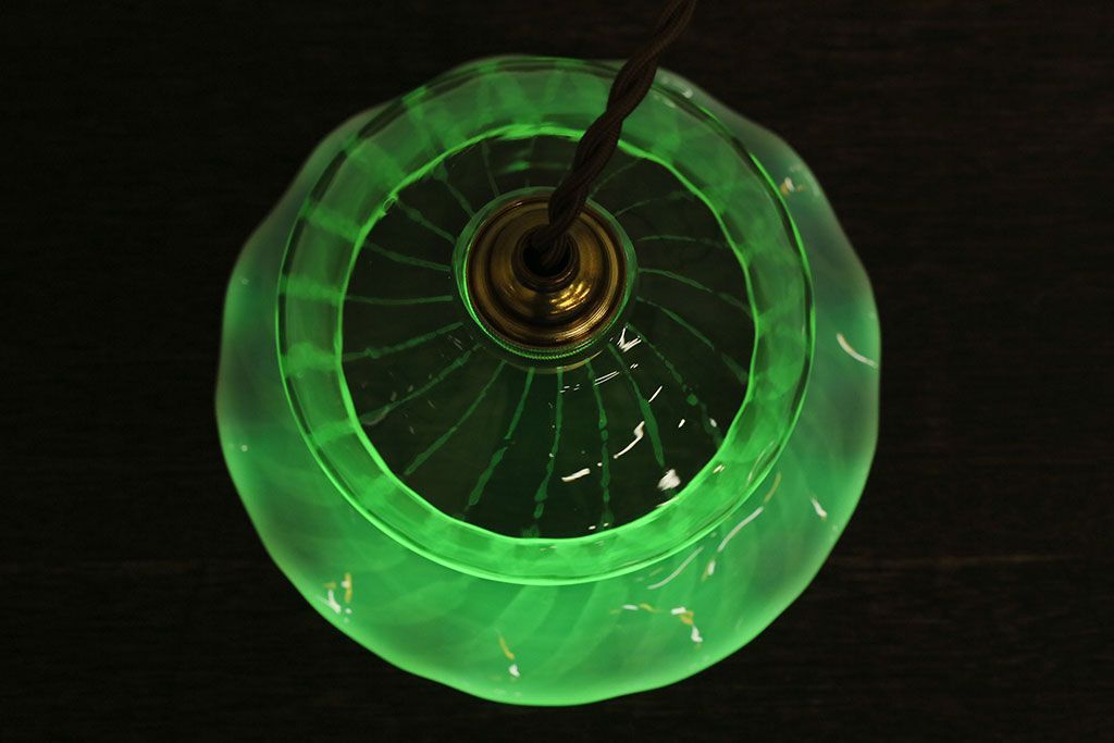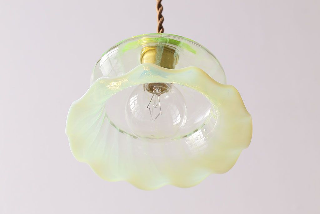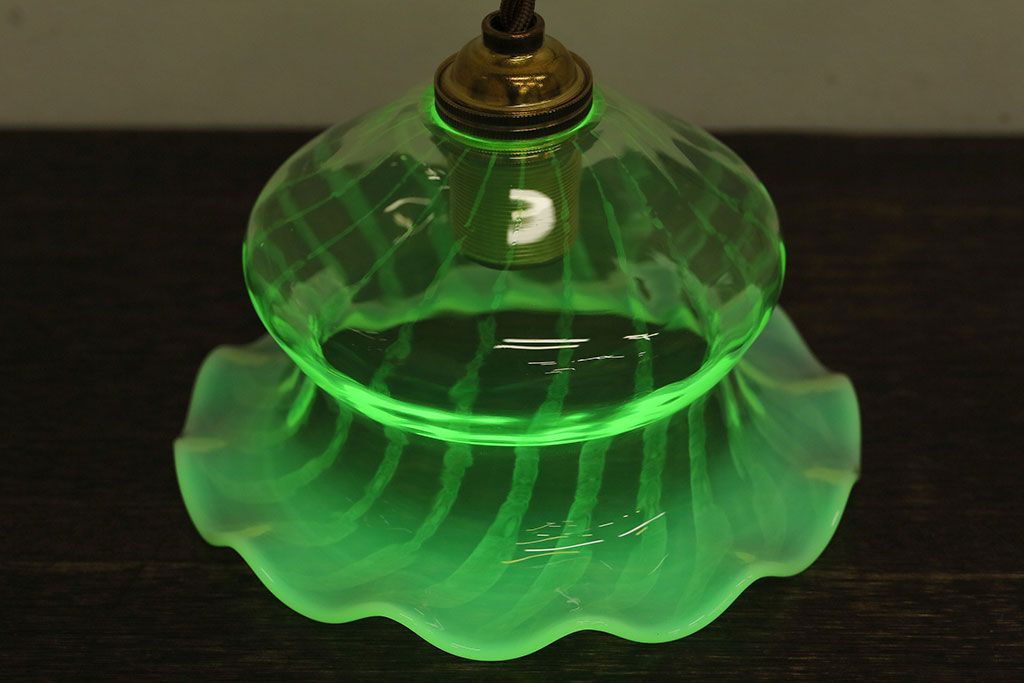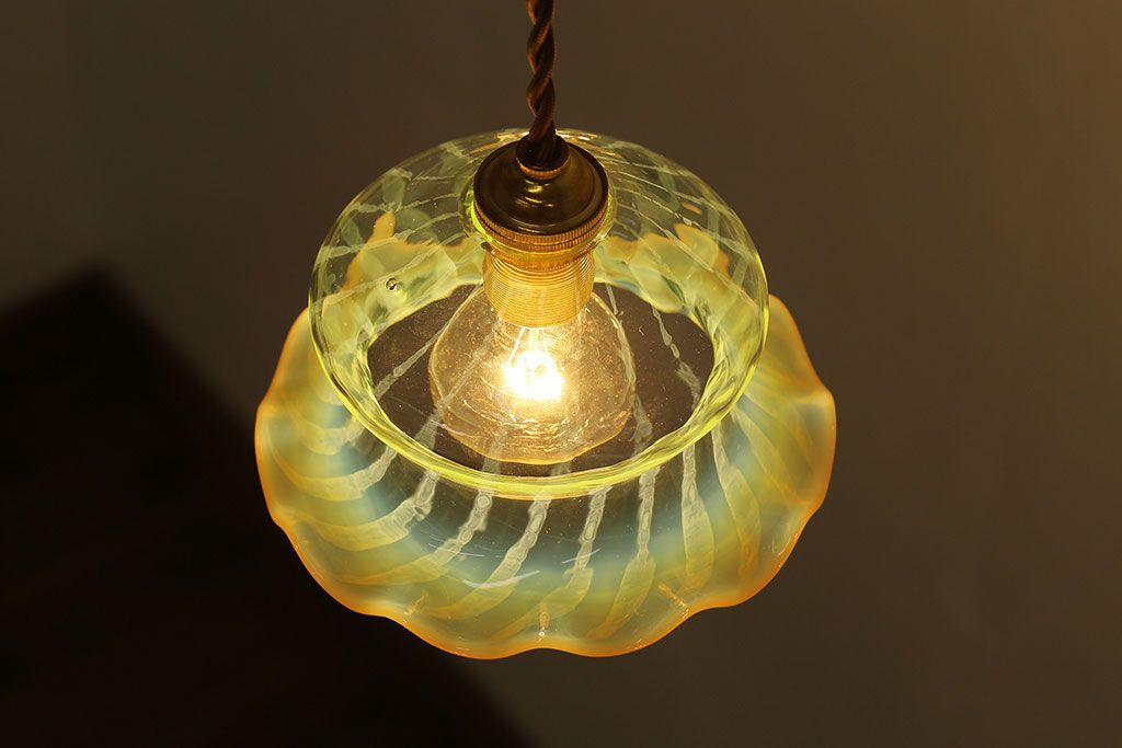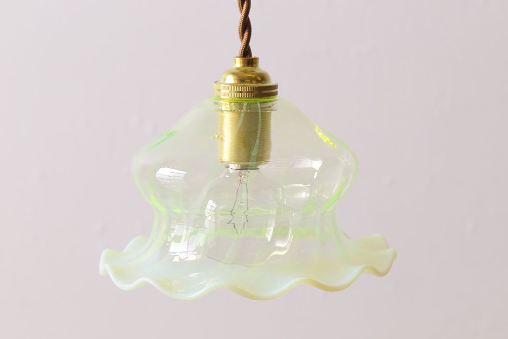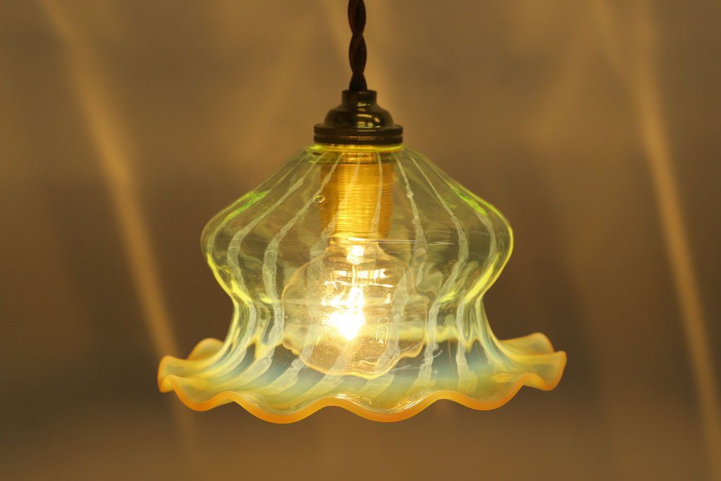 ストライプが浮かび上がるおしゃれなウランガラス製フリルシェード(天井照明、ペンダントライト)