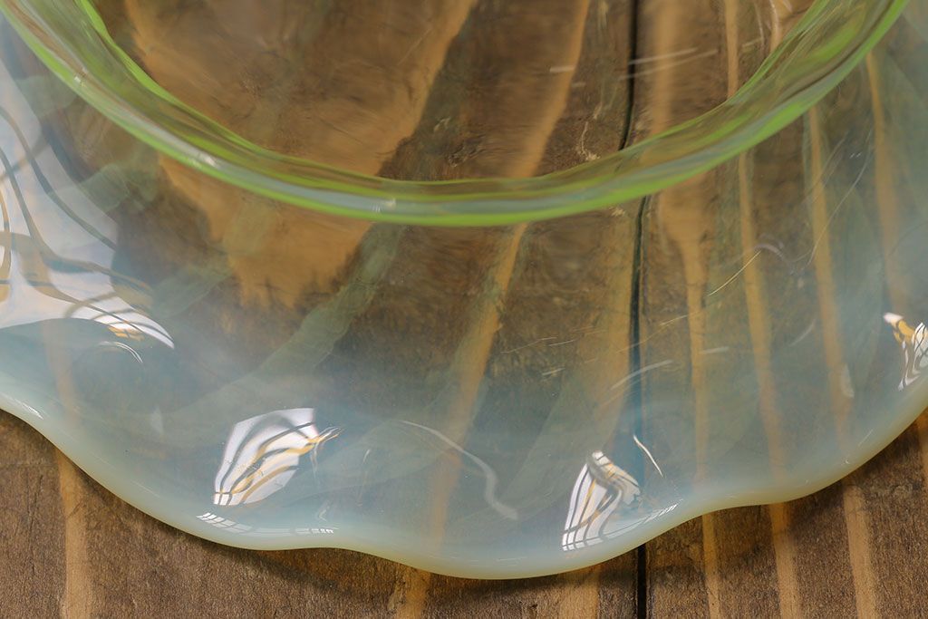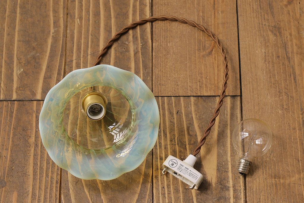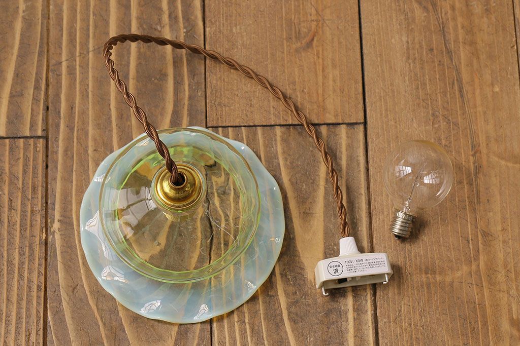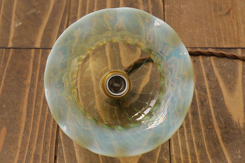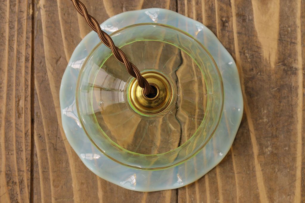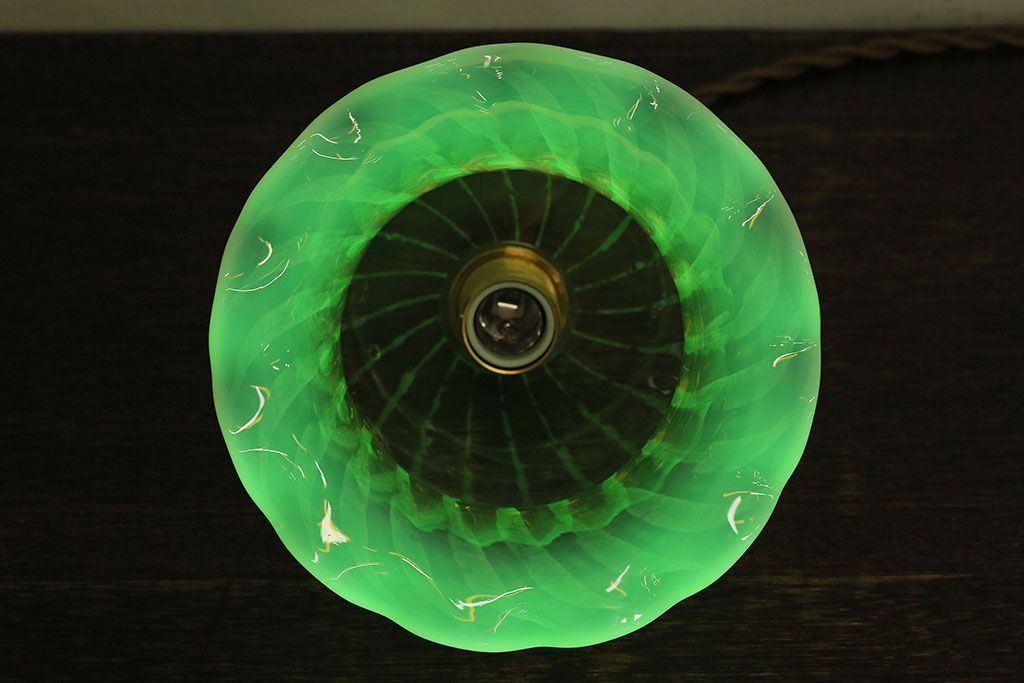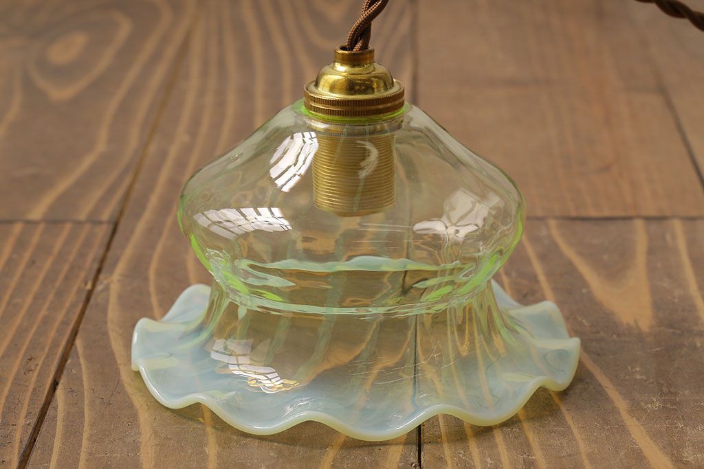 ストライプが浮かび上がるおしゃれなウランガラス製フリルシェード(天井照明、ペンダントライト)