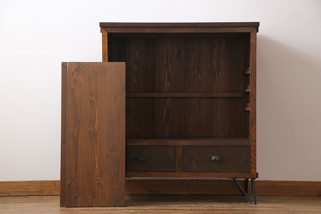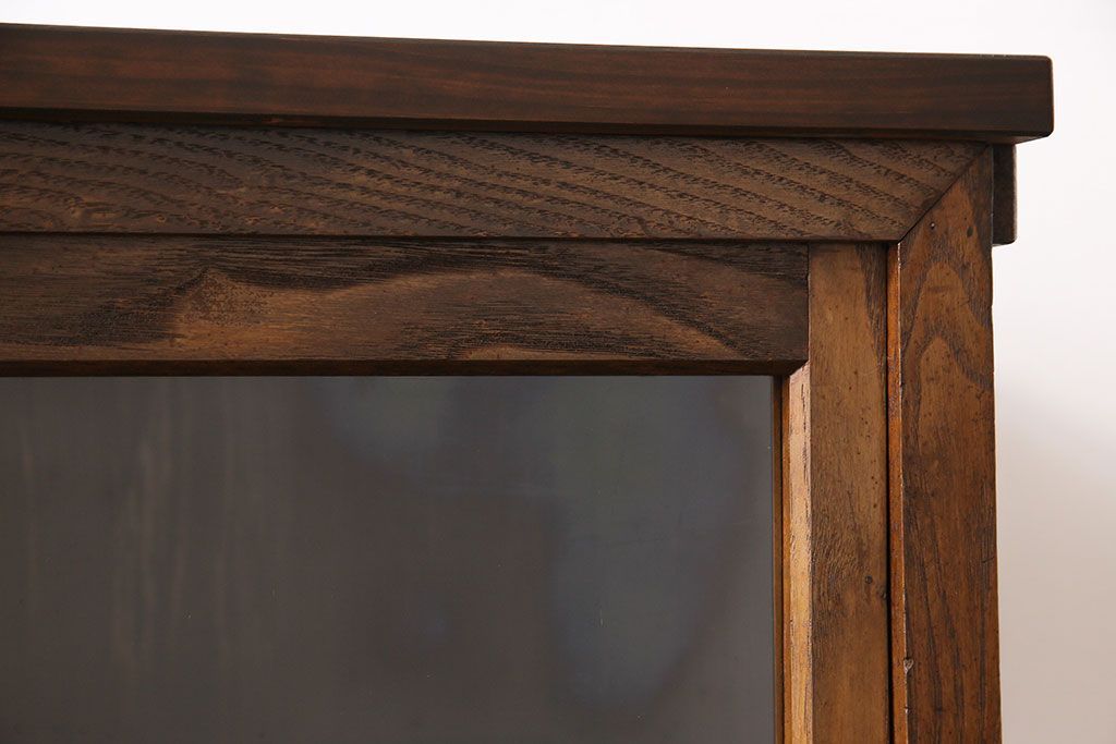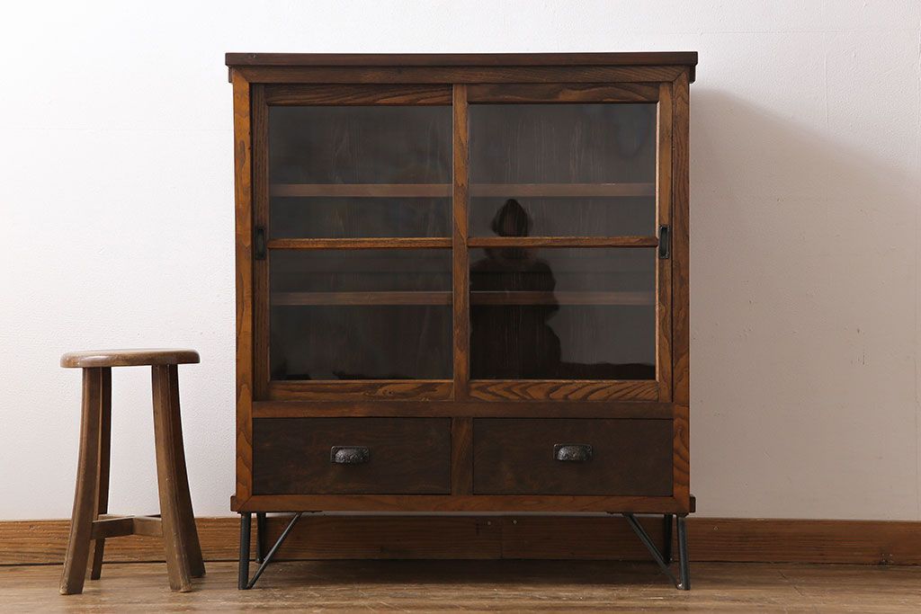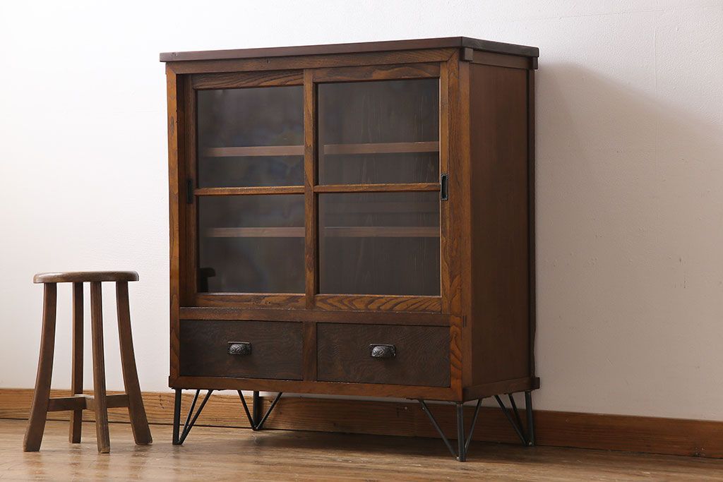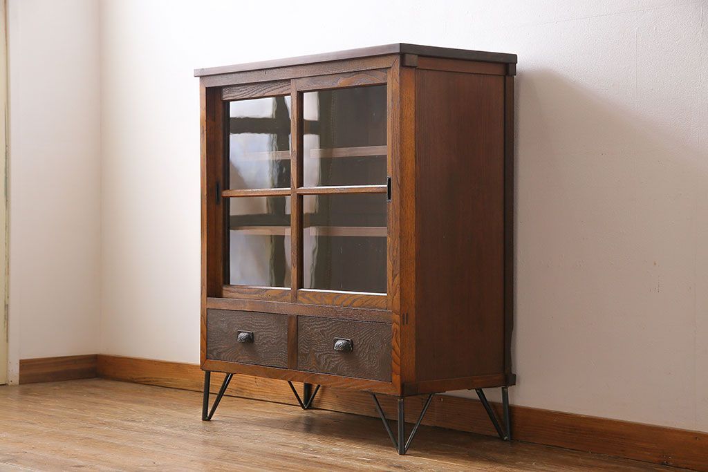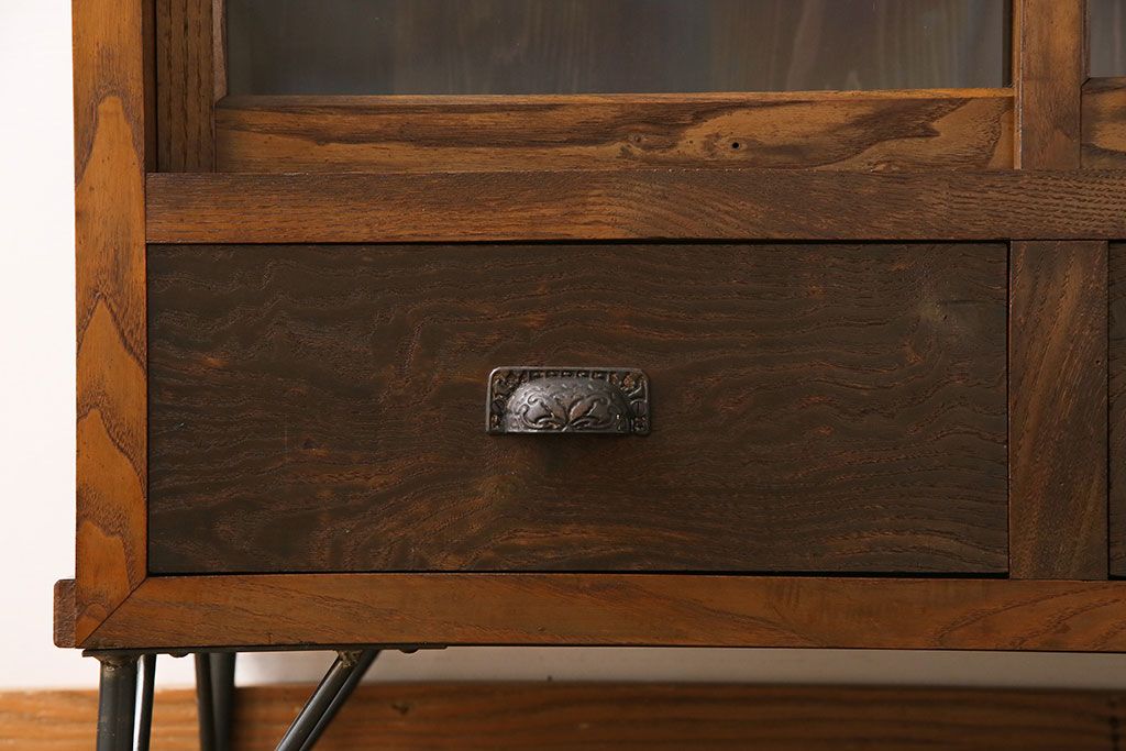 レトロ家具 昭和レトロ 前面タモ材 味わいのある風合いの鉄脚付キャビネット(ガラス戸棚、飾り棚、食器棚)