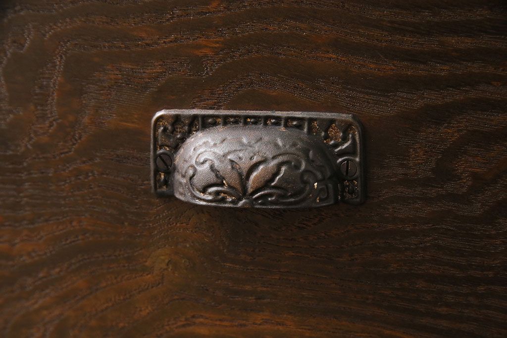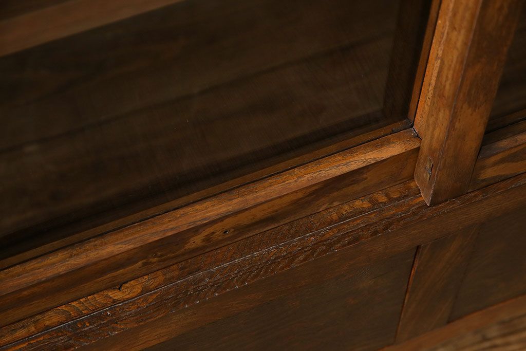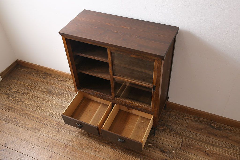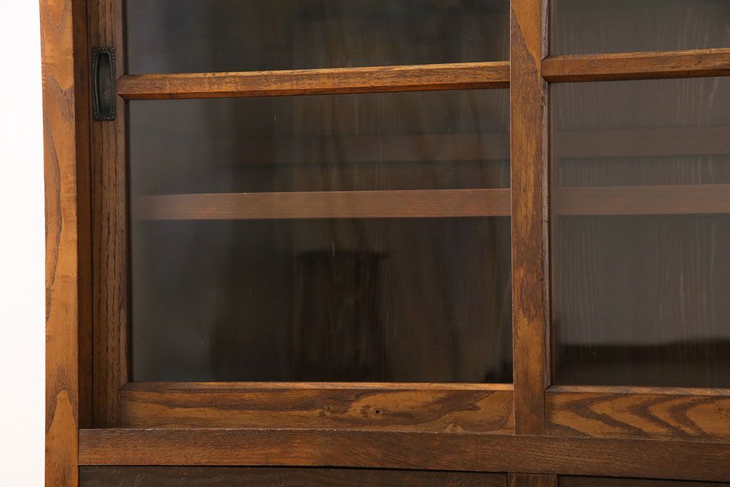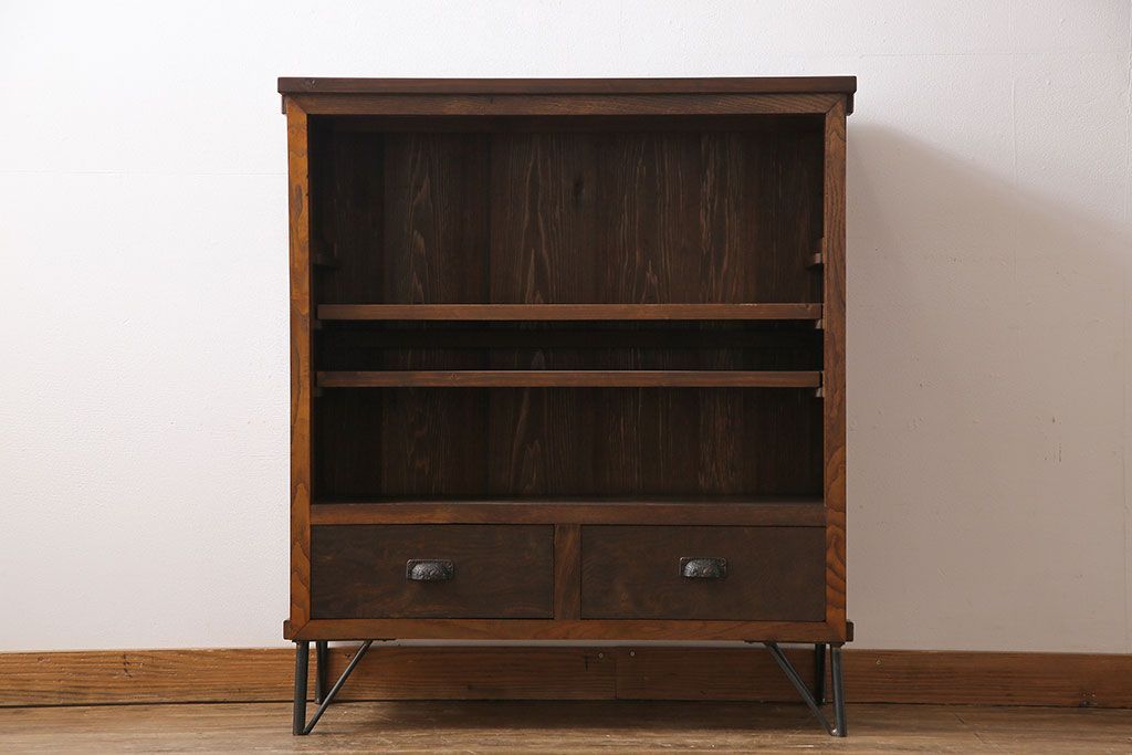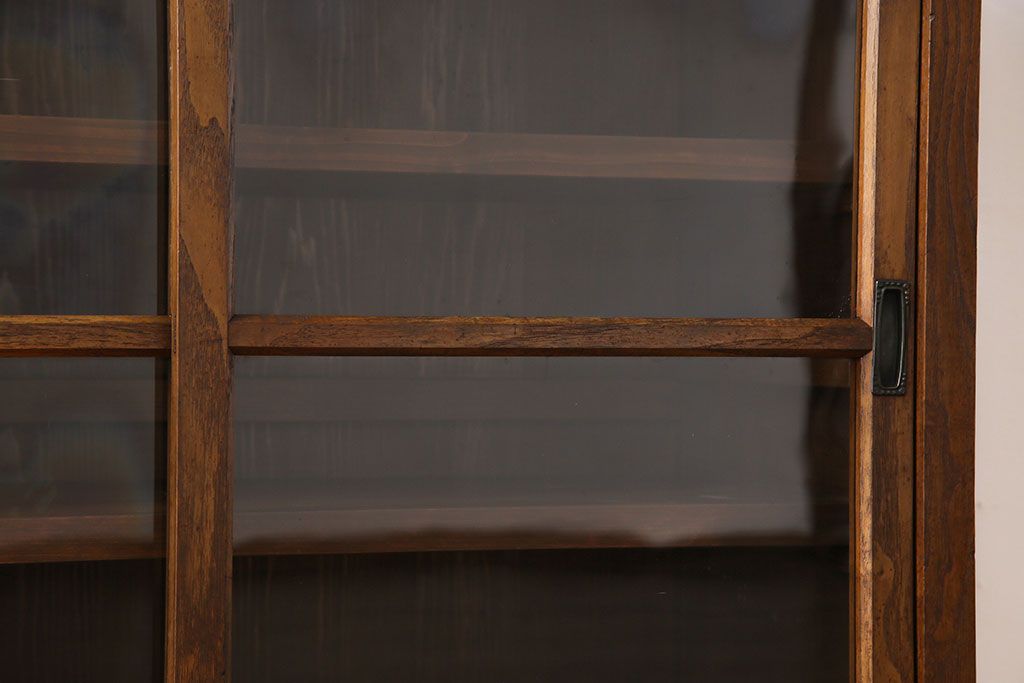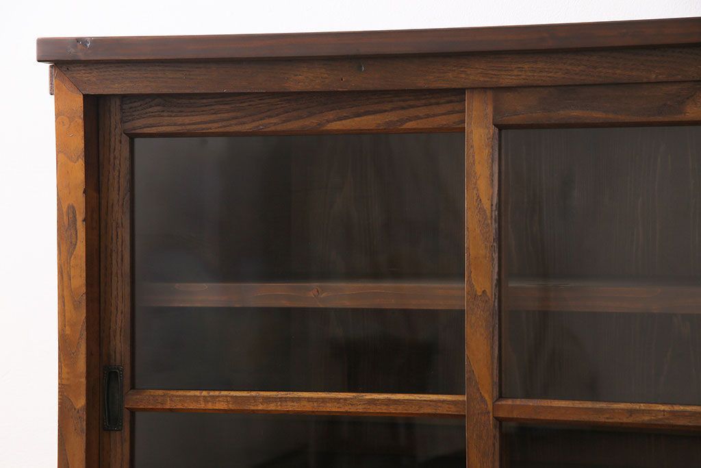 レトロ家具 昭和レトロ 前面タモ材 味わいのある風合いの鉄脚付キャビネット(ガラス戸棚、飾り棚、食器棚)