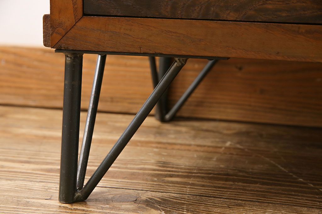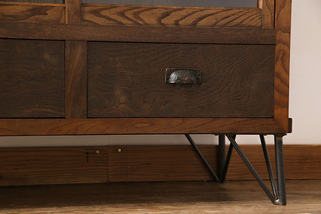 昭和レトロ 前面タモ材 味わいのある風合いの鉄脚付キャビネット(ガラス戸棚、飾り棚、食器棚)です。