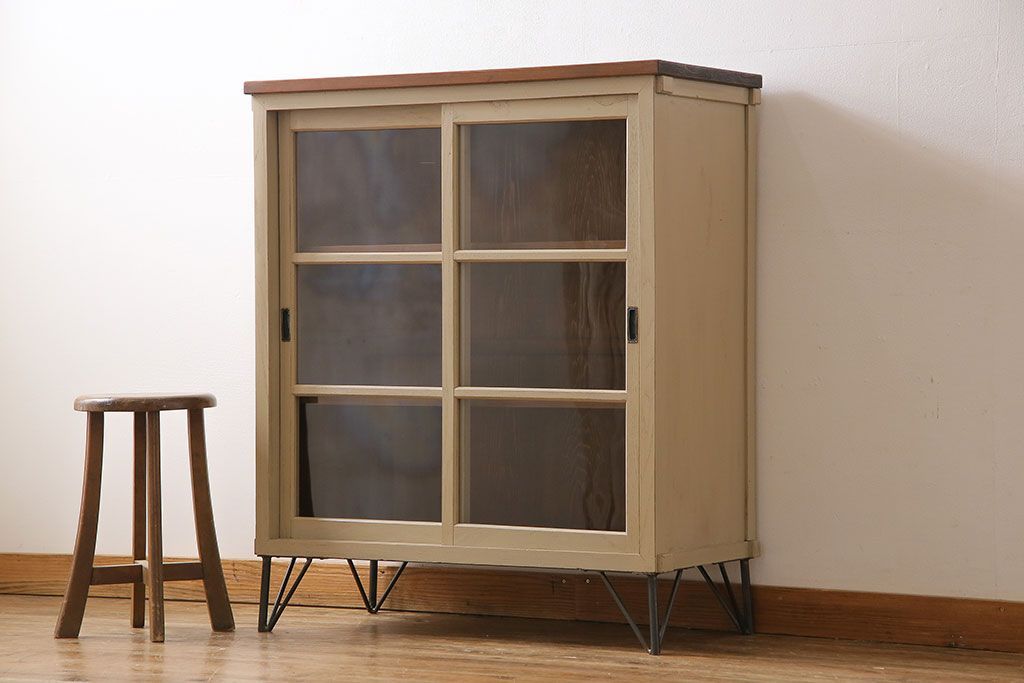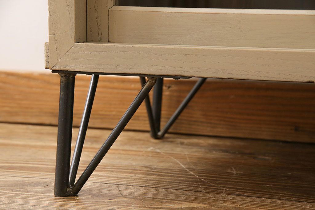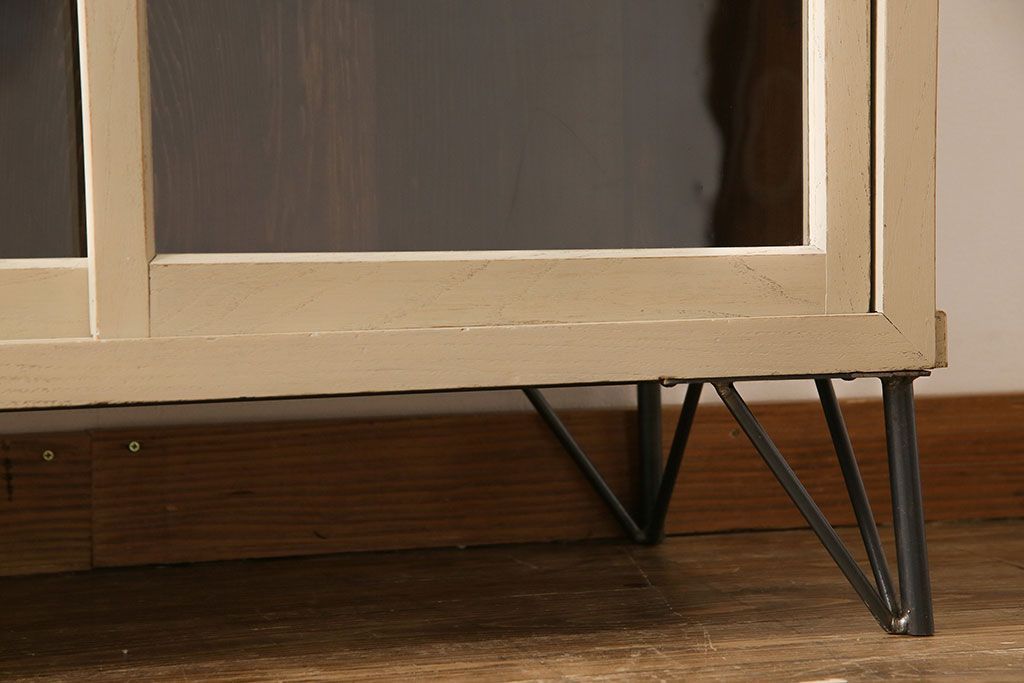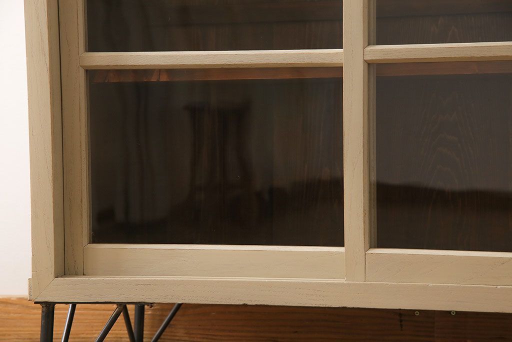 ペイント家具 ゆらゆらガラスが懐かしさ漂う鉄脚付キャビネット(ガラス戸棚、飾り棚)