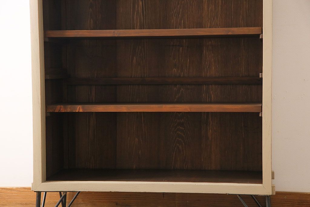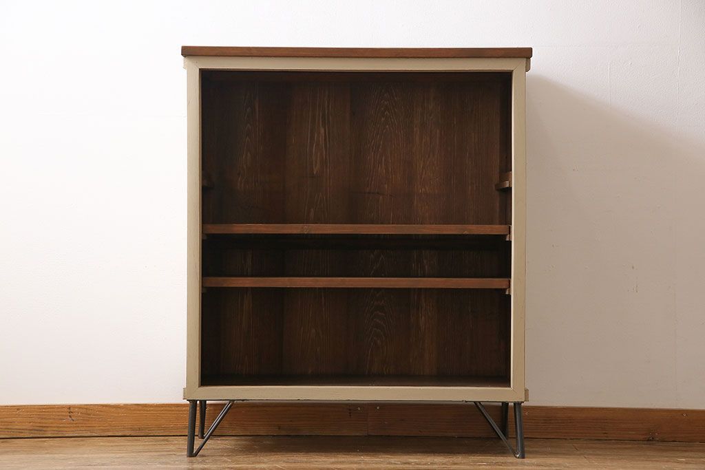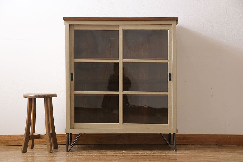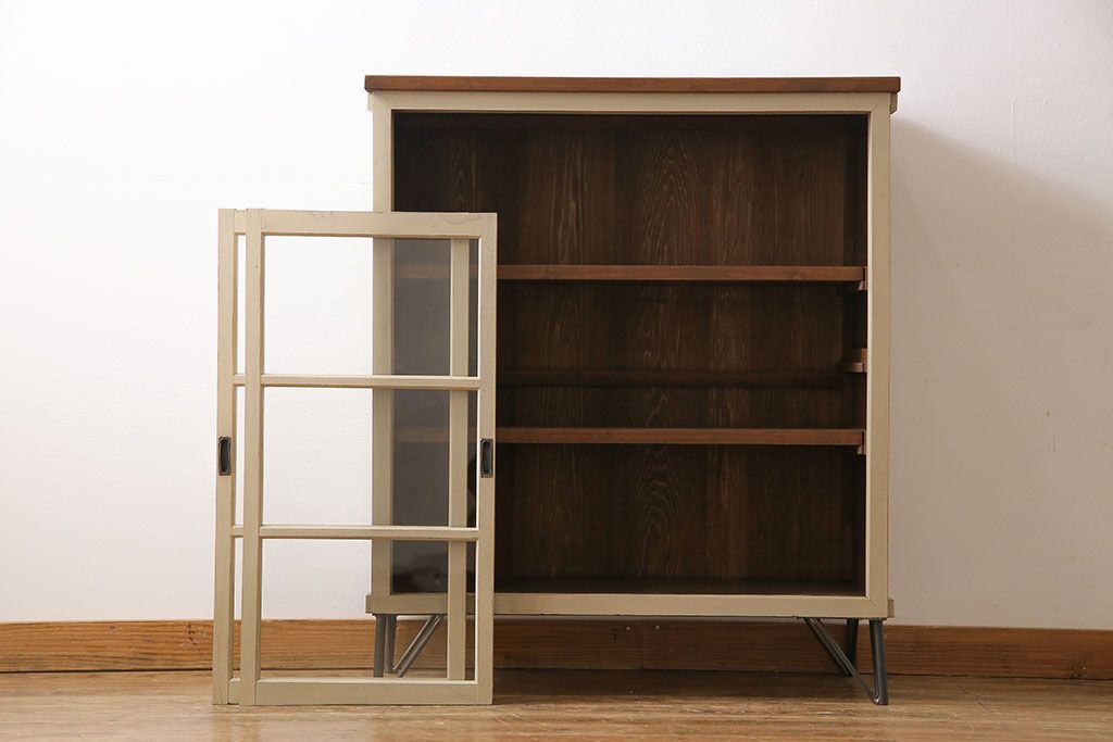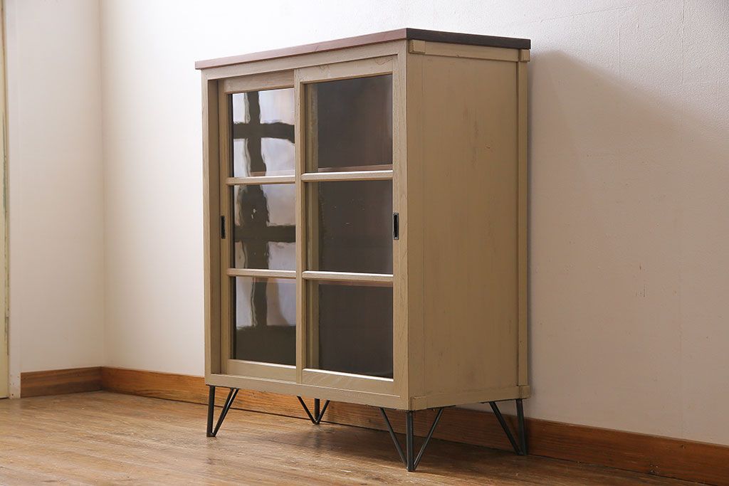 ペイント家具 ゆらゆらガラスが懐かしさ漂う鉄脚付キャビネット(ガラス戸棚、飾り棚)