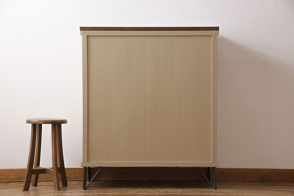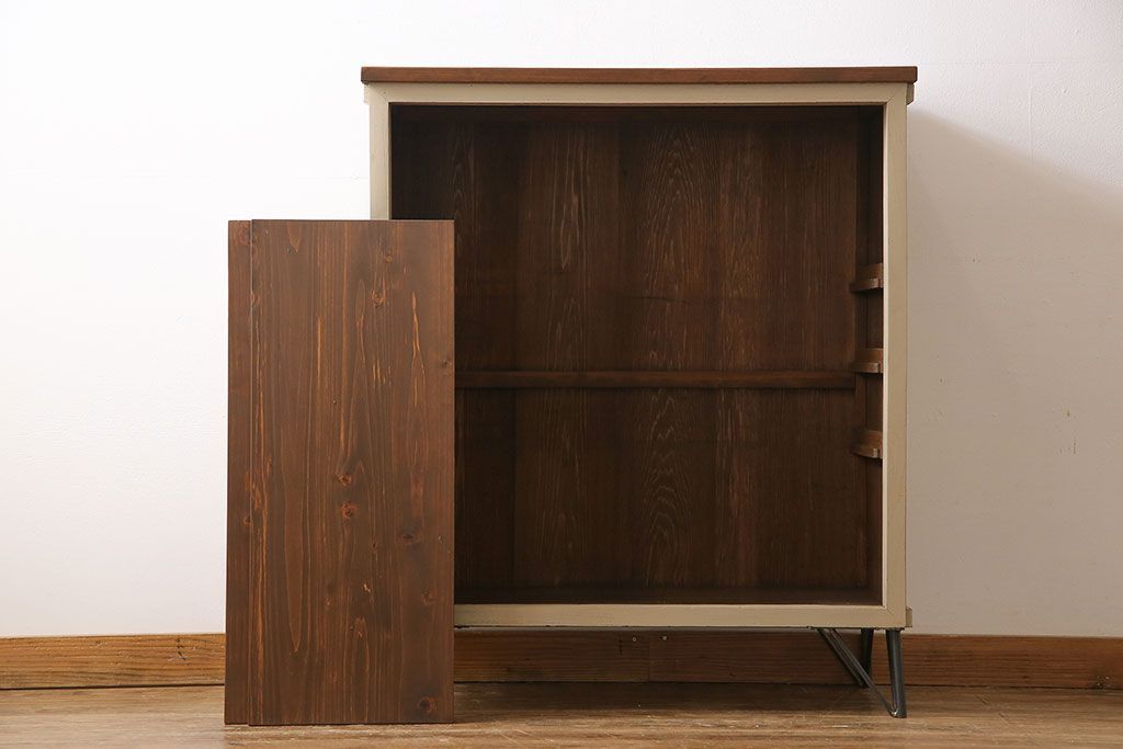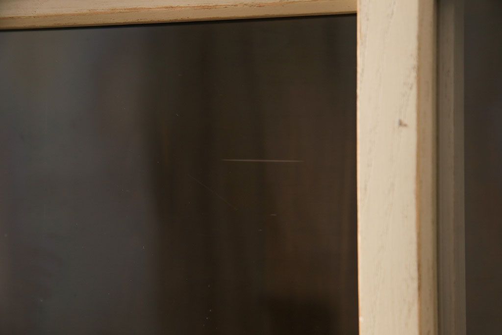 ラフジュ工房> キャビネット・戸棚> サイドキャビネット > ペイント家具 ゆらゆらガラスが懐かしさ漂う鉄脚付キャビネット(ガラス戸棚、飾り棚)