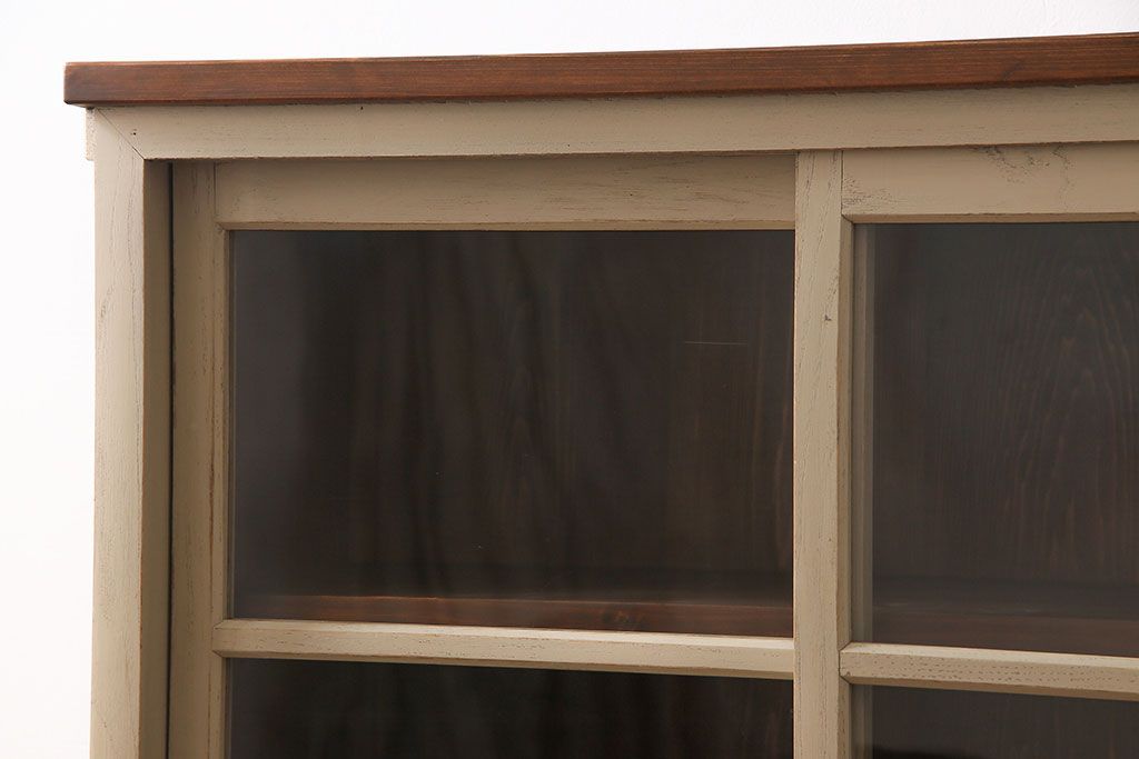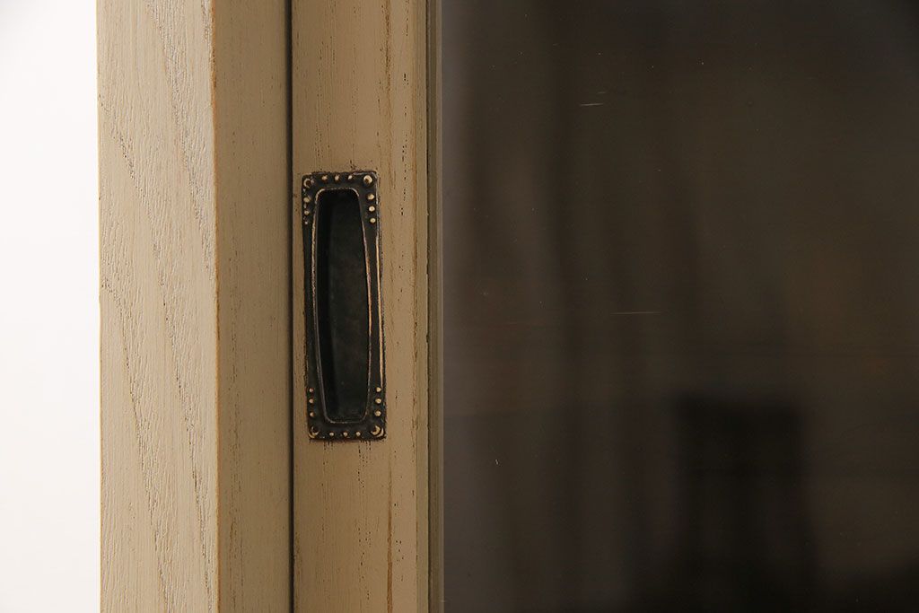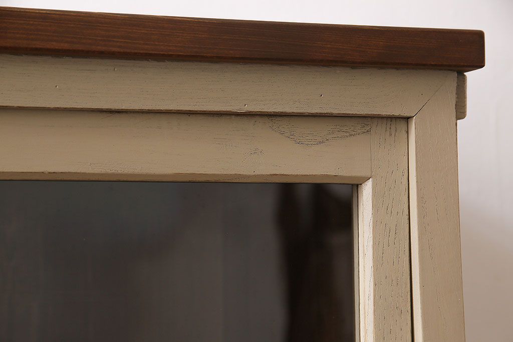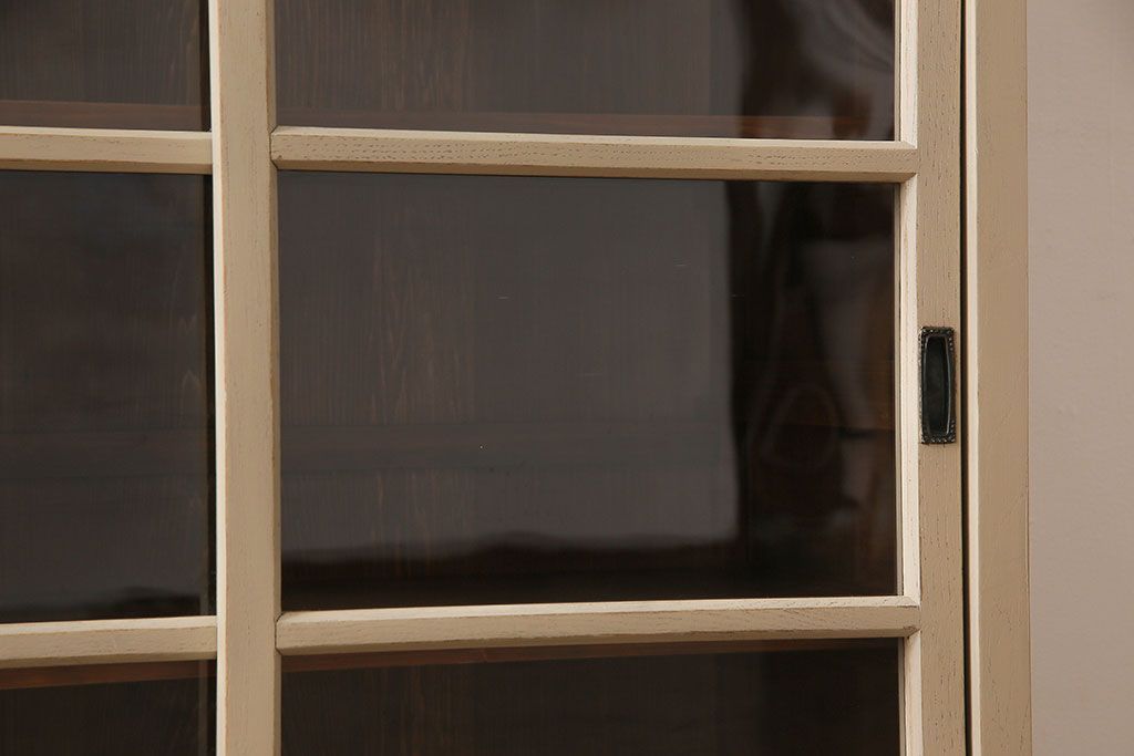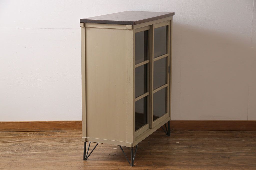 ラフジュ工房> キャビネット・戸棚> 食器棚・カップボード > ペイント家具 ゆらゆらガラスが懐かしさ漂う鉄脚付キャビネット(ガラス戸棚、飾り棚)
