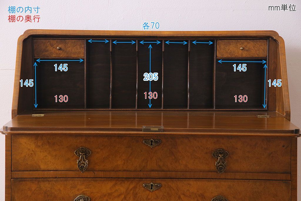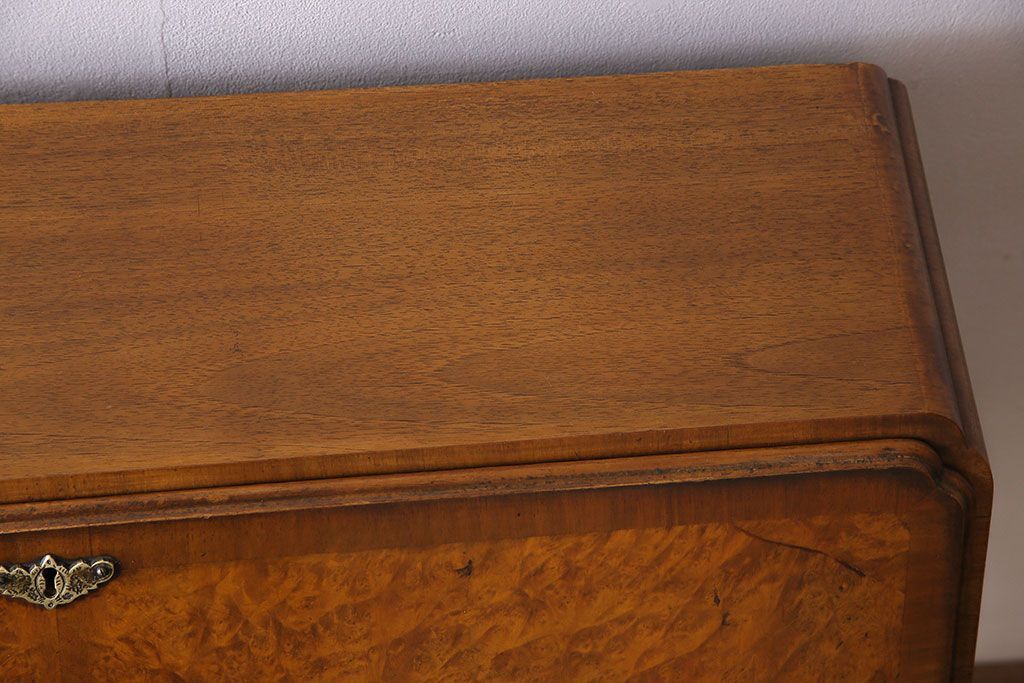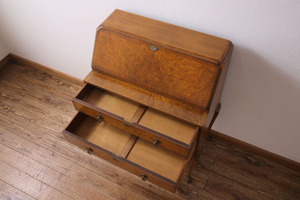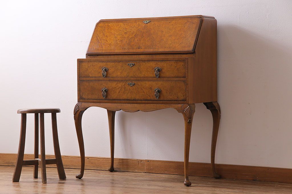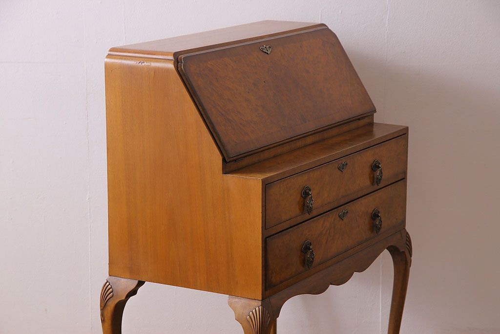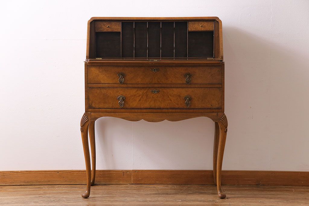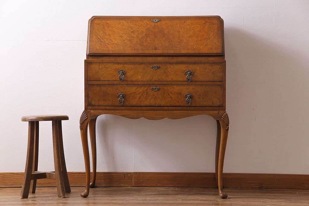 アンティーク家具 イギリスアンティーク ウォールナット バーズアイの杢目が高級感漂う猫脚ライティングビューロー(簿記机)