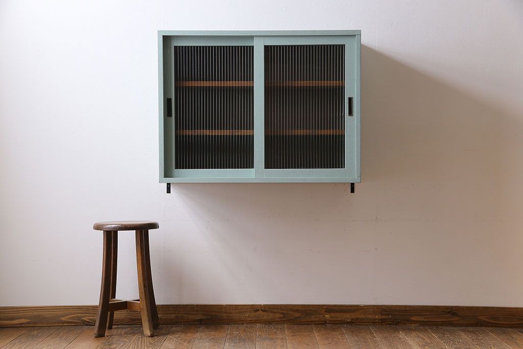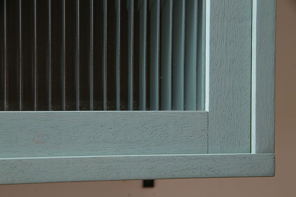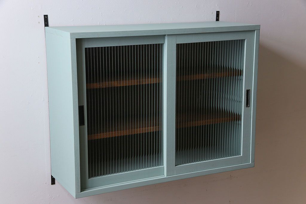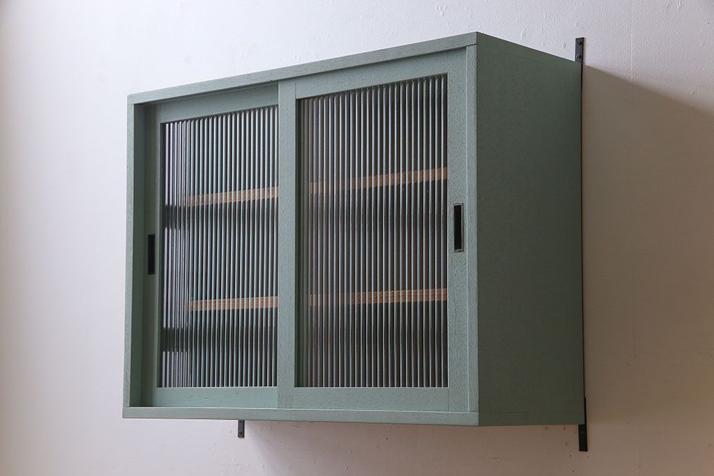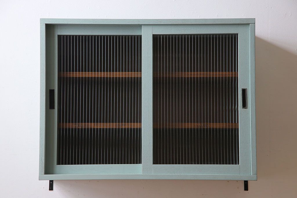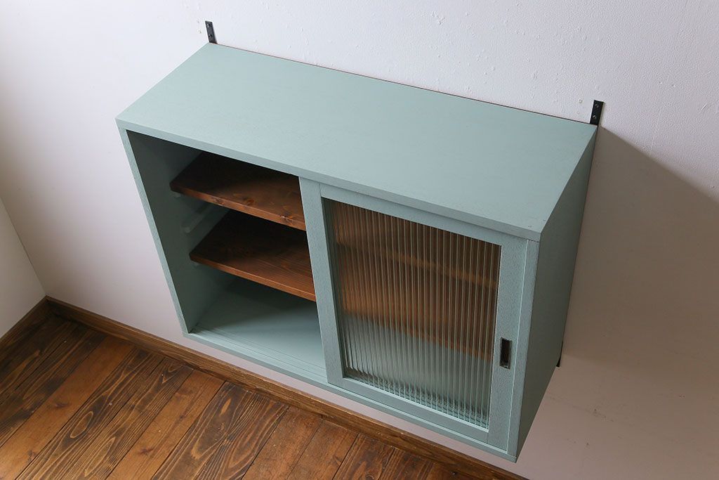 ラフジュ工房> キャビネット・戸棚 > ラフジュ工房オリジナル モールガラス入り 淡いグリーンペイントのウォールシェルフ(ウォールキャビネット、壁掛け収納棚、戸棚)