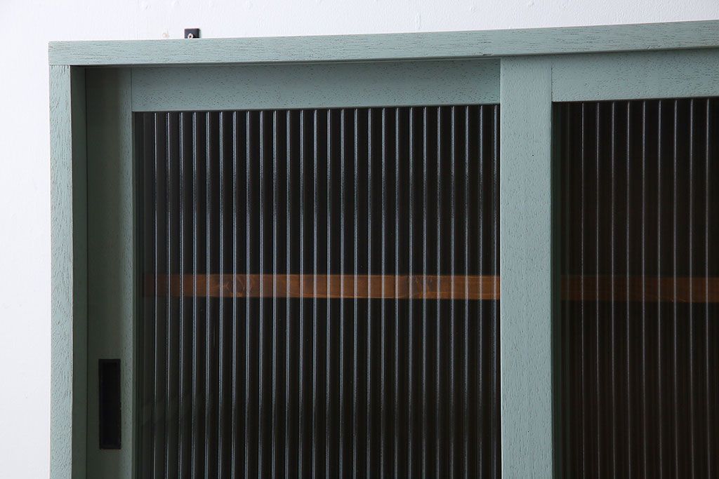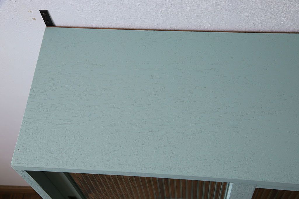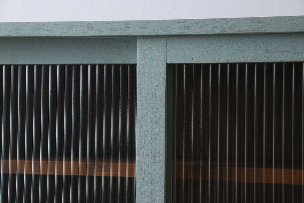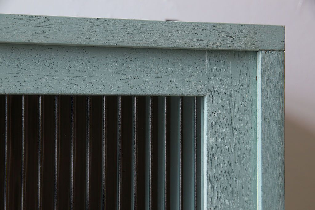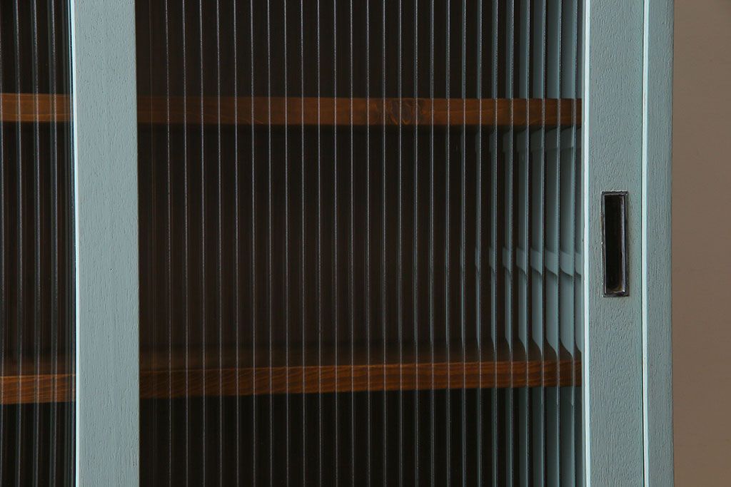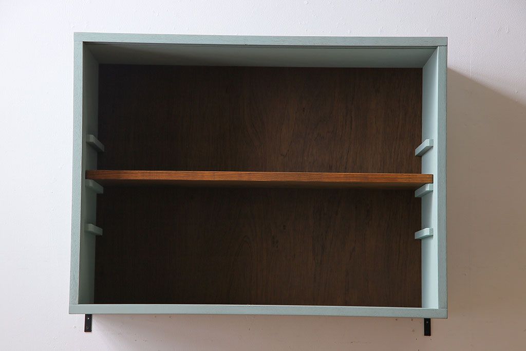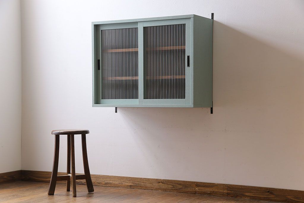 ラフジュ工房> キャビネット・戸棚 > ラフジュ工房オリジナル モールガラス入り 淡いグリーンペイントのウォールシェルフ(ウォールキャビネット、壁掛け収納棚、戸棚)