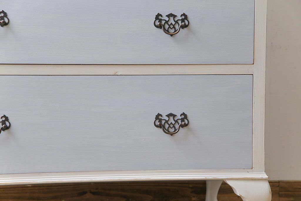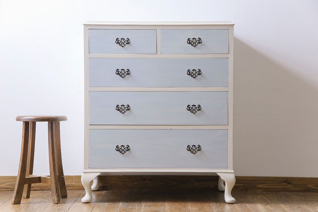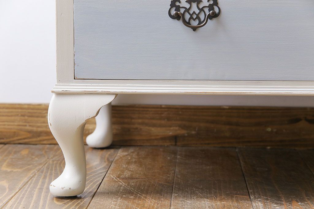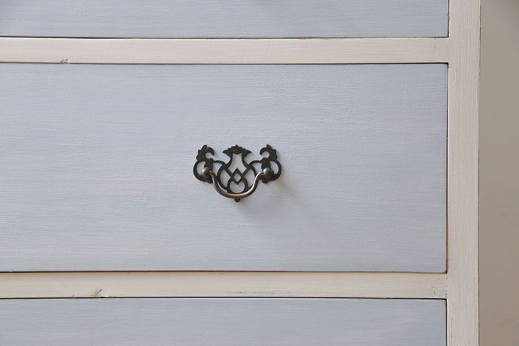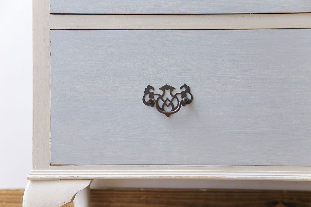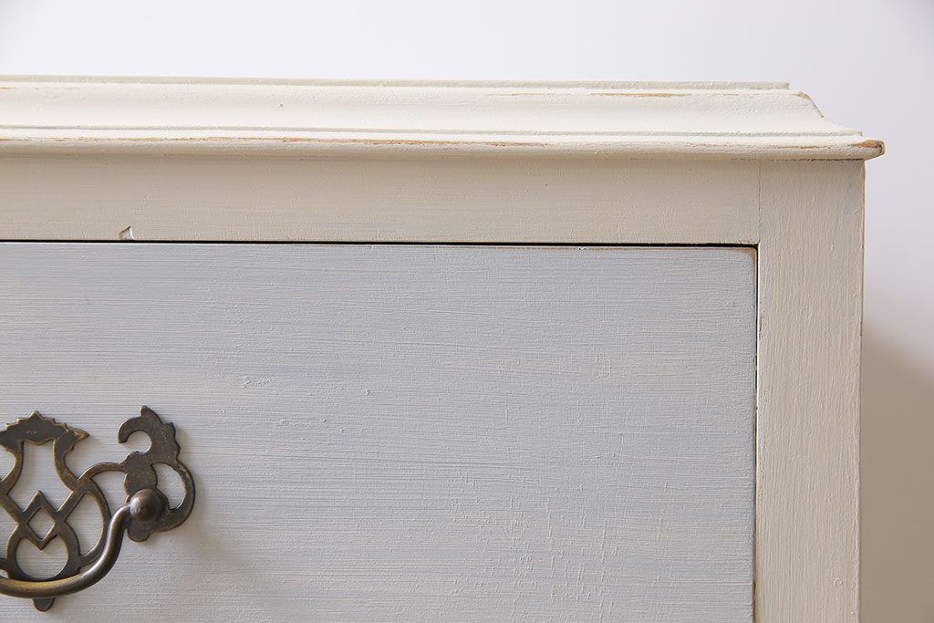 アンティーク家具 イギリスアンティーク 淡い色合いと上品なデザインが魅力のペイントチェスト(サイドチェスト、引き出し)