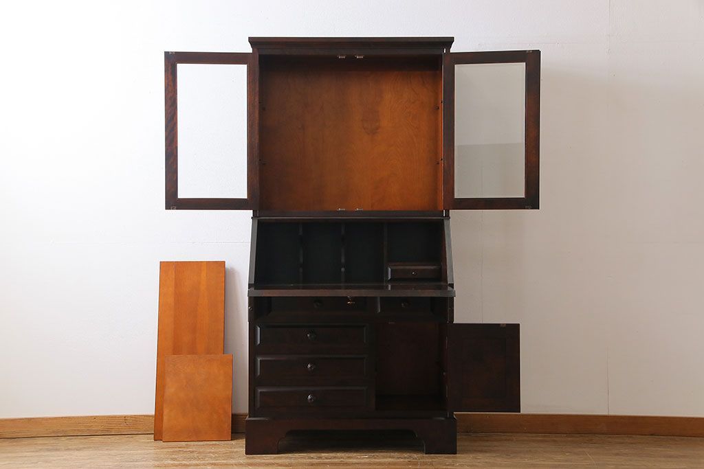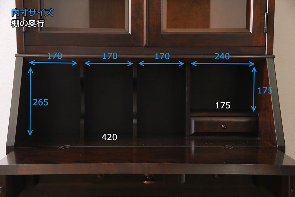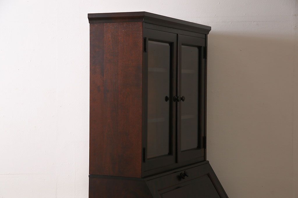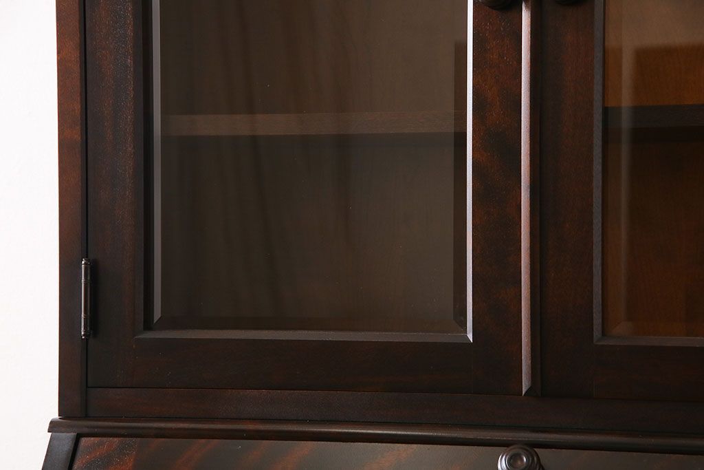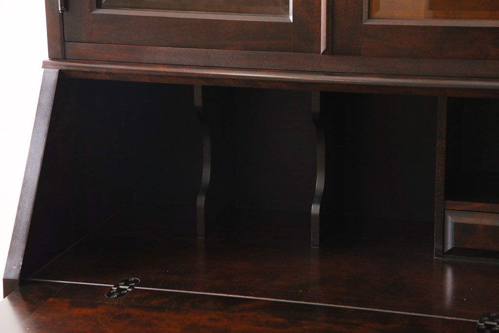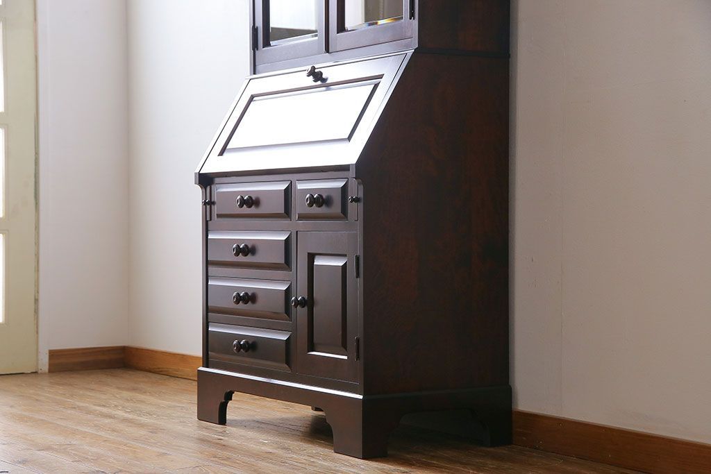 ぬくもりと安らぎに包まれるような天然木の質感で人気の北海道民芸家具のライティングビューローです。北海道民芸家具は、末永く使える作りの良さにも定評があります。深みのある色合いと、艶やかな質感が目を引き、上品な雰囲気を漂わせる一品です。細かな収納がたくさん付いており、文具や紙類など細かなものも整理しやすく便利にお使いいただけます。このようにガラス戸棚の付いたライティングビューローは中古市場では珍しく希少ですよ。リビングや書斎でのちょっとしたワークスペースなどに是非いかがでしょうか。