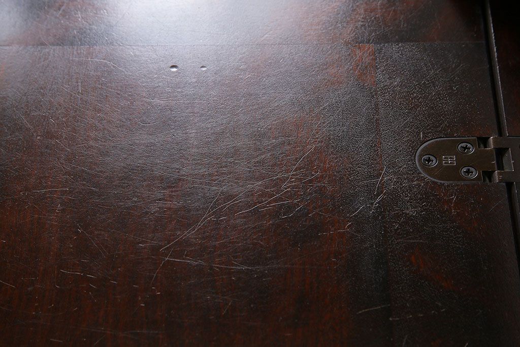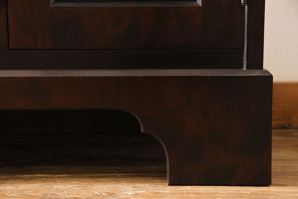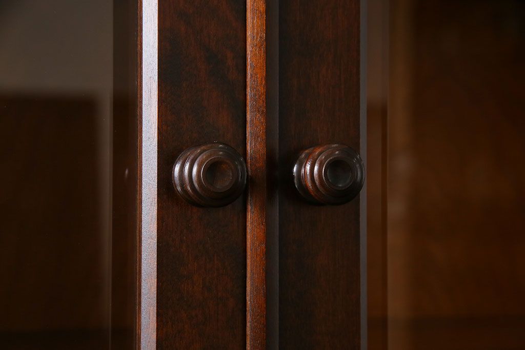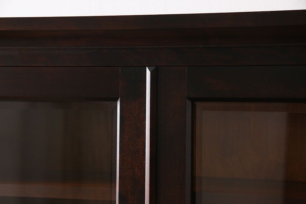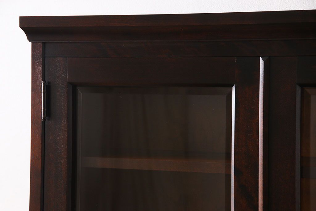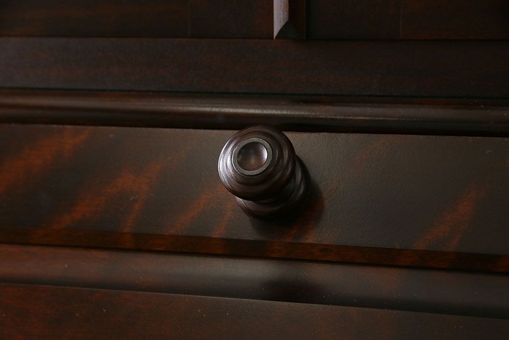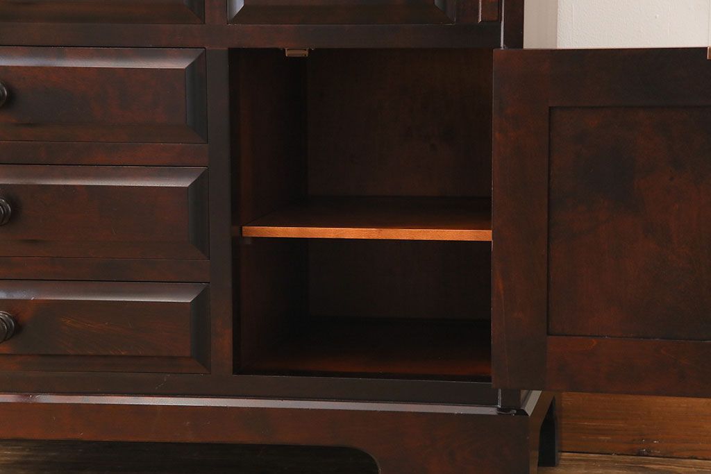 ぬくもりと安らぎに包まれるような天然木の質感で人気の北海道民芸家具のライティングビューローです。北海道民芸家具は、末永く使える作りの良さにも定評があります。深みのある色合いと、艶やかな質感が目を引き、上品な雰囲気を漂わせる一品です。細かな収納がたくさん付いており、文具や紙類など細かなものも整理しやすく便利にお使いいただけます。このようにガラス戸棚の付いたライティングビューローは中古市場では珍しく希少ですよ。リビングや書斎でのちょっとしたワークスペースなどに是非いかがでしょうか。
