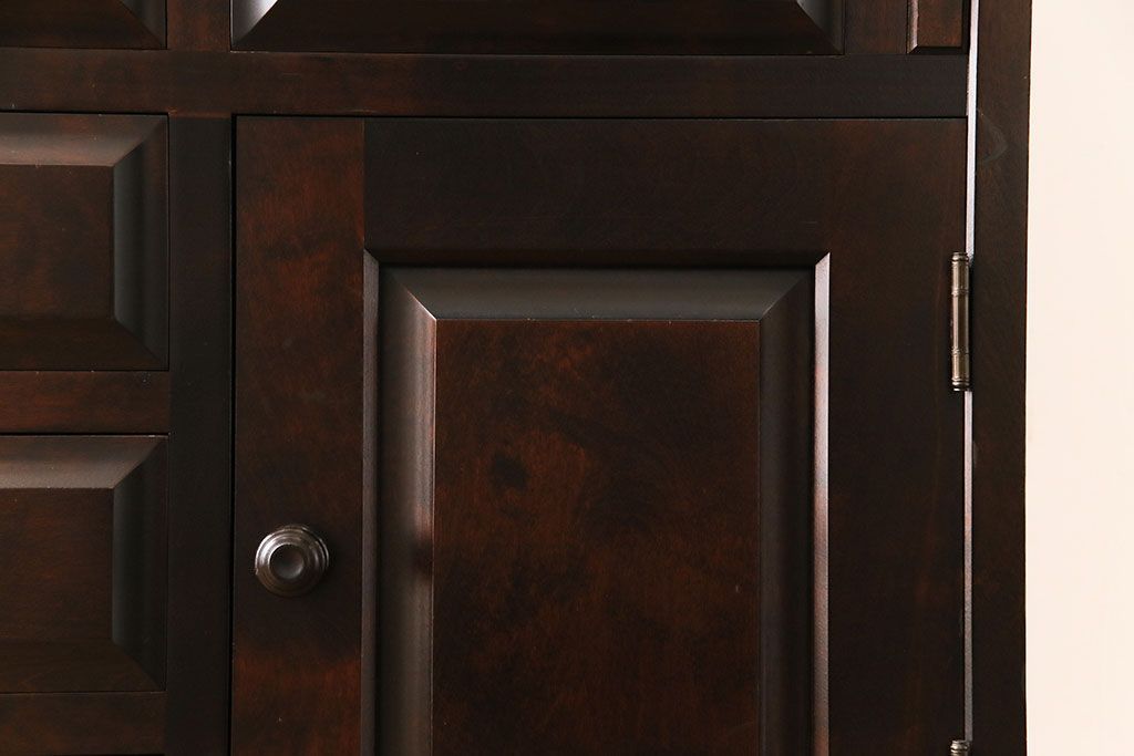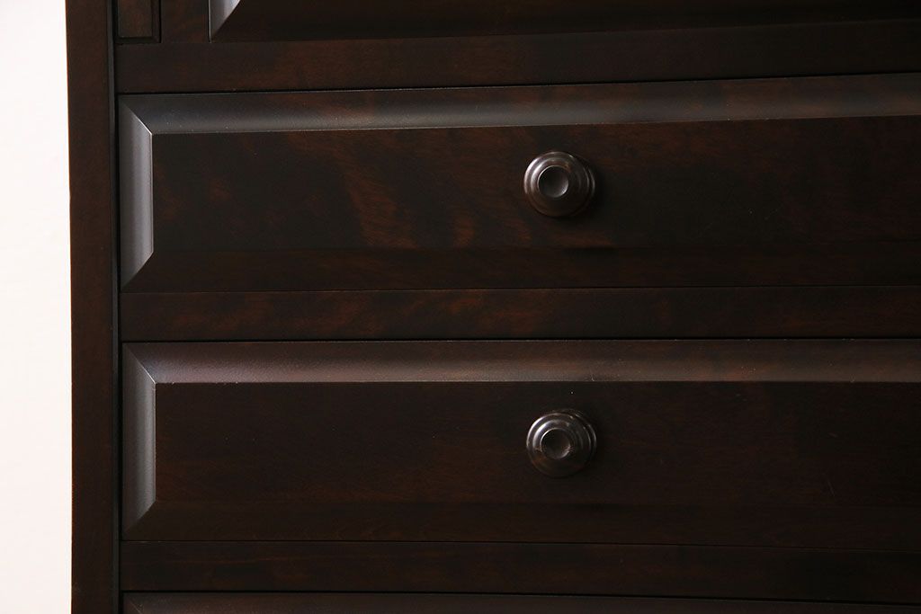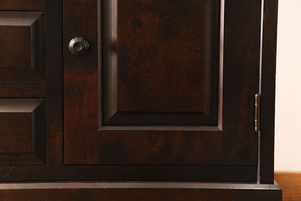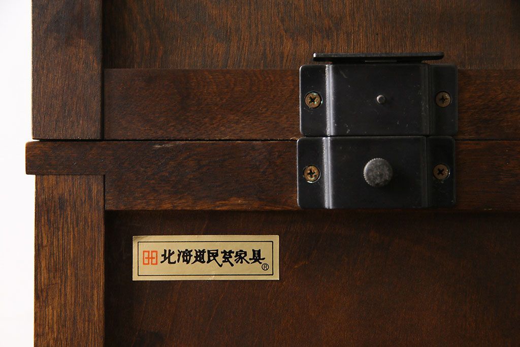 引き出しには北海道民芸家具の焼印が施されています。また、最後の画像にあるように、家具の背面にはブランドシールもしっかりと残っています。