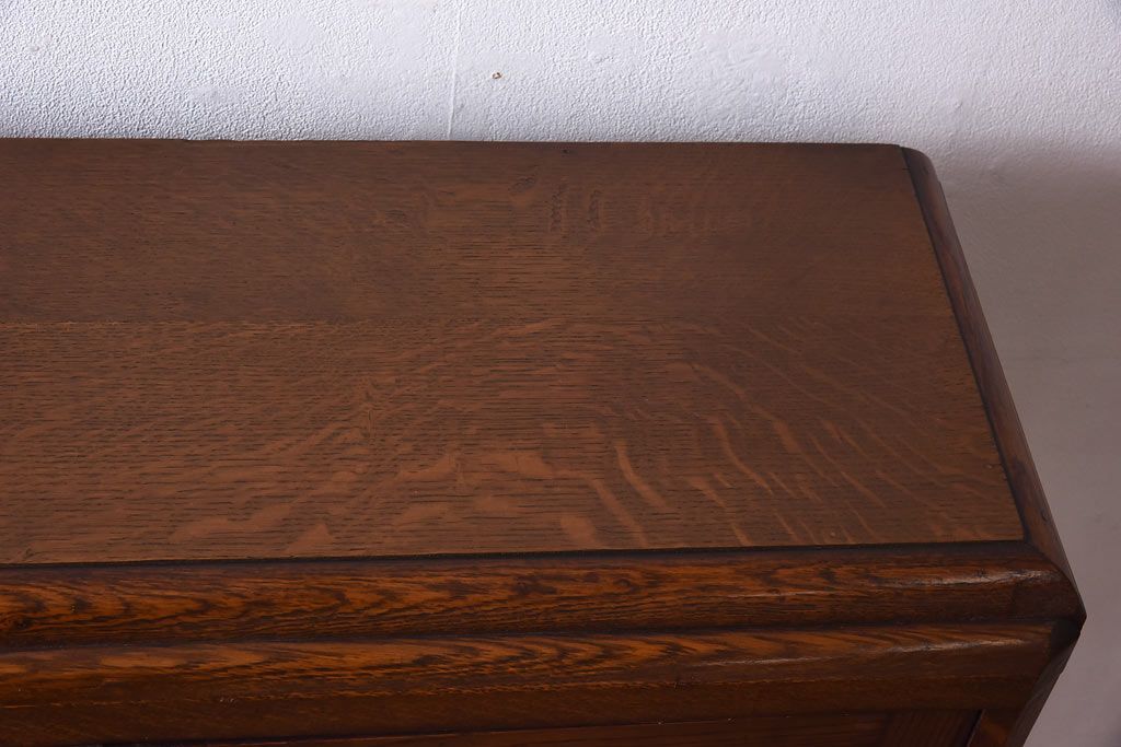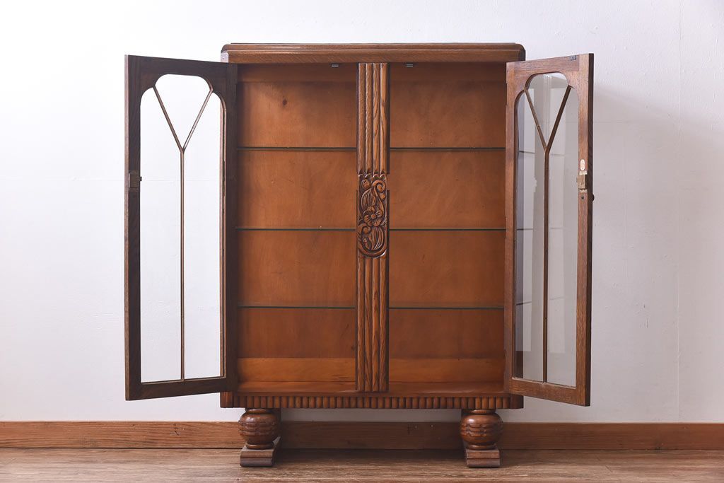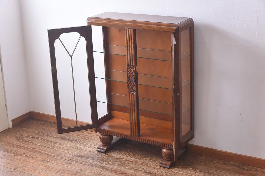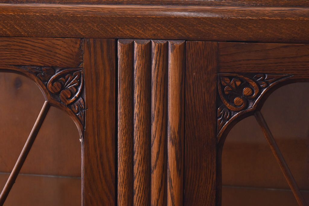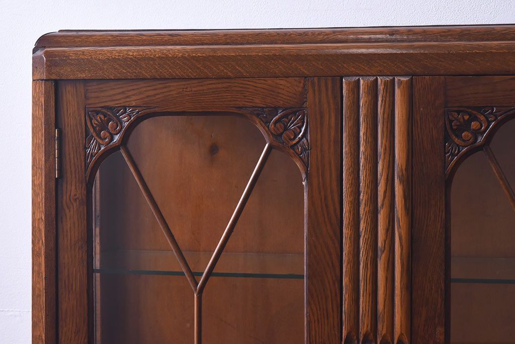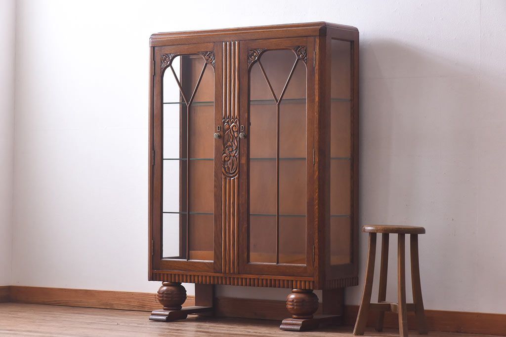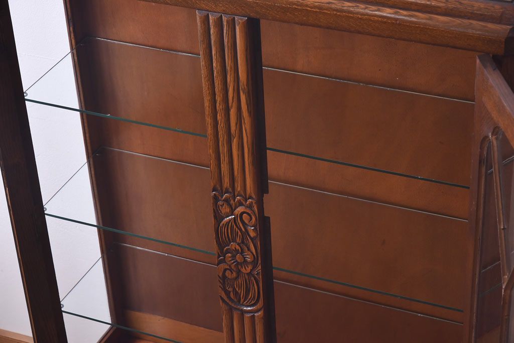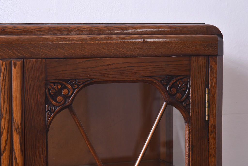 アンティーク家具 イギリスアンティーク オーク材 植物モチーフの意匠が魅力のショーケース(ガラスケース、キャビネット)