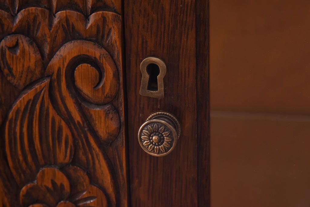 ラフジュ工房> ガラスケース・ショーケース > アンティーク家具 イギリスアンティーク オーク材 植物モチーフの意匠が魅力のショーケース(ガラスケース、キャビネット)