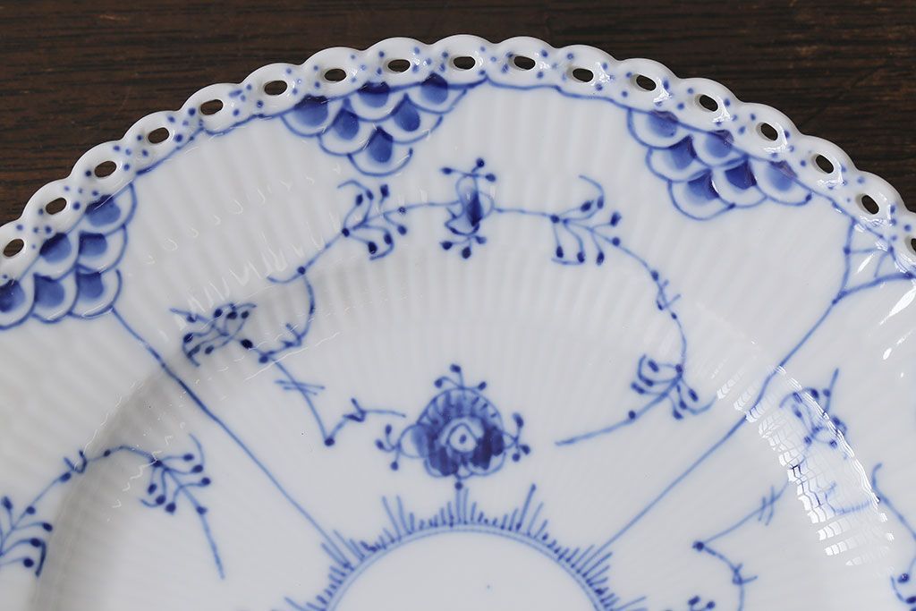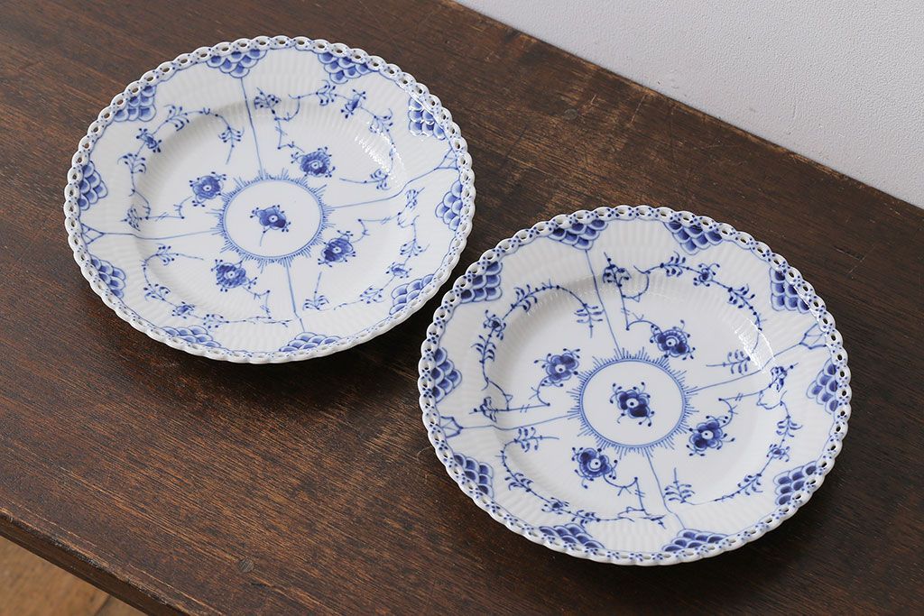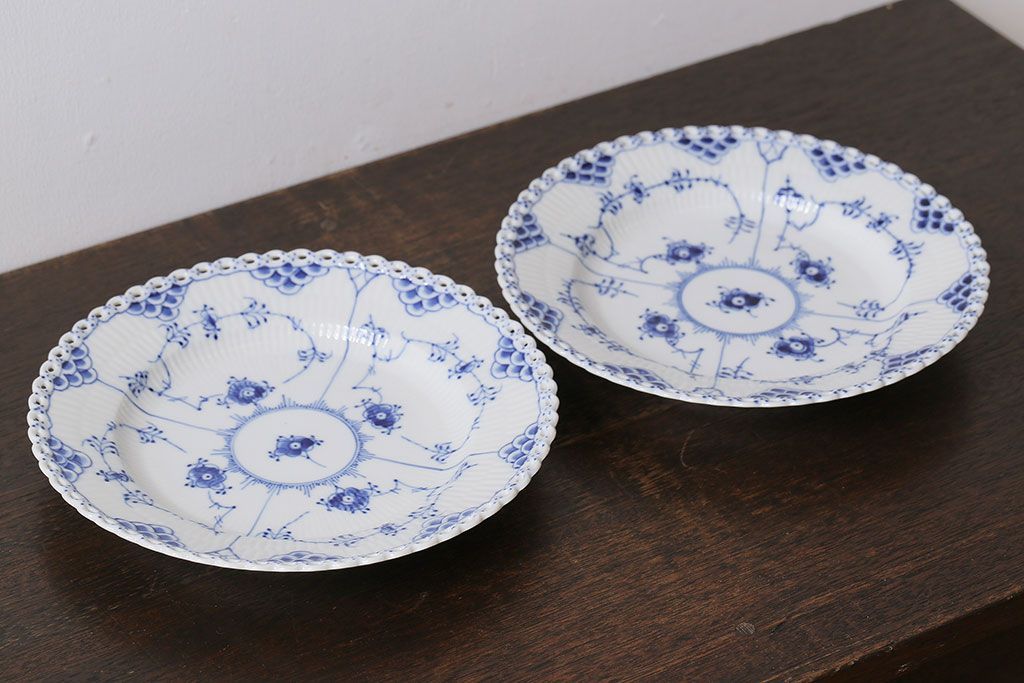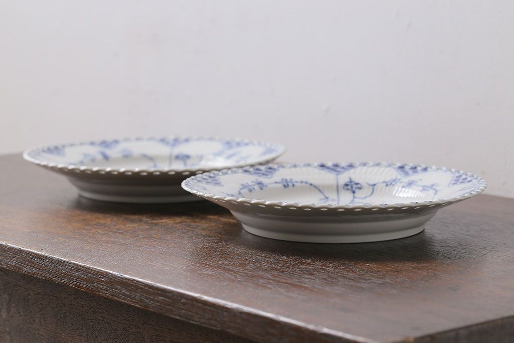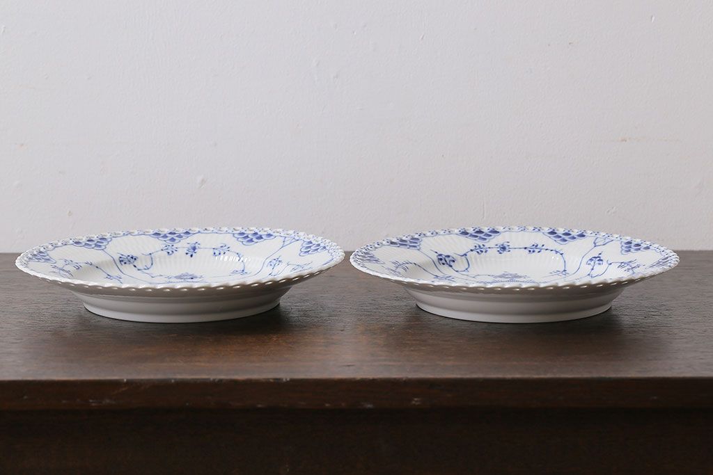 アンティーク雑貨 中古 ROYAL COPENHAGEN(ロイヤルコペンハーゲン) ブルーフルーテッド フルレース 23cmプレート2枚セット(ディーププレート、洋食器)(定価約7万6千円)(2)