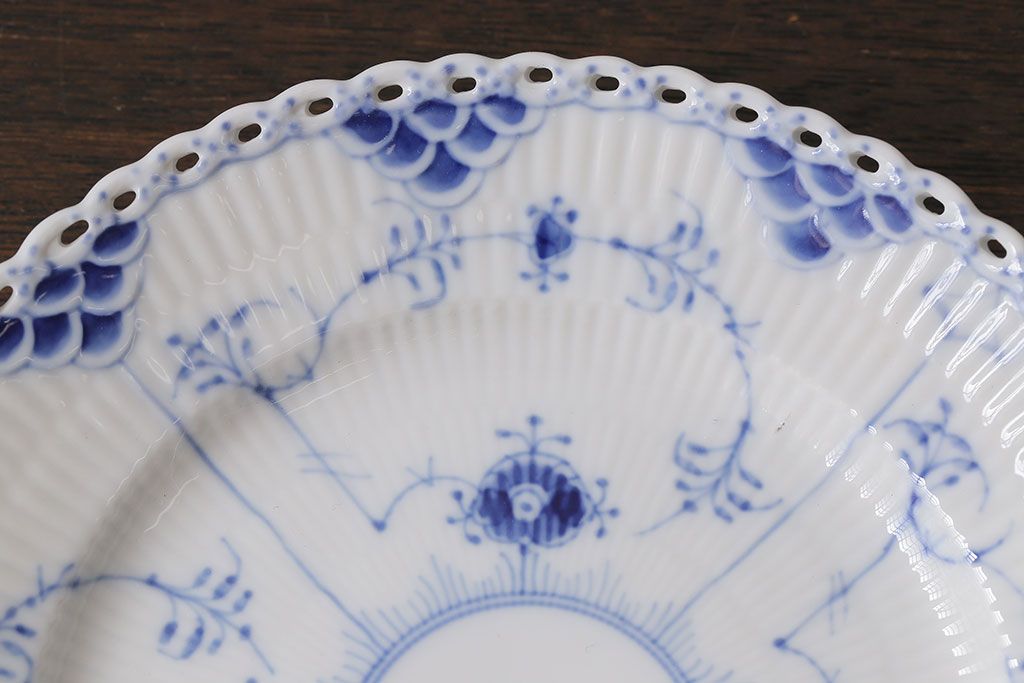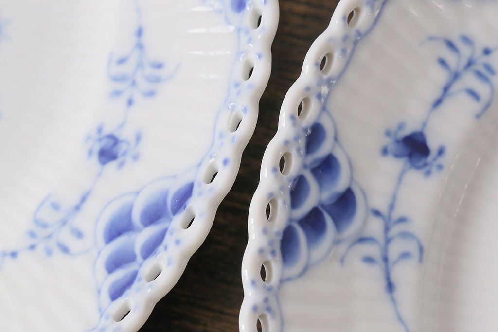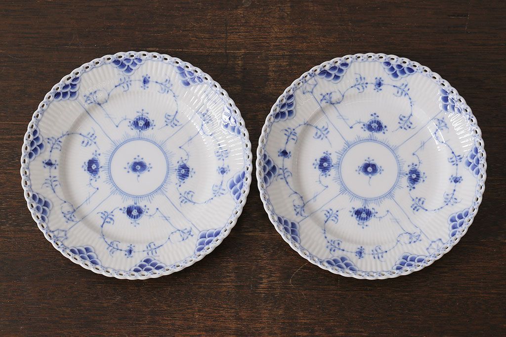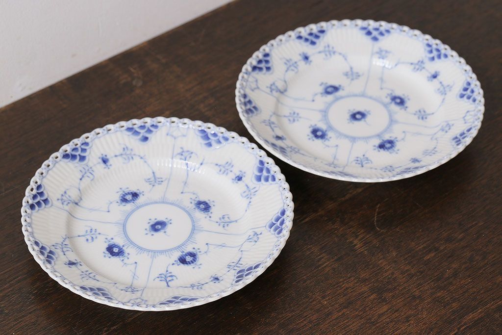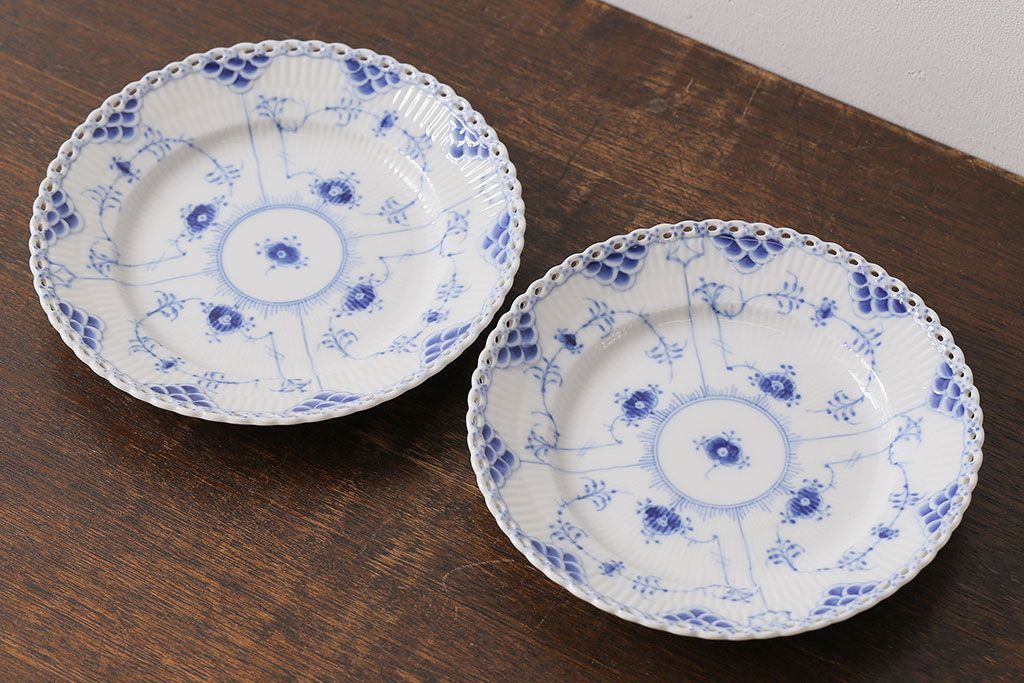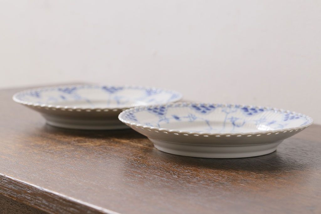 アンティーク雑貨 中古 ROYAL COPENHAGEN(ロイヤルコペンハーゲン) ブルーフルーテッド フルレース 19.5cmプレート2枚セット(ディーププレート、洋食器)(定価約6万5千円)(2)