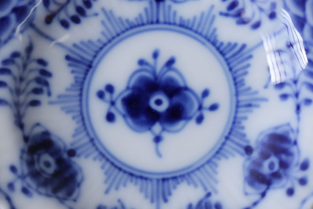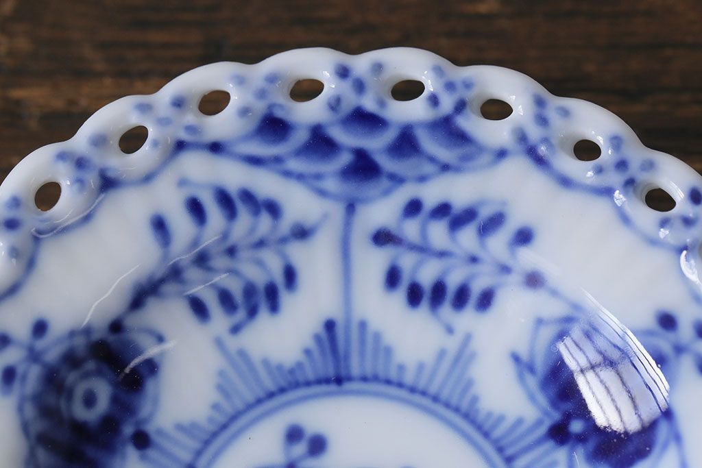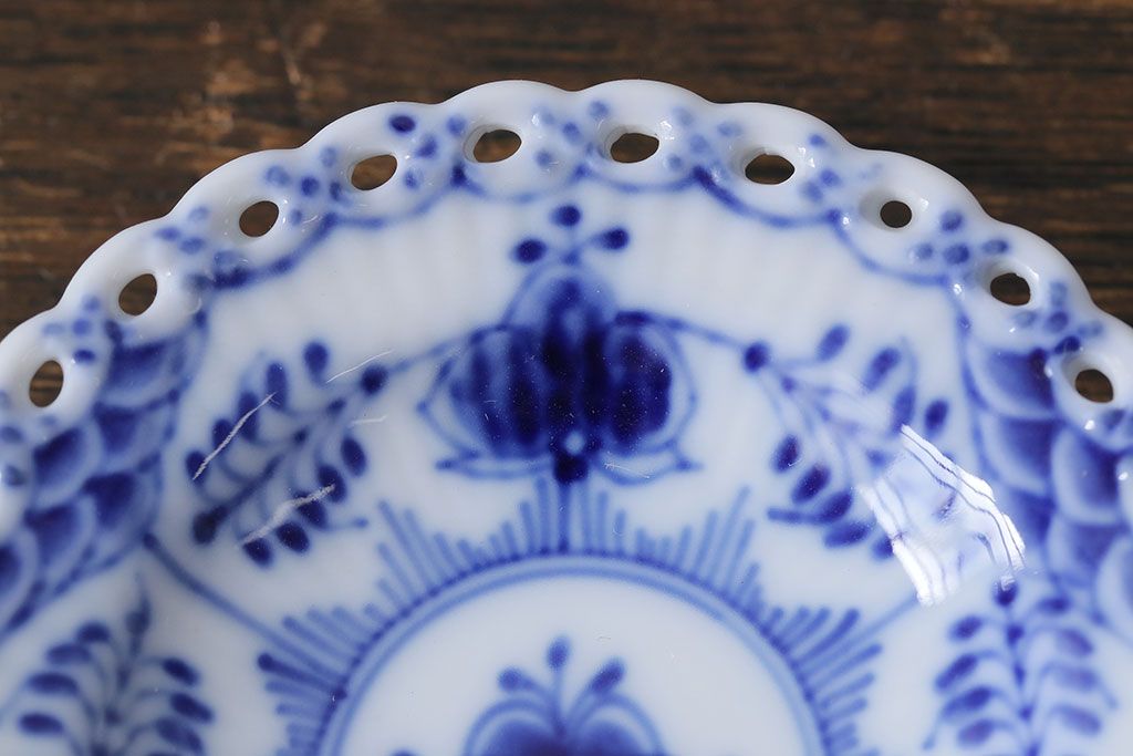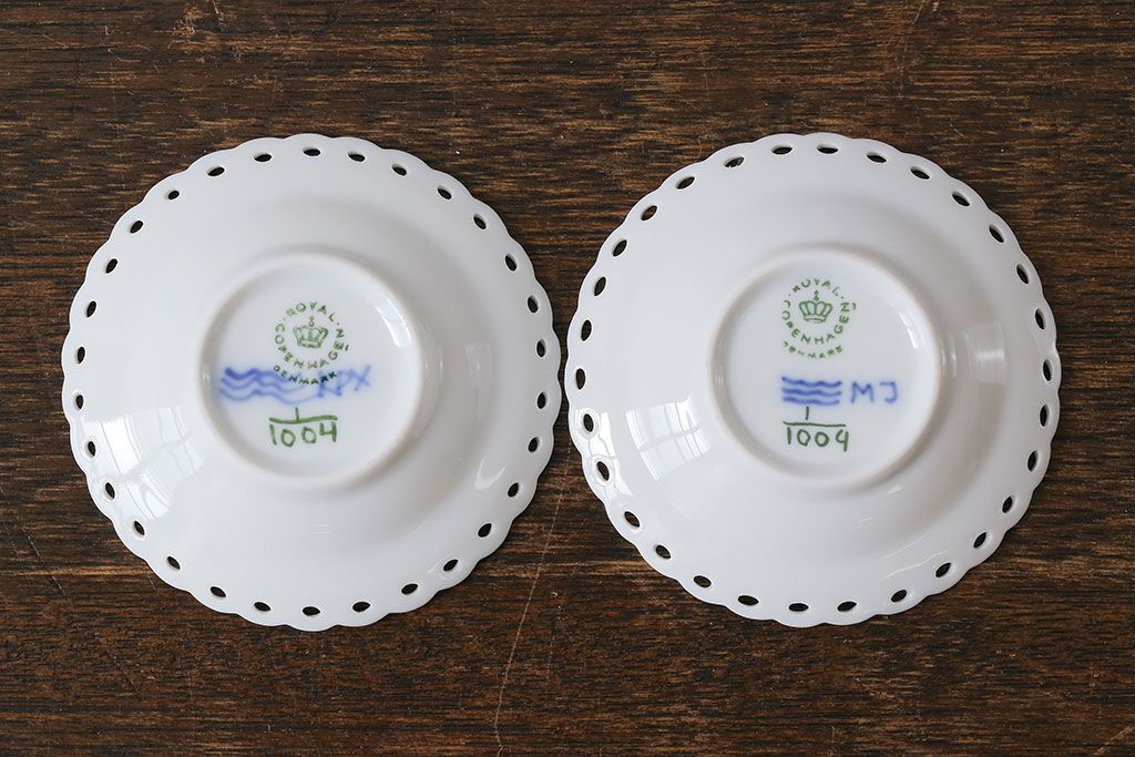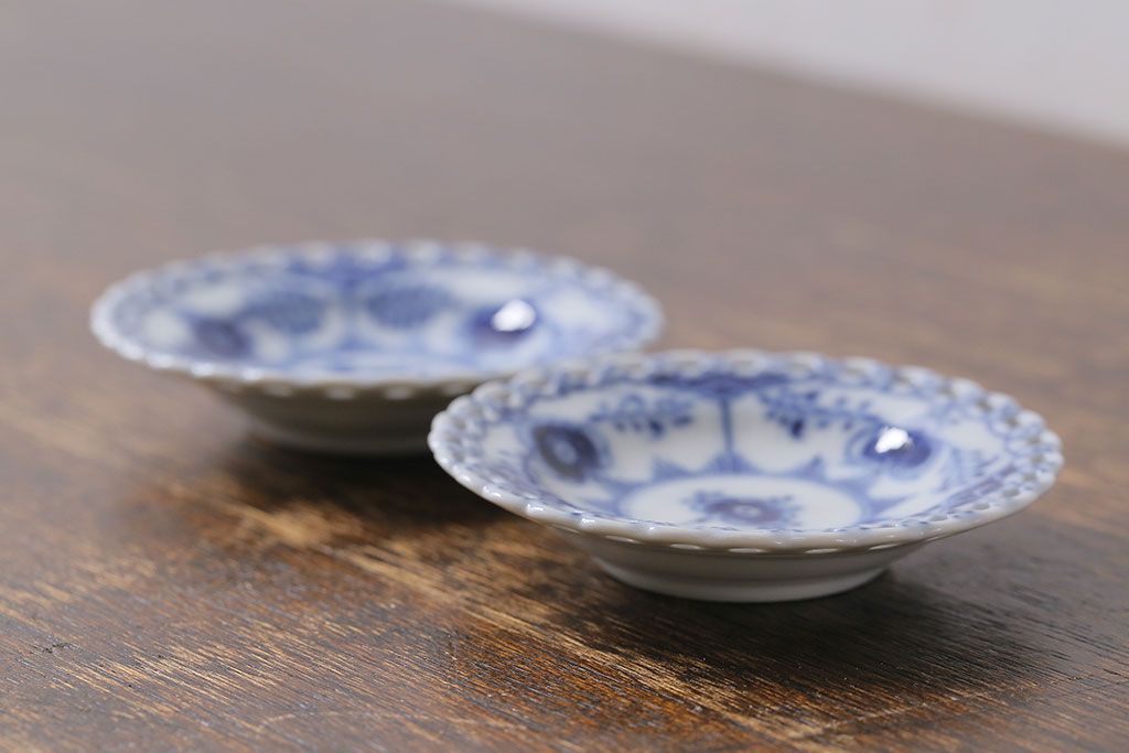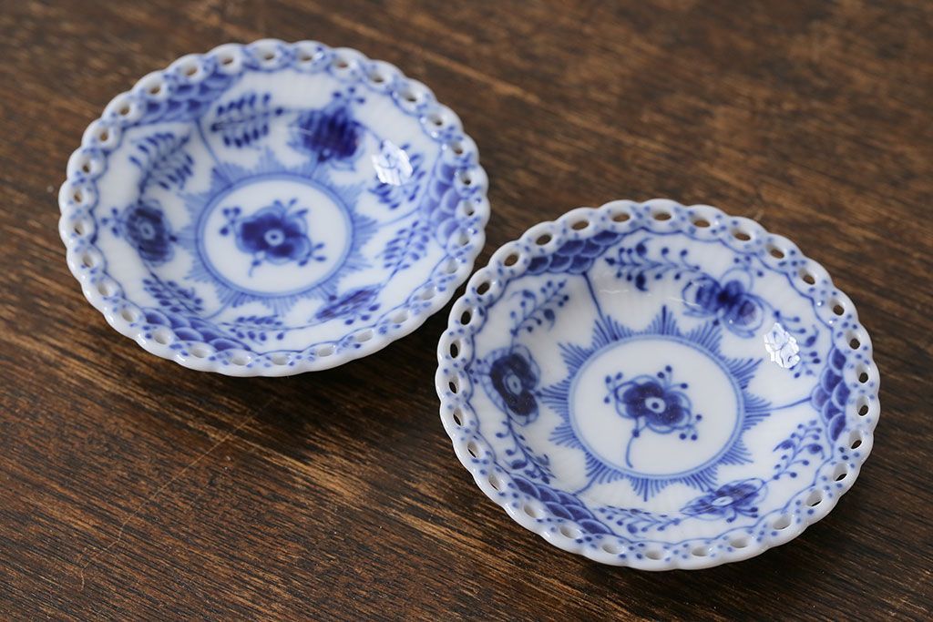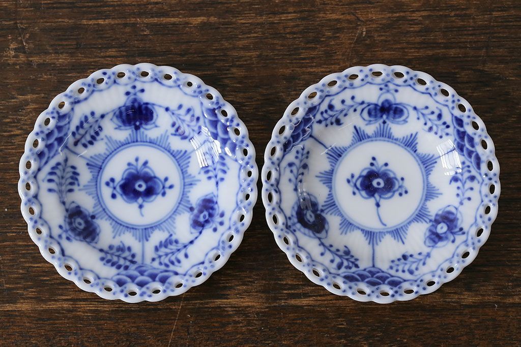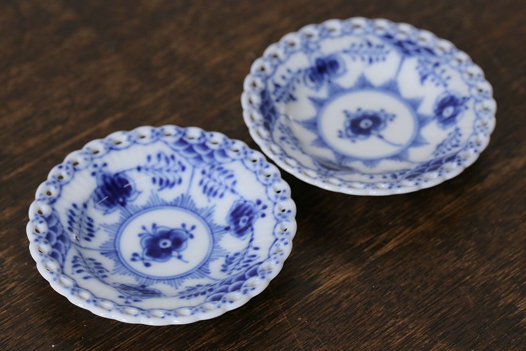 アンティーク雑貨 中古 ROYAL COPENHAGEN(ロイヤルコペンハーゲン) ブルーフルーテッド フルレース 7.5cmバタープレート2枚セット(ミニプレート)(定価約2万4千円)(2)