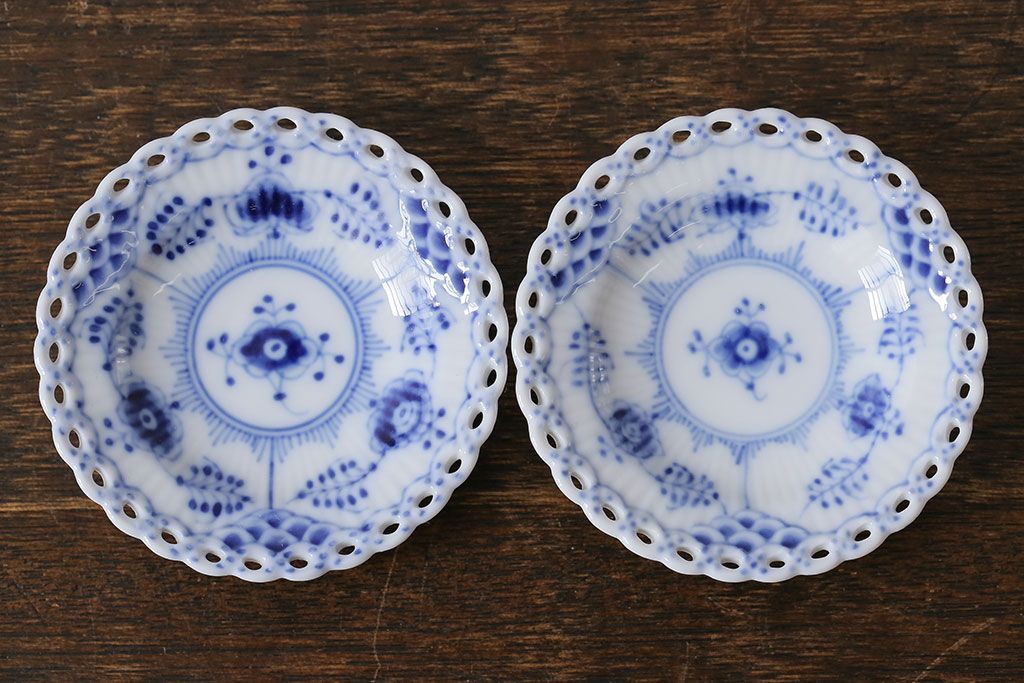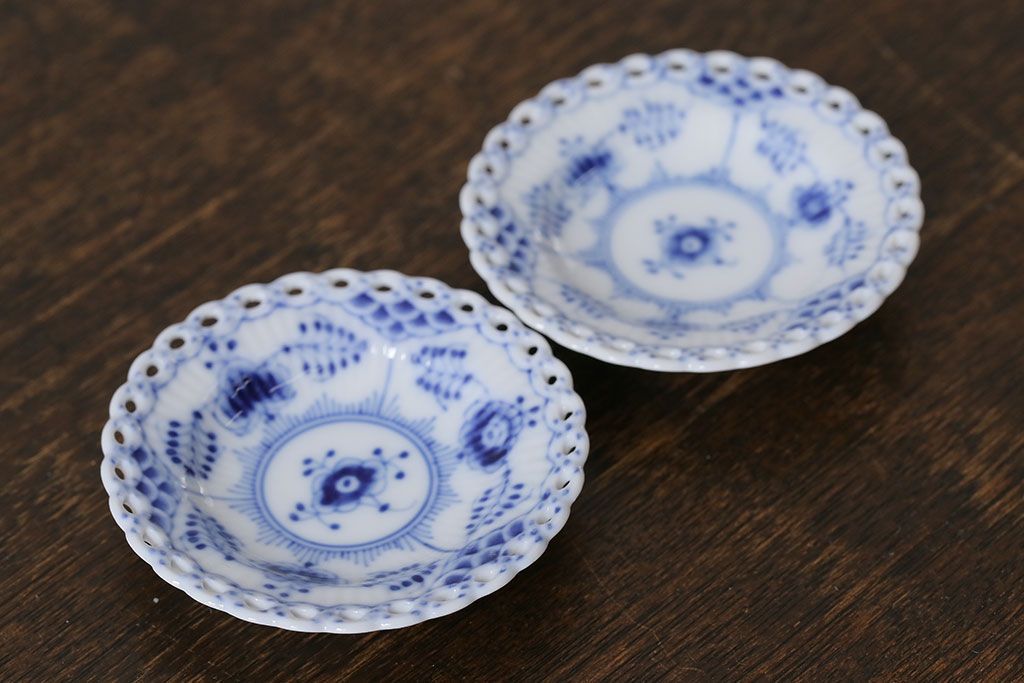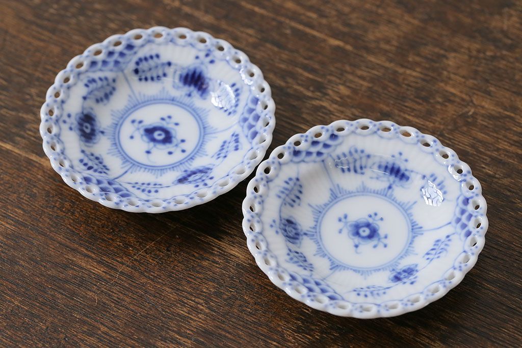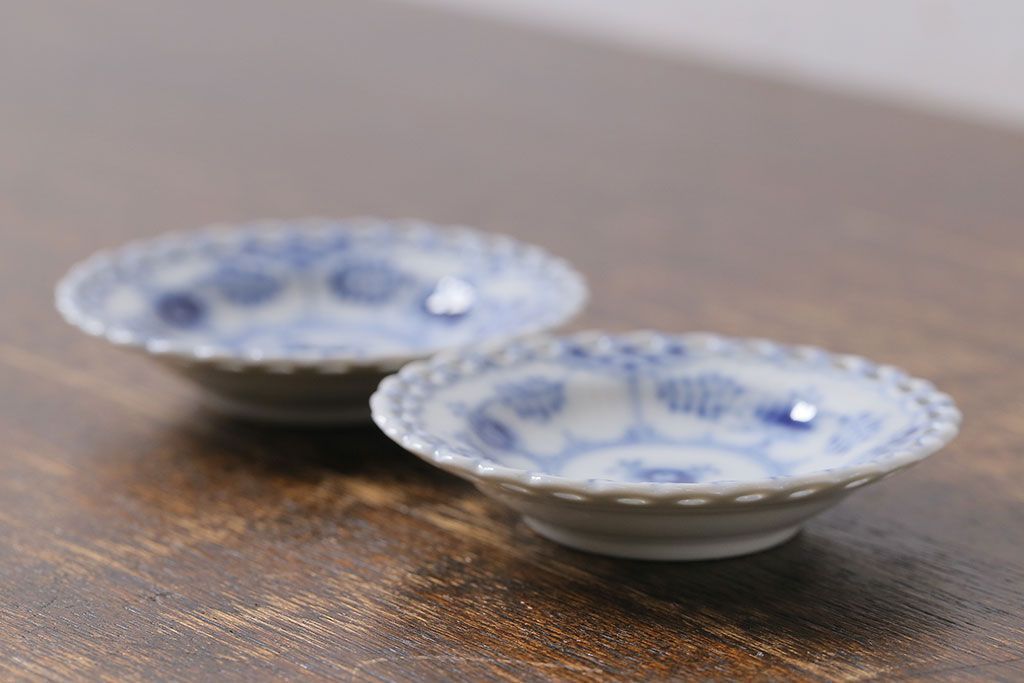 アンティーク雑貨 中古 ROYAL COPENHAGEN(ロイヤルコペンハーゲン) ブルーフルーテッド フルレース 7.5cmバタープレート2枚セット(ミニプレート)(定価約2万4千円)(3)