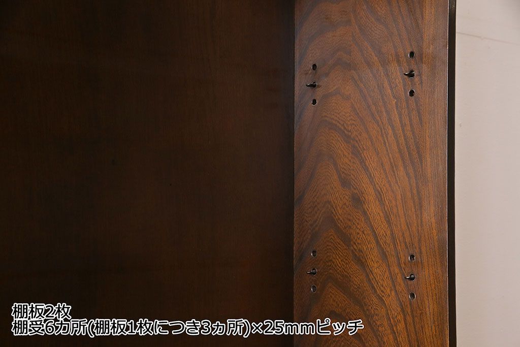 棚板は上2段のみ取り外しできます。棚板は2枚あります。棚受け穴は6ヶ所、25mmピッチで調整できます。棚幅サイズのものが1枚の作りです。