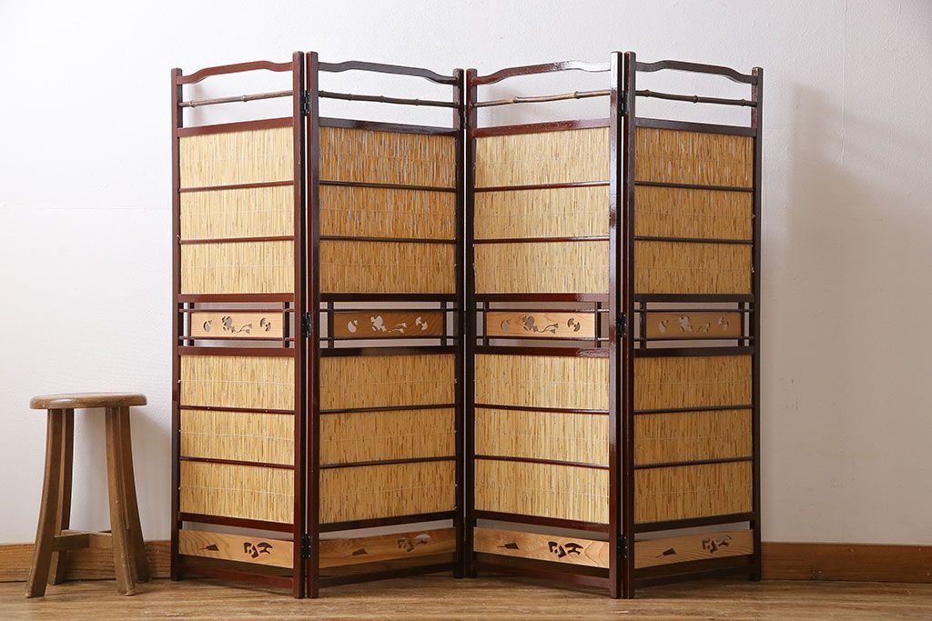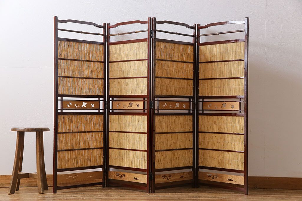 アンティーク雑貨 昭和中期 透かし彫りが上品な四連折り畳み式パーテーション(衝立、仕切り)