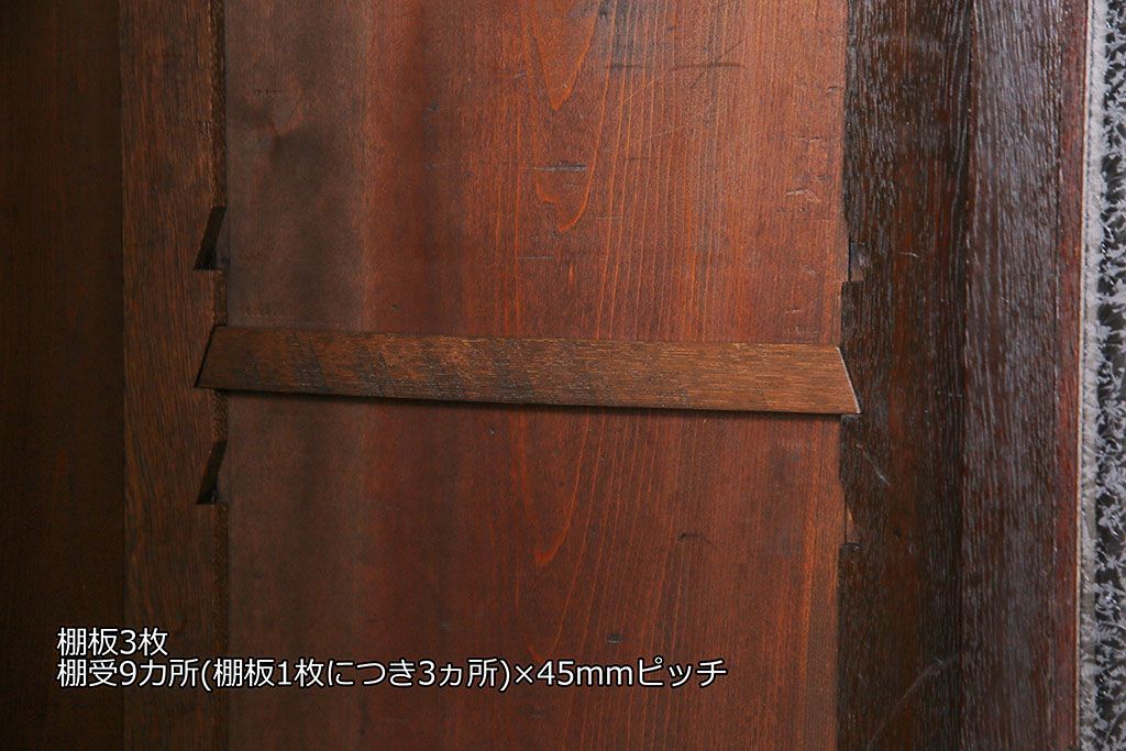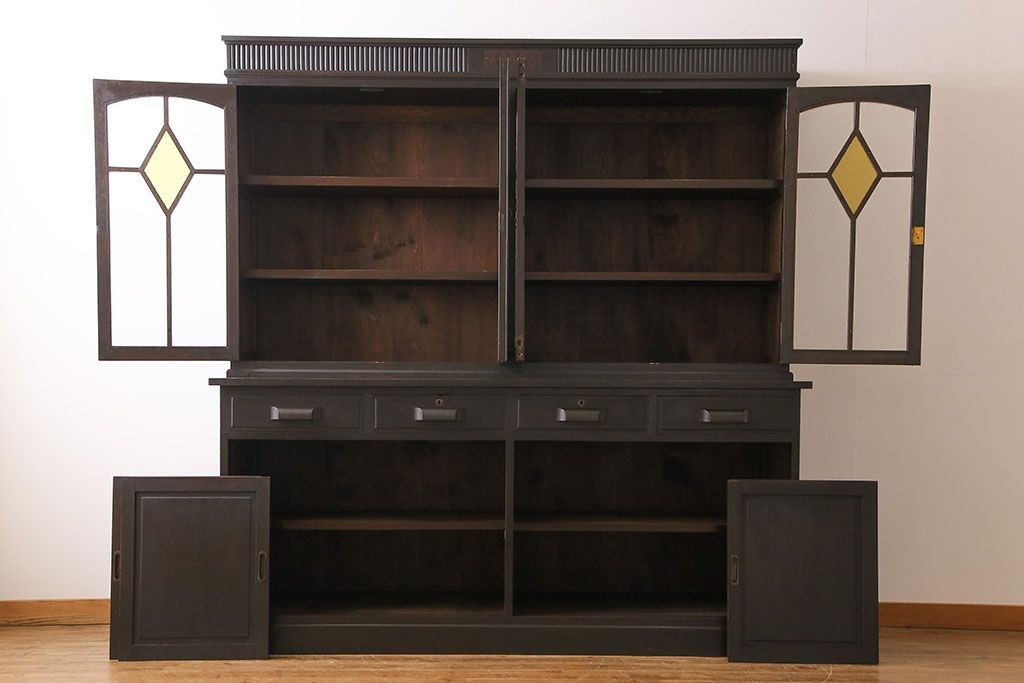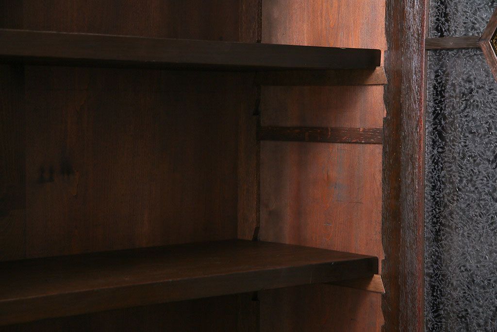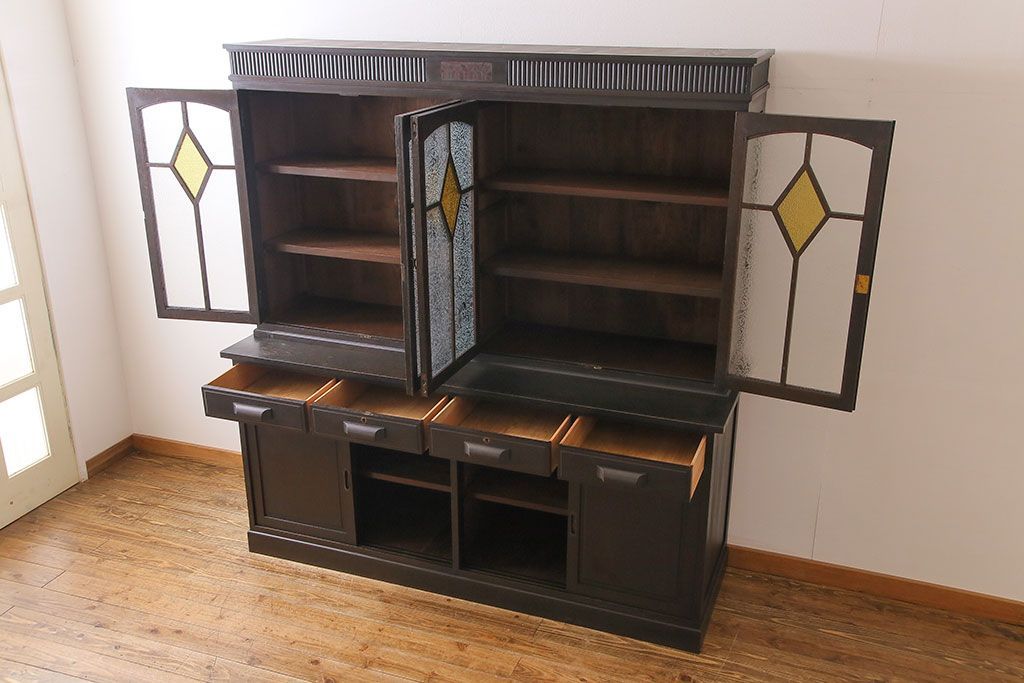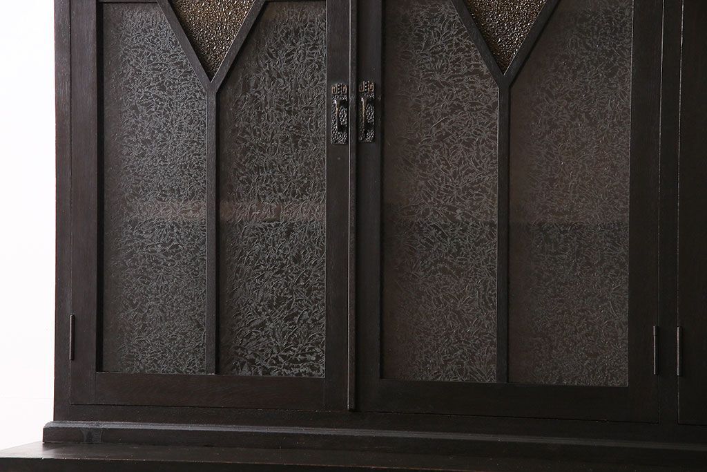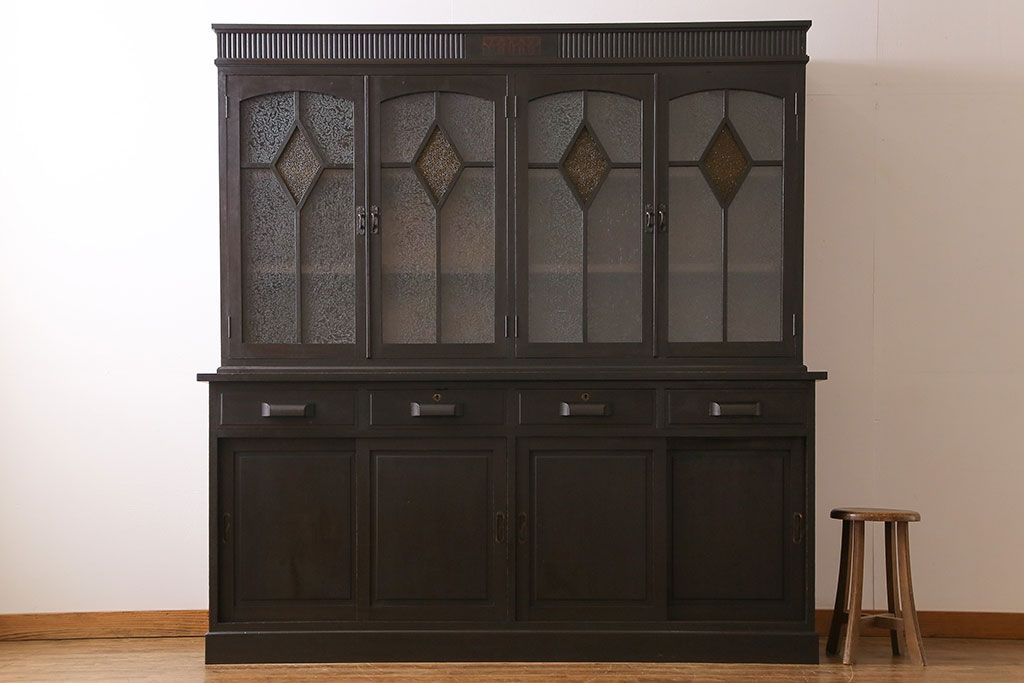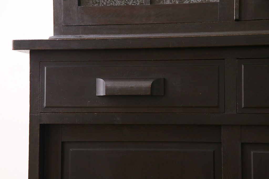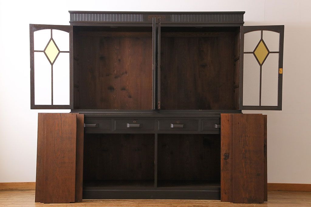 ラフジュ工房> キャビネット・戸棚> 食器棚・カップボード > レトロ家具 和製アンティーク ナラ材 当時物色ガラス入り!レトロモダンな大型食器棚(キャビネット、カップボード、収納棚)