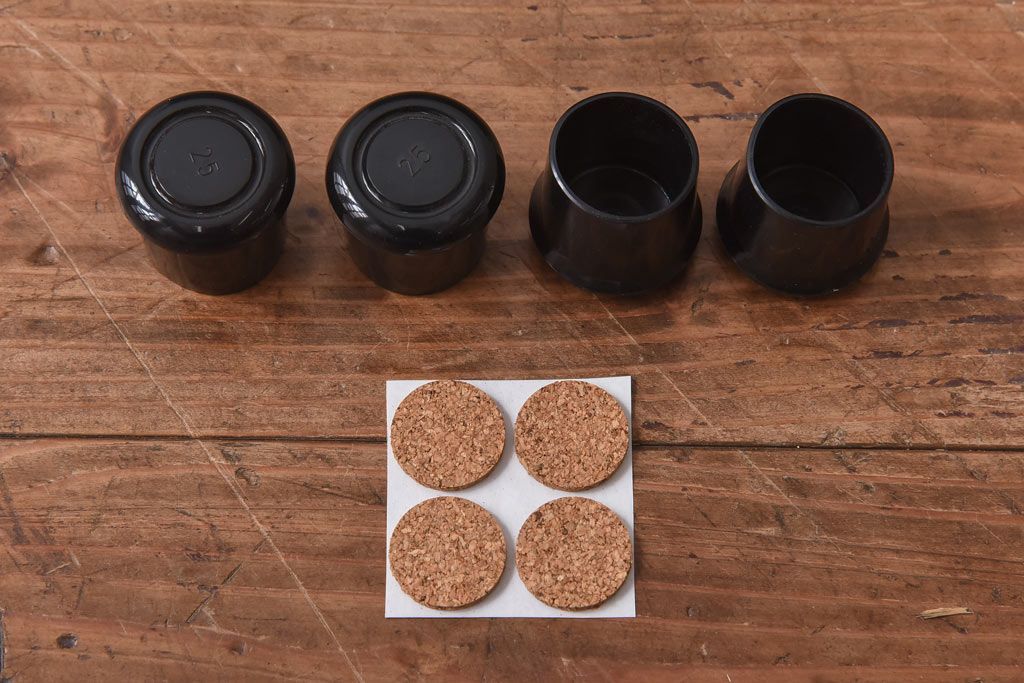 最後の画像にありますように、脚の先端用のゴムキャップと、がたつき調整のコルクが付属します。