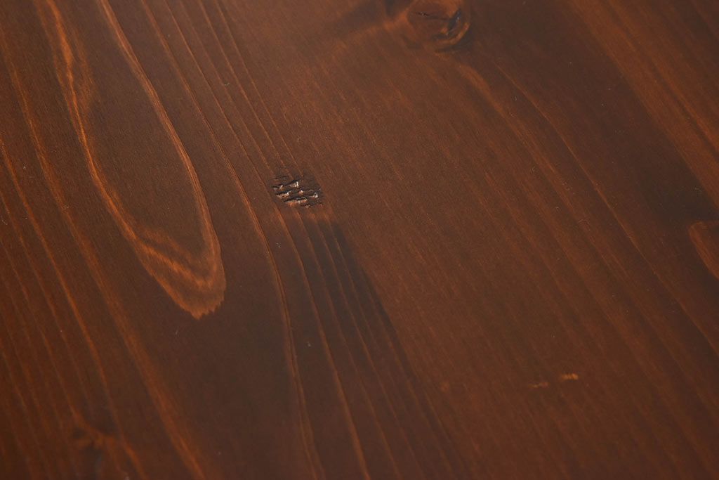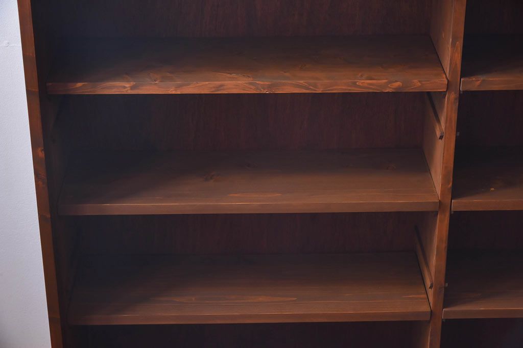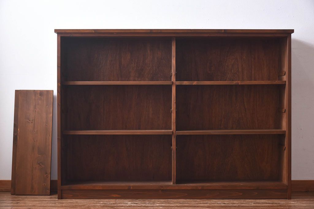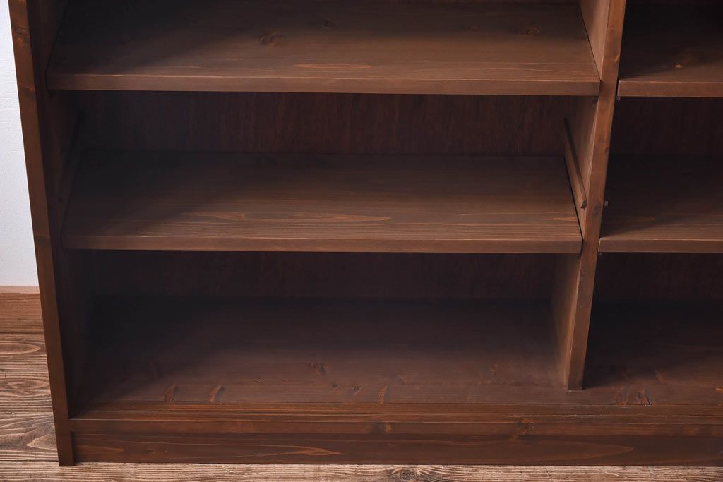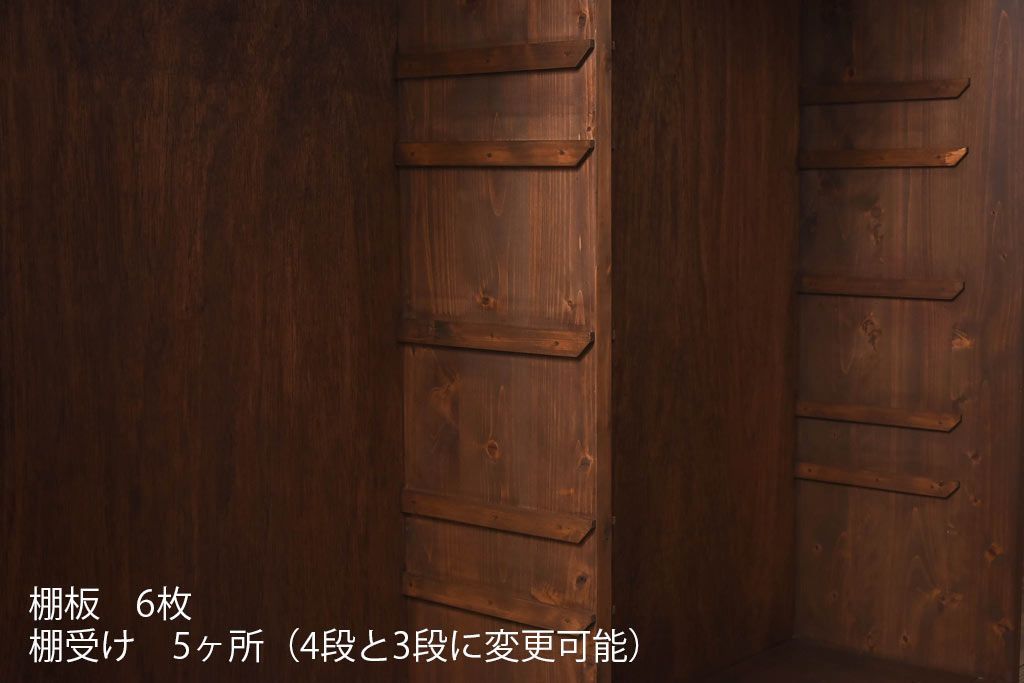 棚板は取り外しできます。棚板は6枚あります。棚受けは5ヶ所、4段と3段に調整できます。棚幅サイズのものが1枚の作りです。