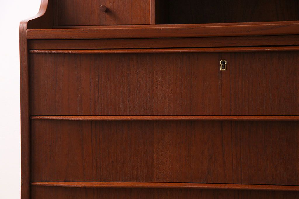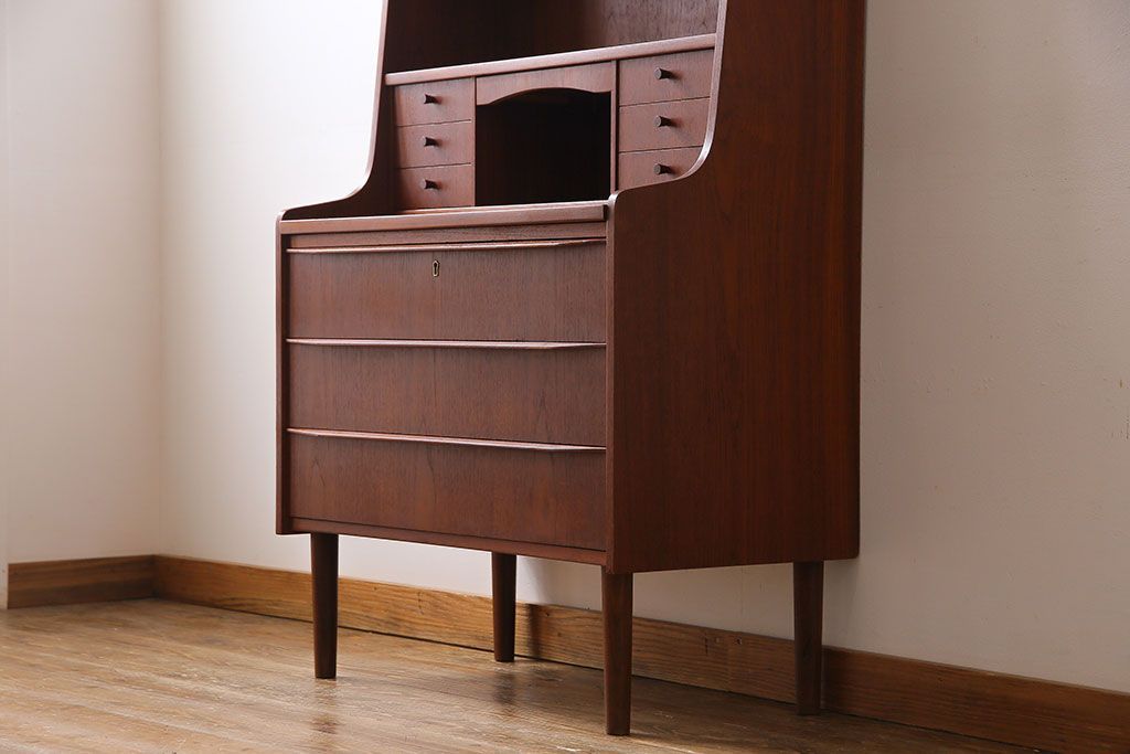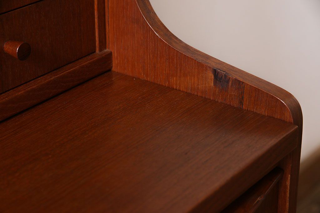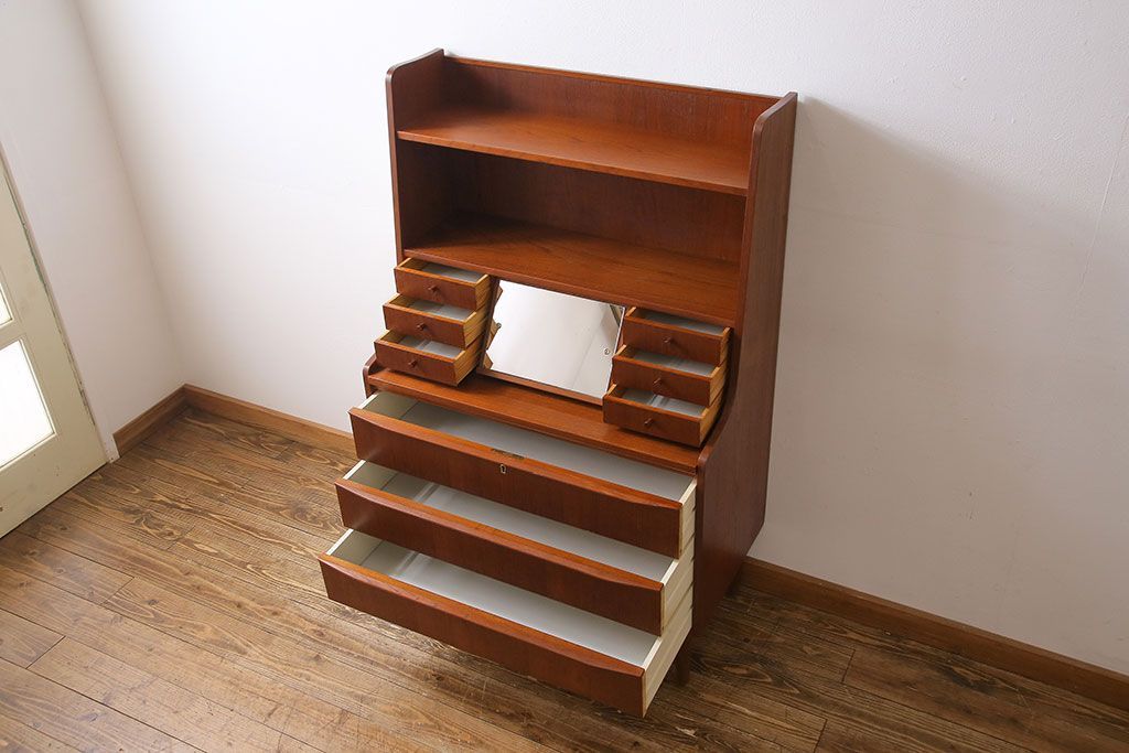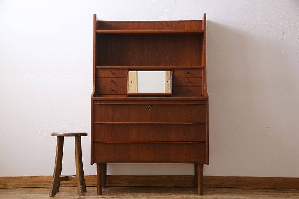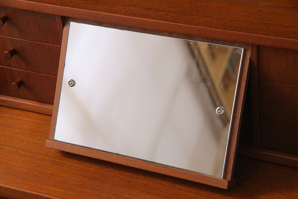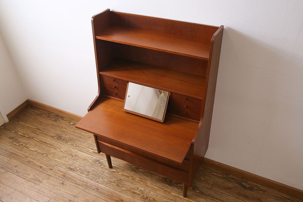 ヴィンテージ家具 北欧ビンテージ デンマーク チーク材 おしゃれで機能的な鏡付きビューロー(デスク、在宅ワーク、在宅用ドレッサー、ドレッシングチェスト、本棚)