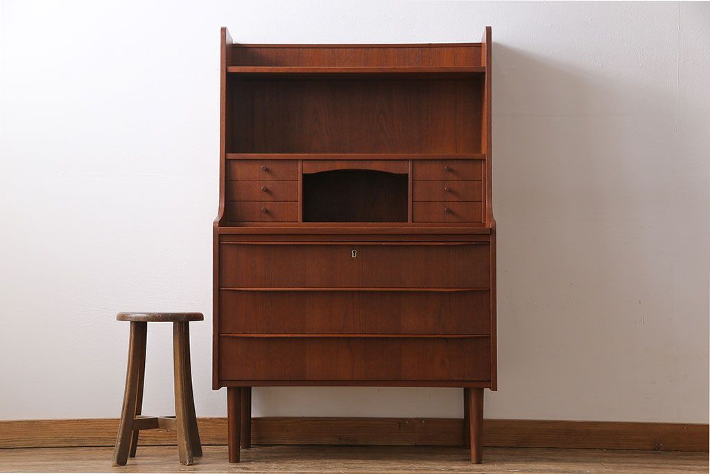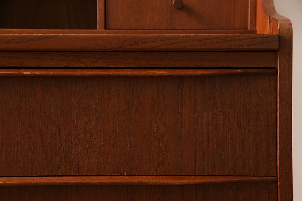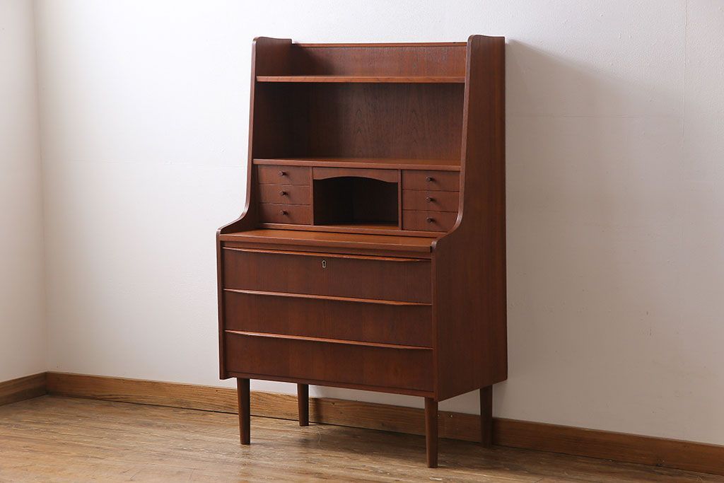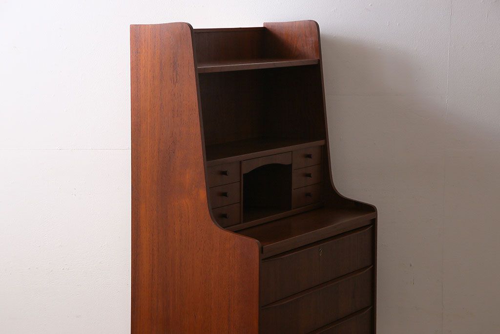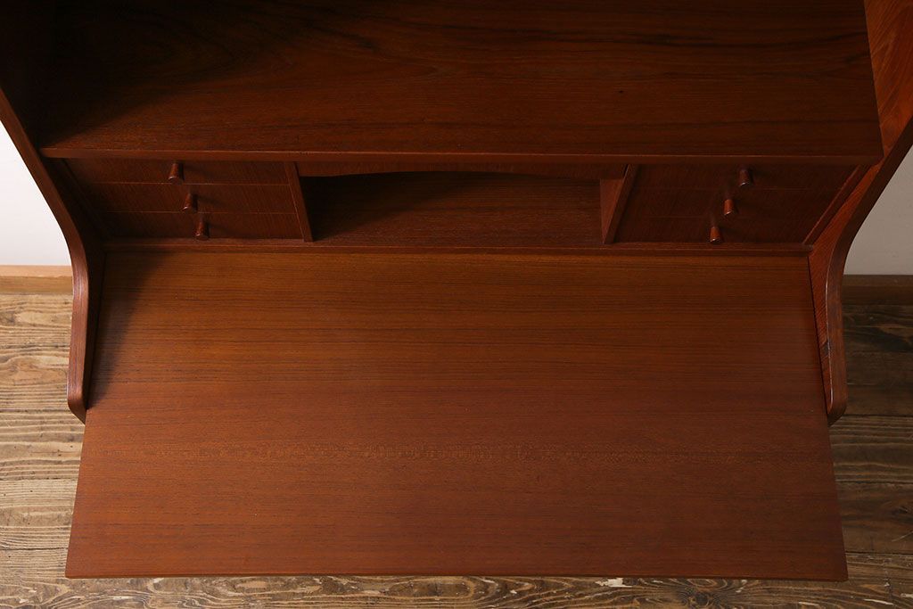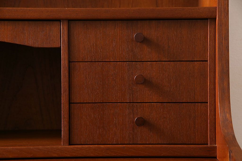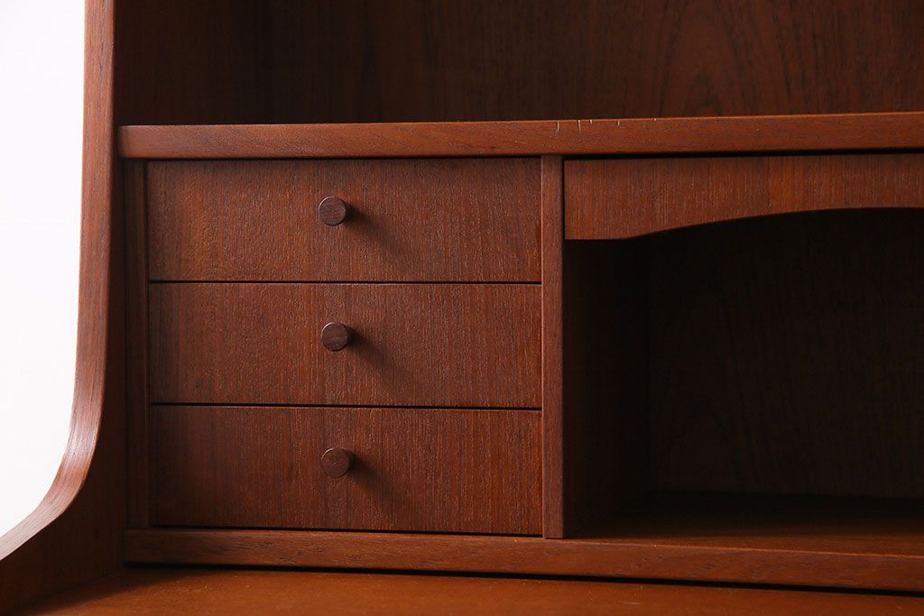 ヴィンテージ家具 北欧ビンテージ デンマーク チーク材 おしゃれで機能的な鏡付きビューロー(デスク、在宅ワーク、在宅用ドレッサー、ドレッシングチェスト、本棚)