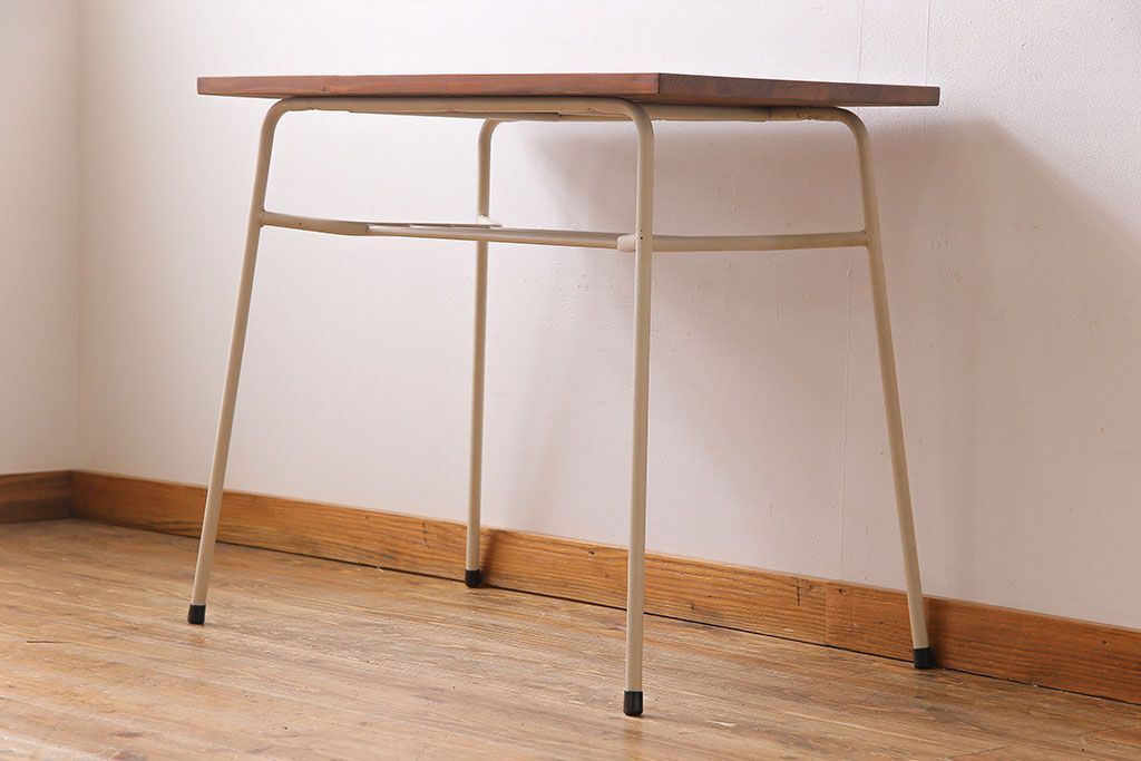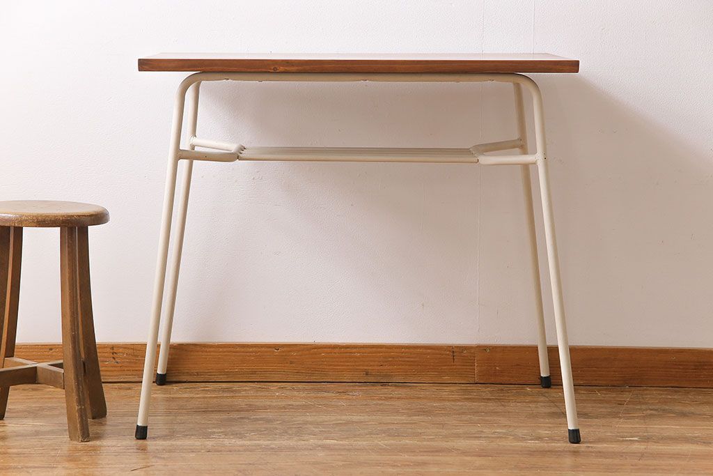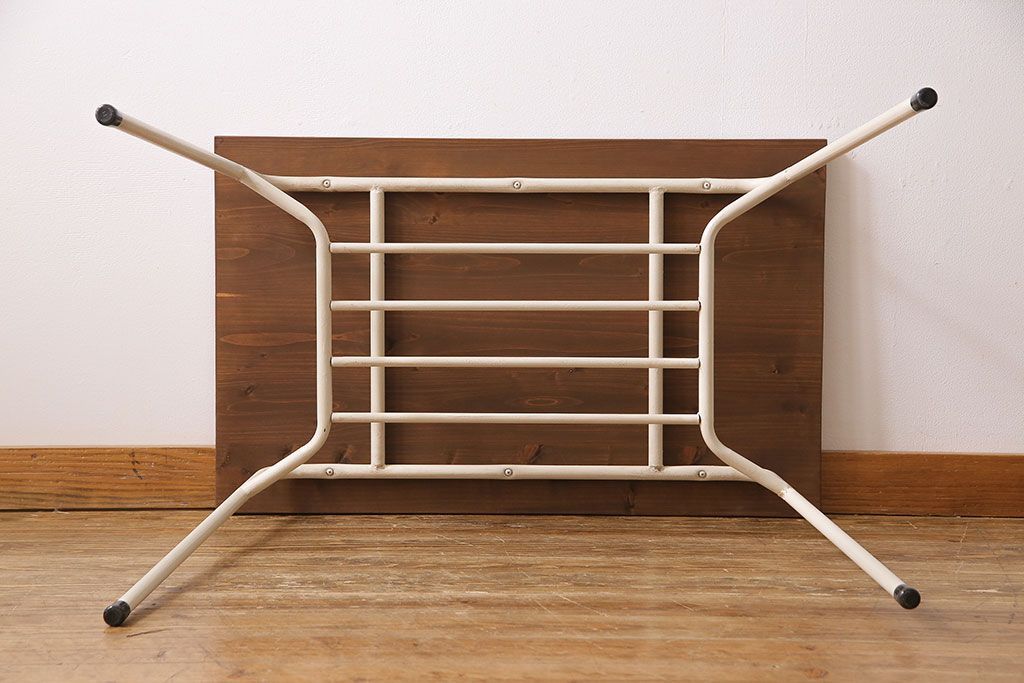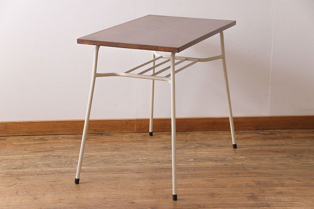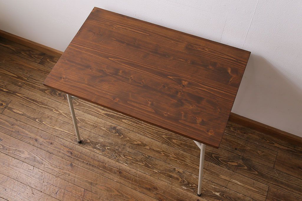 アンティーク家具 ヒノキ材製天板 ペイントがおしゃれなアイアンテーブル(作業台、カフェテーブル)(3)