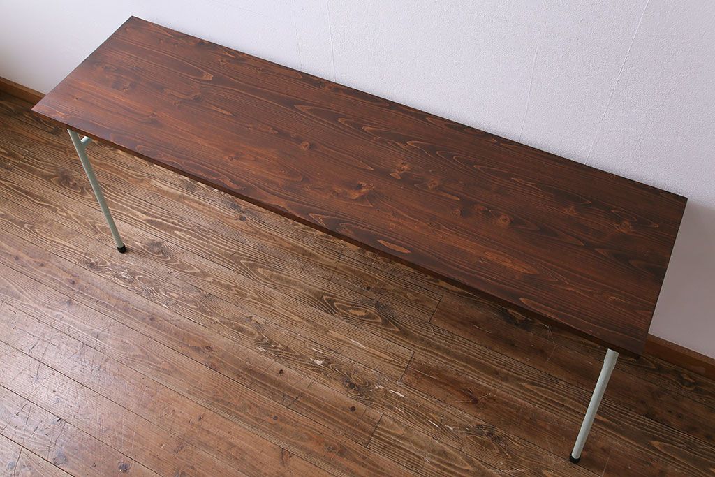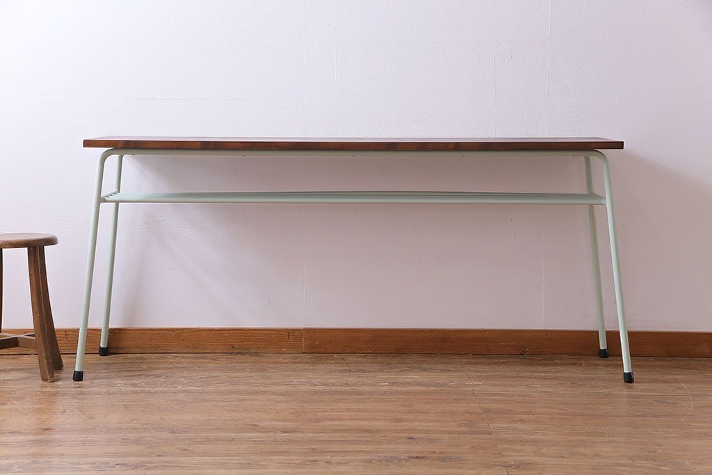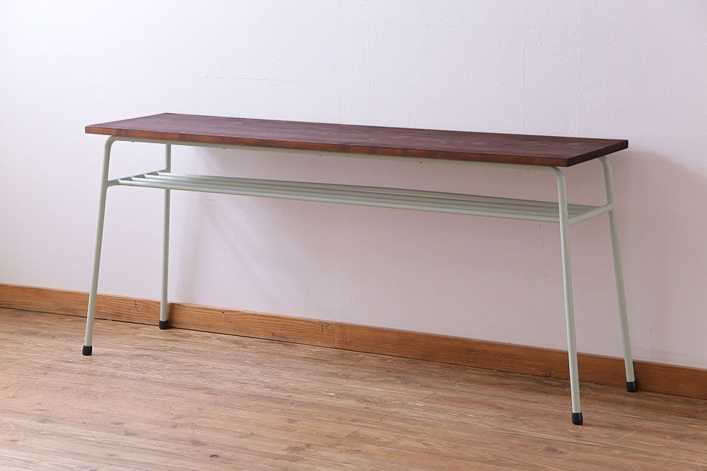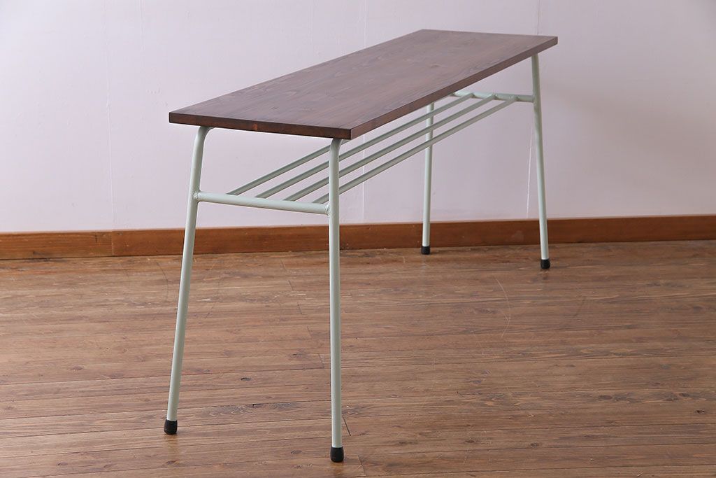 ラフジュ工房> テーブル> コンソールテーブル > アンティーク家具 ヒノキ無垢材 淡いカラーのペイント鉄脚テーブル(作業台、カウンターテーブル)(2)