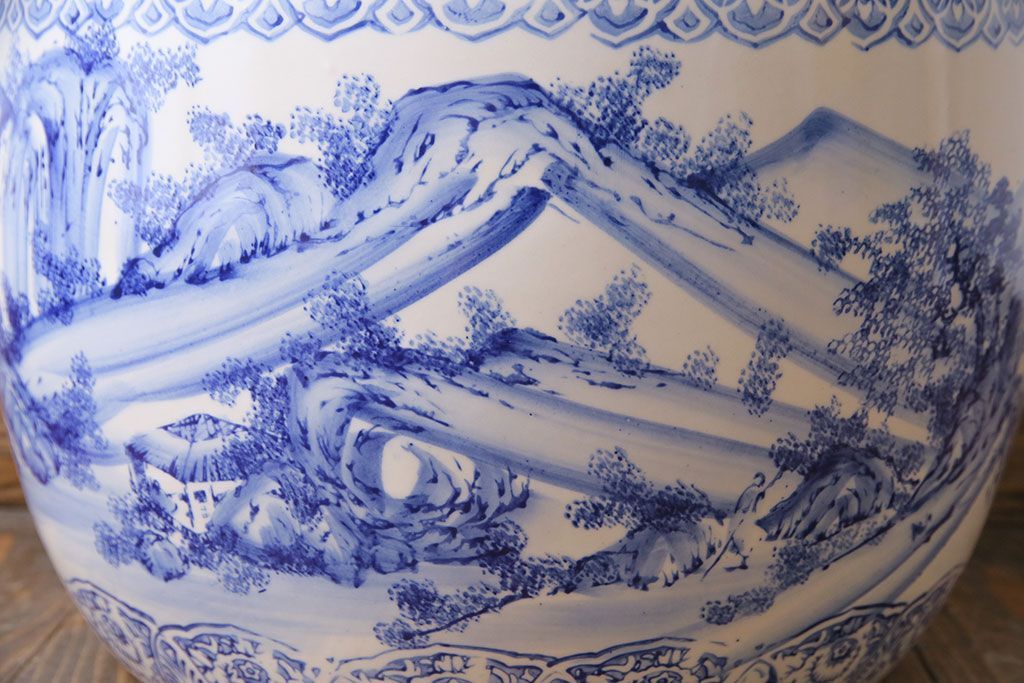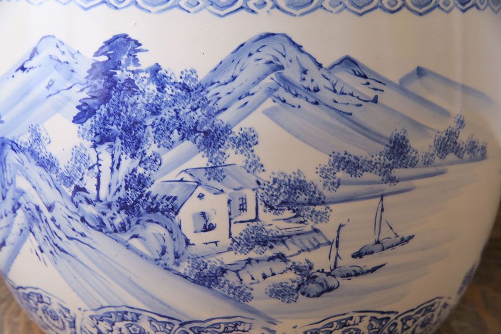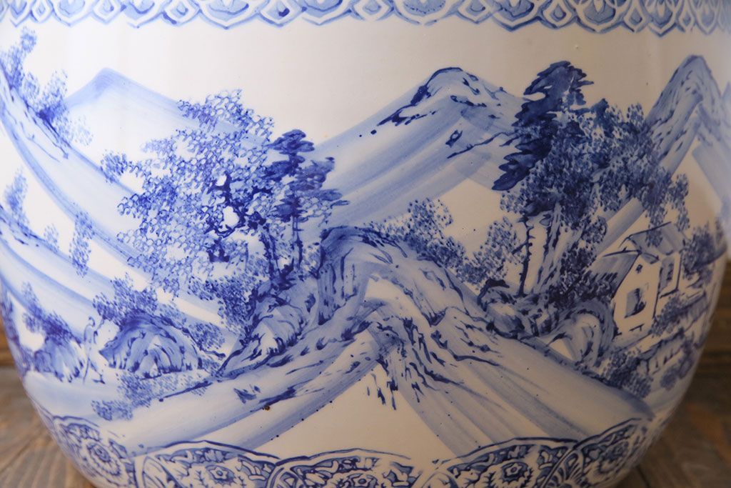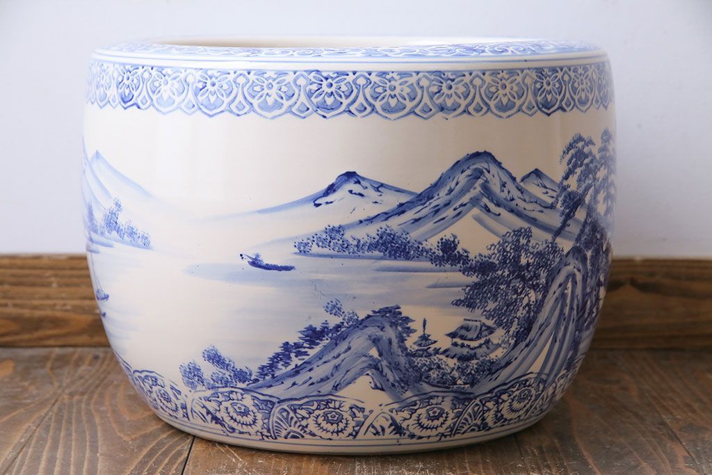 火鉢> 瀬戸火鉢 > アンティーク雑貨 常滑焼 山水図 どこか洋風の雰囲気を漂わせる瀬戸火鉢(鉢カバー)