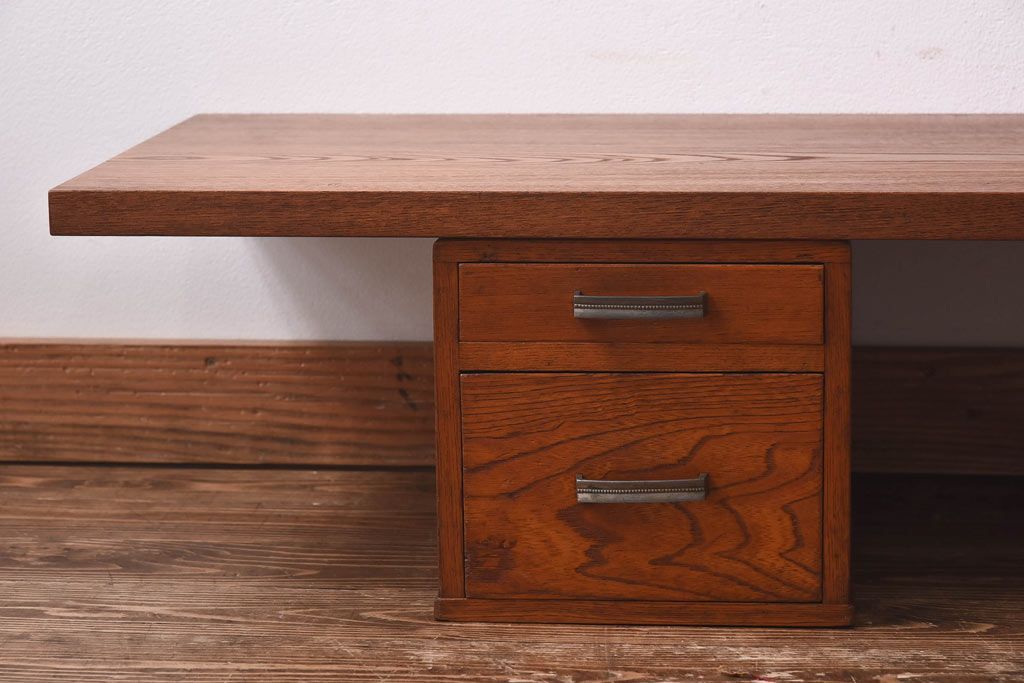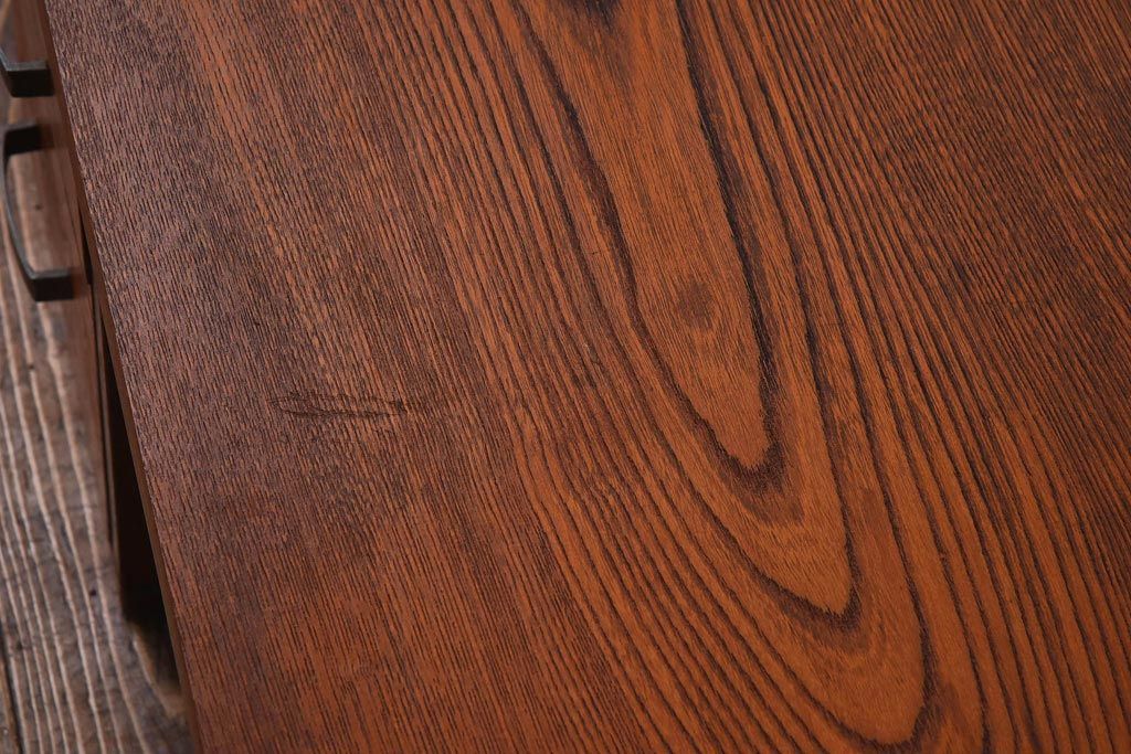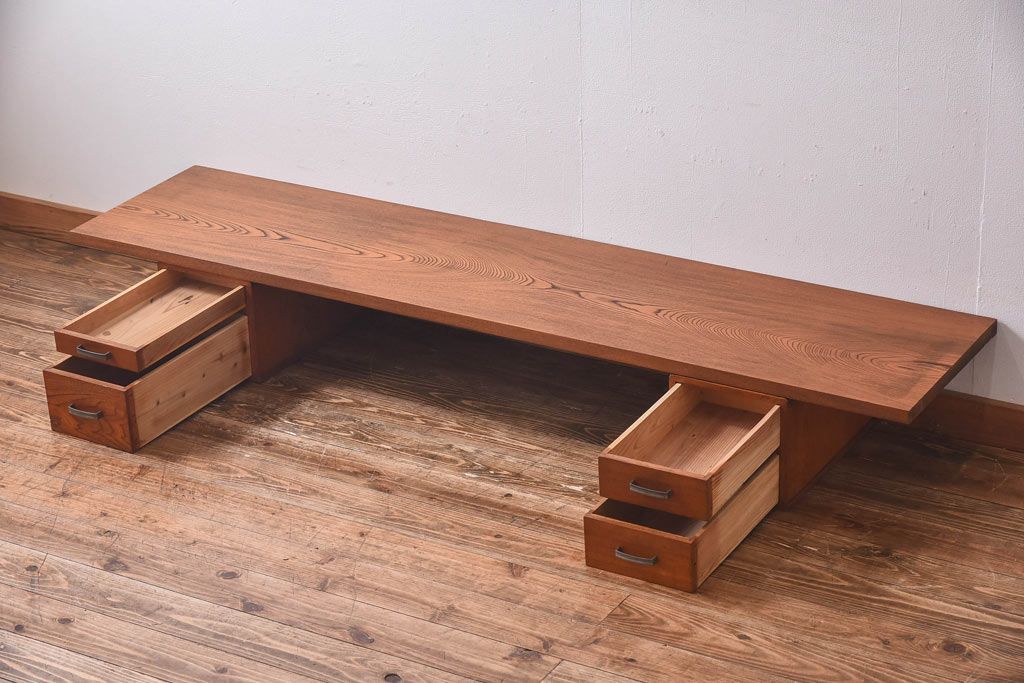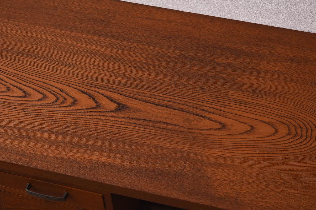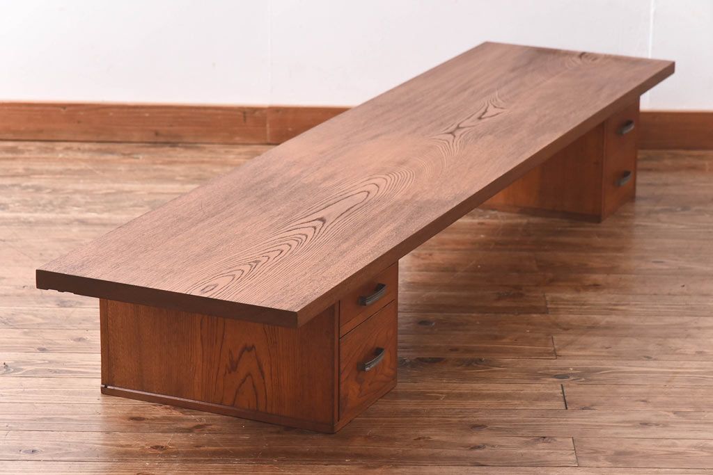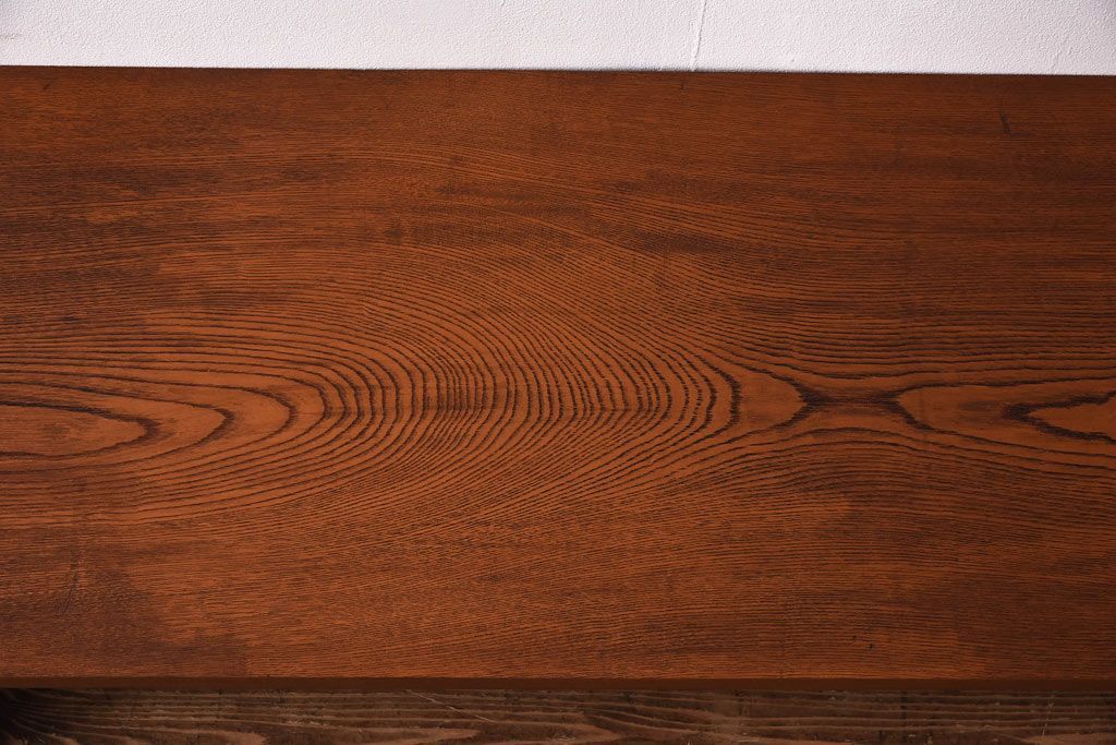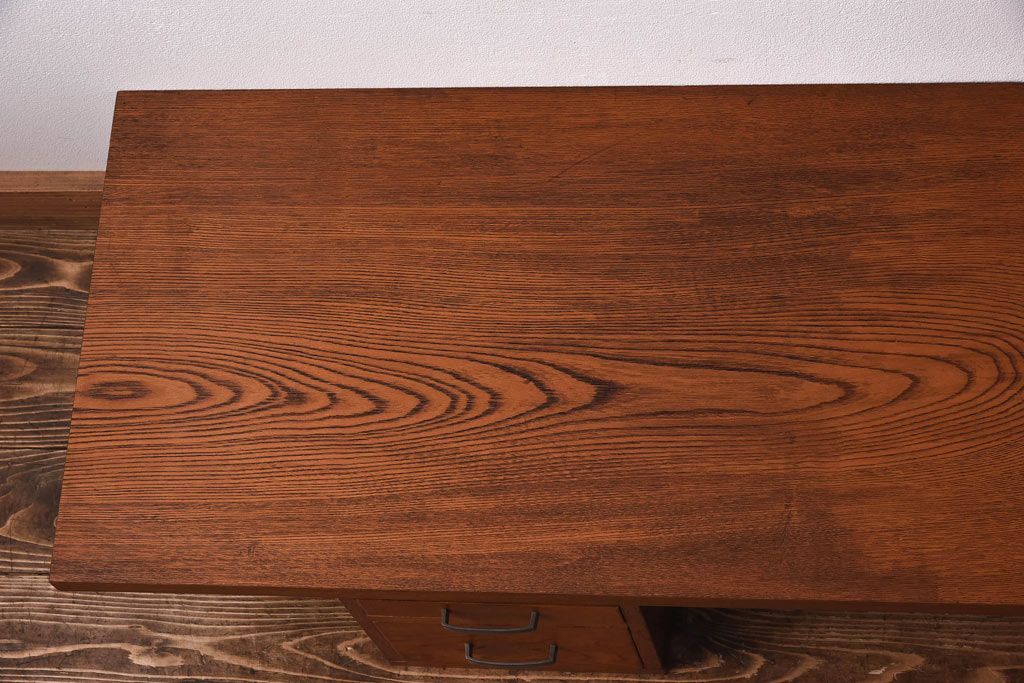 アンティーク雑貨 天板一枚板 小引き出し付き ケヤキの木目が美しい裁ち板(作業台、ローボード)
