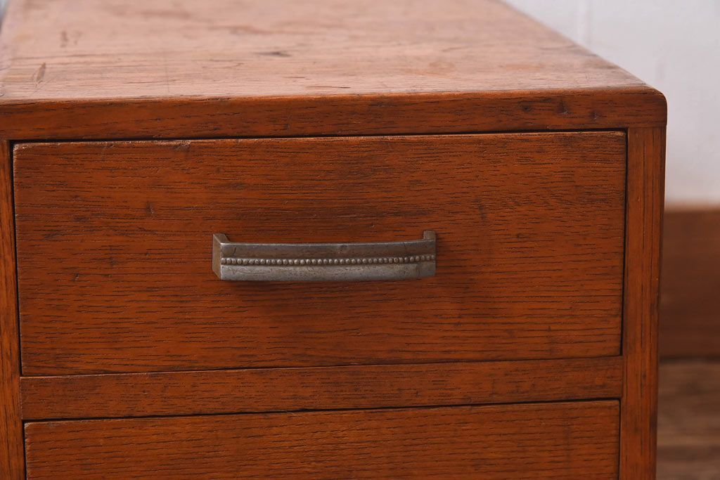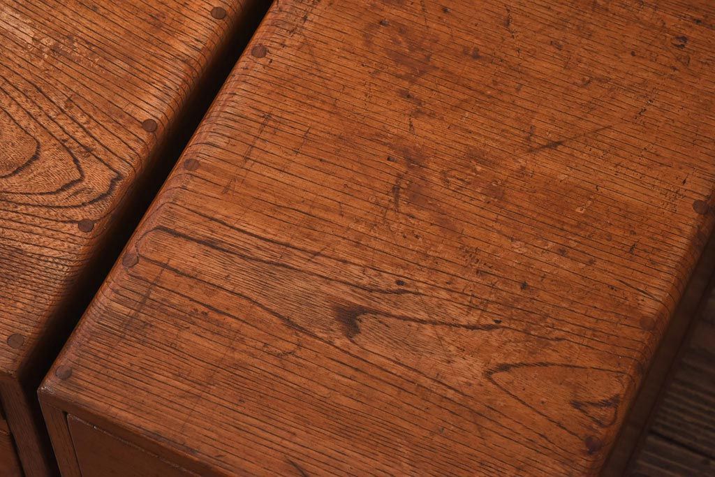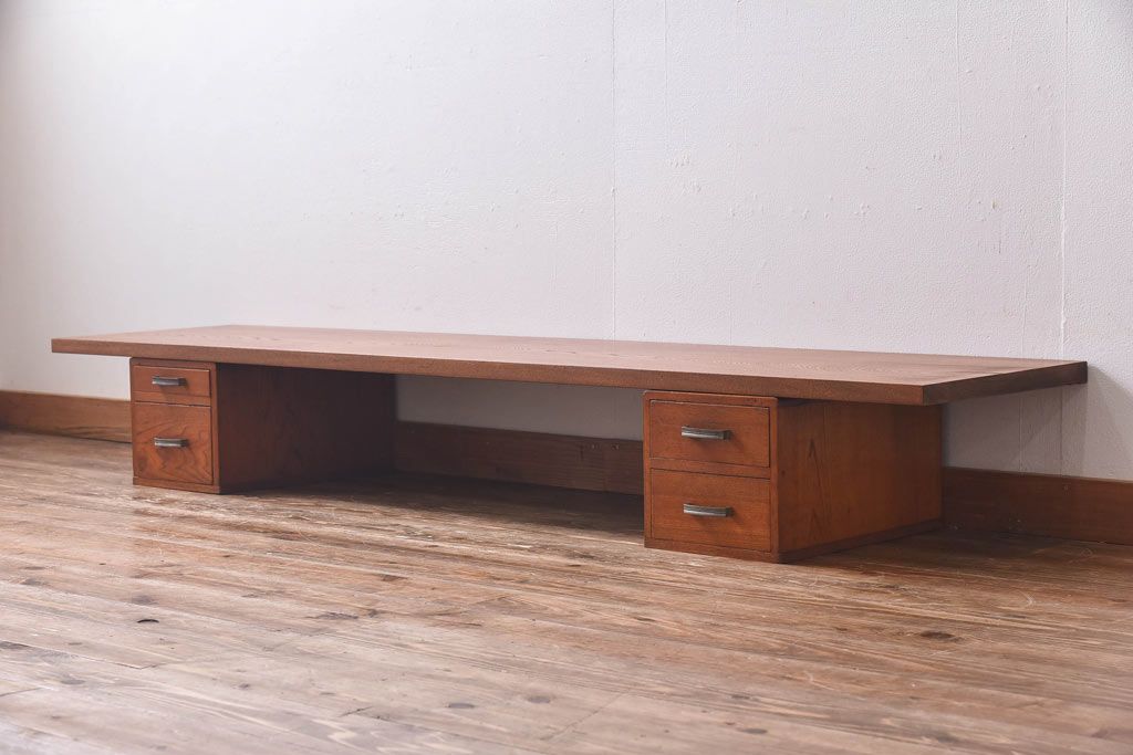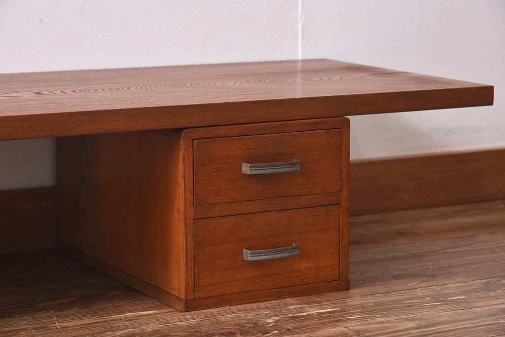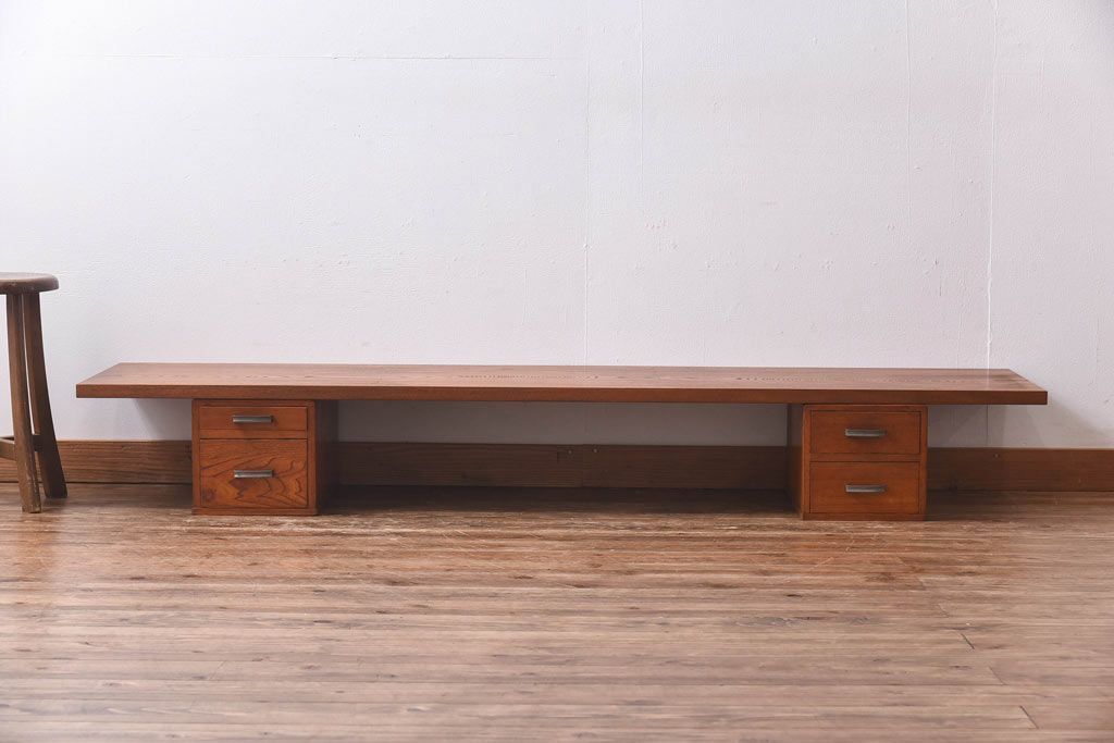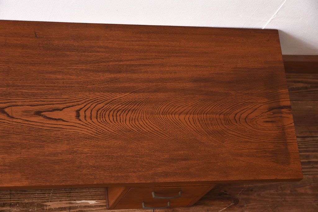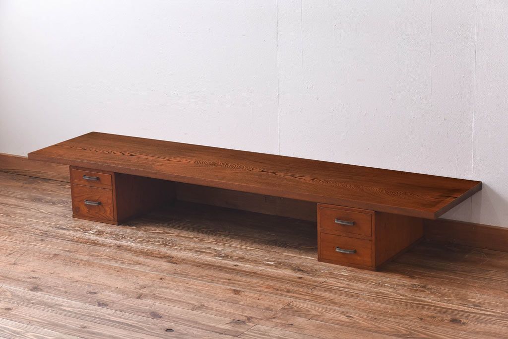 アンティーク雑貨 天板一枚板 小引き出し付き ケヤキの木目が美しい裁ち板(作業台、ローボード)