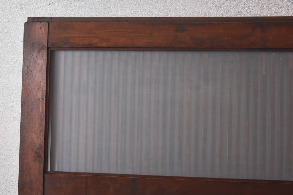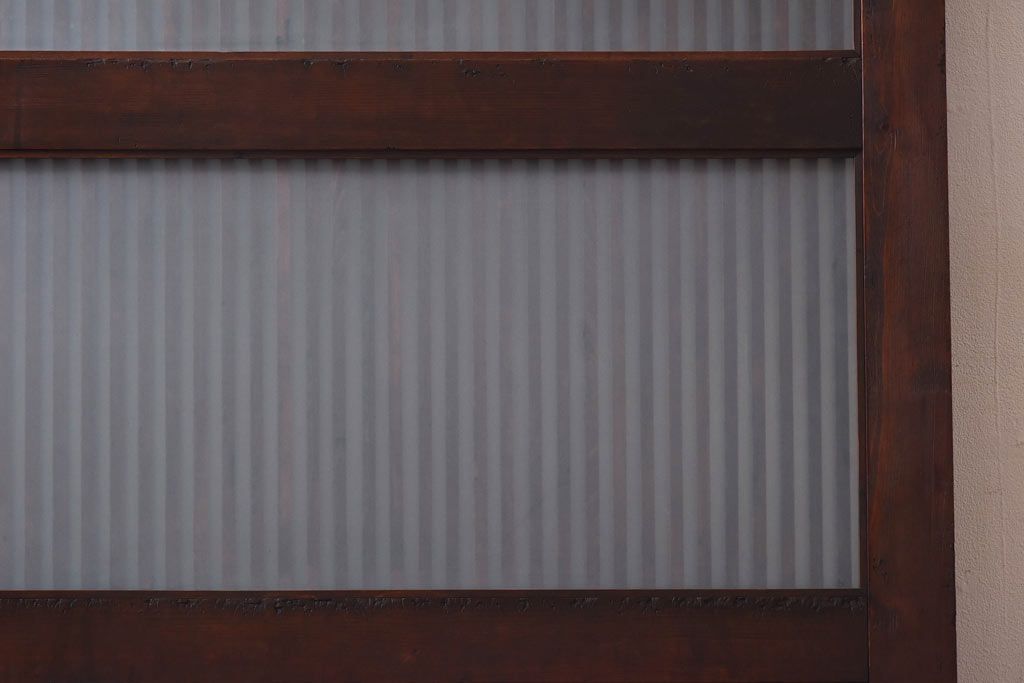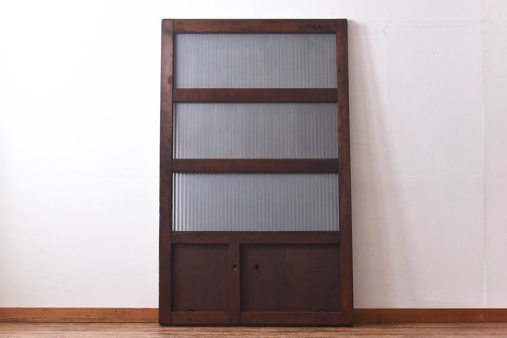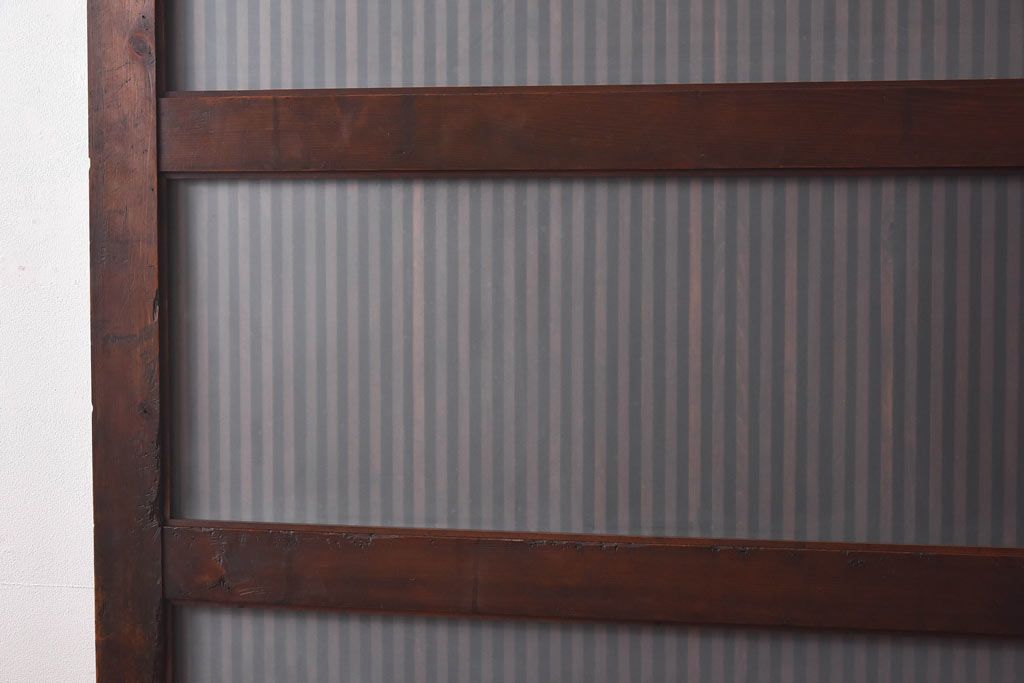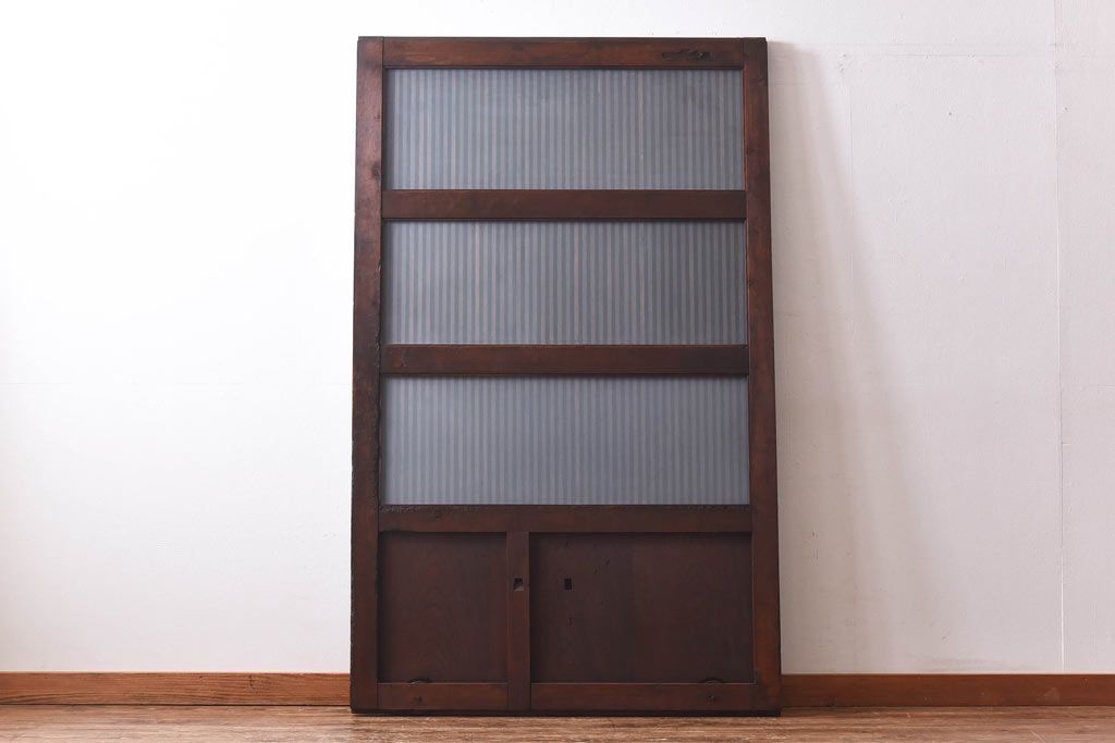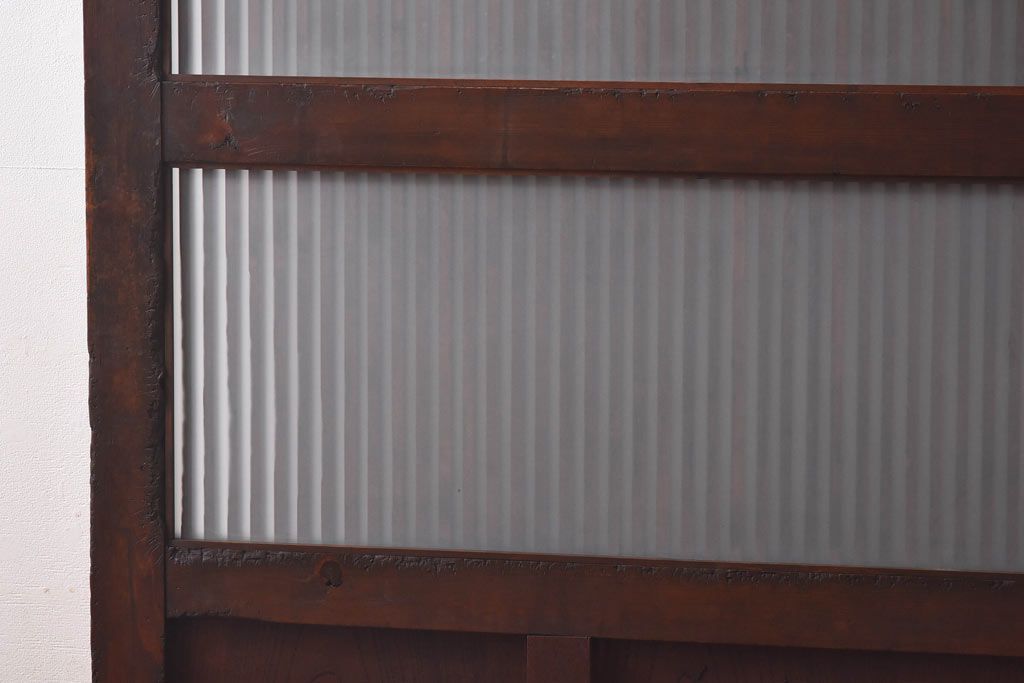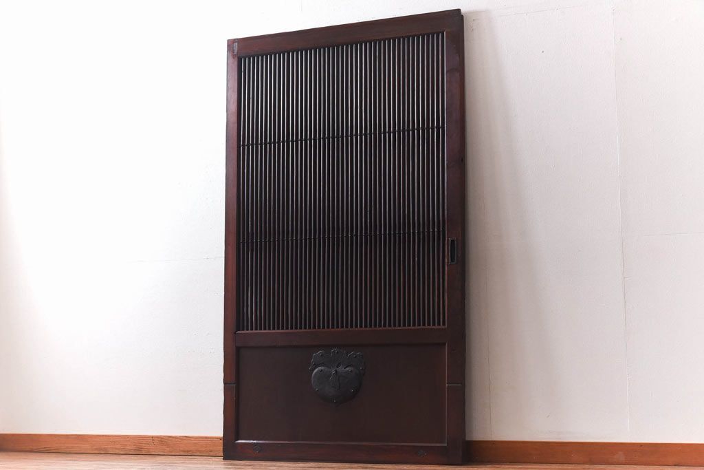 ラフジュ工房> 衝立・パーテーション > 和製アンティーク ヒノキ材 漆塗り 金具の細工が美しいガラス入り蔵戸(ガラス引き戸、格子戸、建具、玄関戸)